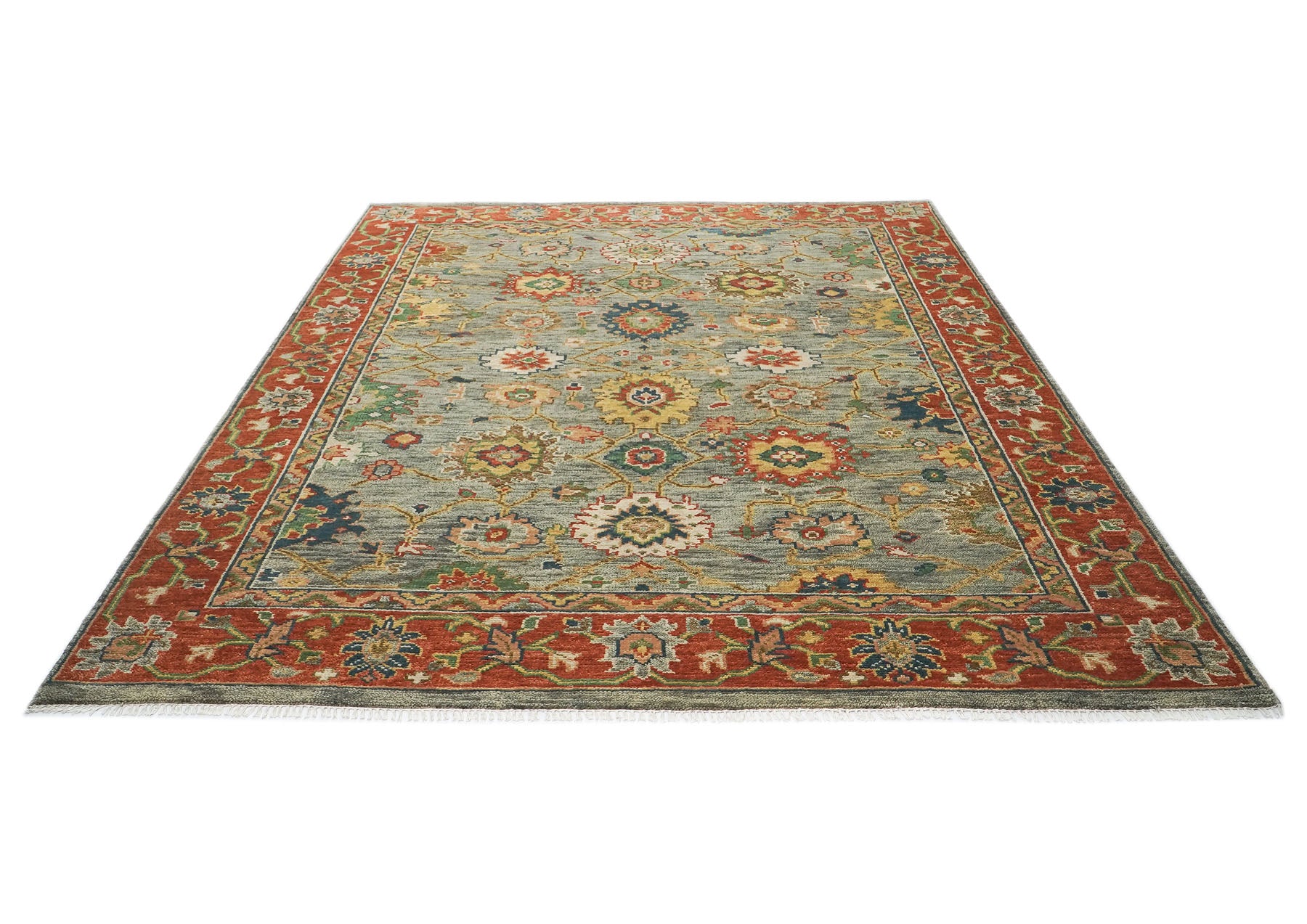 Soft sage gray provides a tranquil backdrop for this stunning hand-knotted wool creation that celebrates the Arts and Crafts movement's reverence for natural beauty, honest materials, and the joyful abundance of handcrafted pattern. A delightful scatter of geometric floral medallions in coral, gold, navy, and lime dances across the field with charming spontaneity, each blossom rendered with folk-art precision while delicate meandering vines connect the composition into an organic whole that feels structured and wonderfully alive. The warm terracotta border, enriched with classical scrolling motifs and botanical elements in complementary tones, frames the serene interior with earthy contrast and visual weight, creating a harmonious dialogue between cool and warm hues. Meticulously hand-knotted by skilled artisans using premium wool on a cotton foundation, this piece embodies the movement's core philosophy that functional objects should be works of art in their own right, offering not only exceptional durability and plush comfort underfoot but also the subtle color variations and handmade irregularities that give each rug its distinctive personality. The sophisticated color palette creates a foundation of versatile elegance that enhances any aesthetic from traditional to contemporary, bringing warmth, cultural authenticity, and the kind of enduring beauty that transforms a space into a thoughtfully curated space of style and substance.