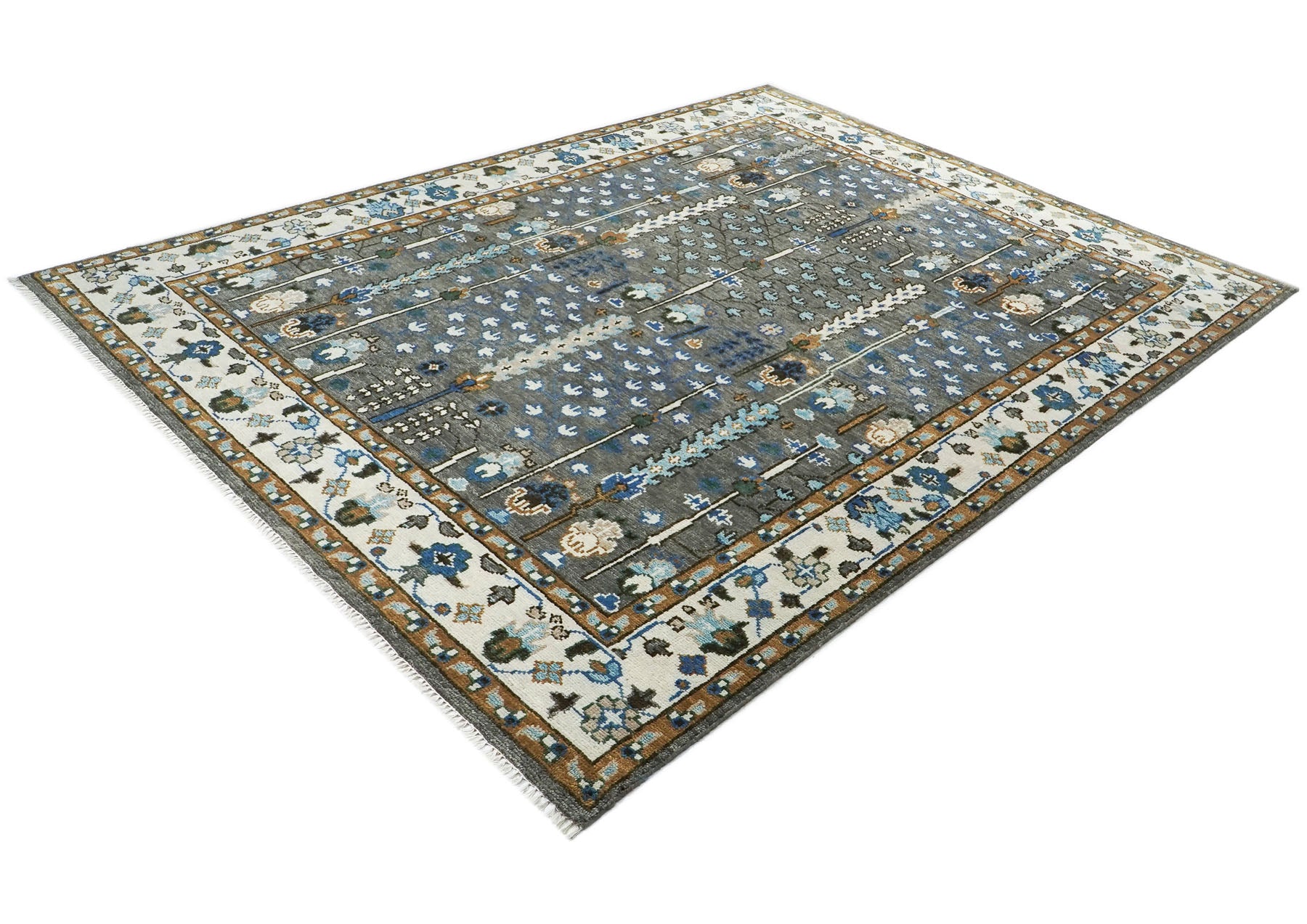 Enchanting with its distinctive tree-of-life motif and folkloric charm, this hand-knotted Oushak rug presents a captivating transitional design that feels both timeless and refreshingly contemporary. The atmospheric gray field, beautifully washed with subtle blue undertones, showcases a symmetrical garden scene where stylized cypress trees rise vertically alongside scattered floral blooms and delicate botanical elements in ivory, sky blue, and gold. Each tree is adorned with whimsical bird motifs and abstract florals that create a sense of movement and organic life, while horizontal bands of geometric patterns add structure and rhythm to the rectangular composition. The generous ivory border features charming folk art-inspired motifs including stylized flowers and geometric forms in blue, tan, and gold that perfectly complement the field's narrative quality without overwhelming its serene presence. Master weavers have devoted exceptional skill to hand-knotting premium wool onto a cotton foundation, creating subtle color variations and authentic abrash that give this piece genuine character and depth impossible to achieve through mechanical production. The sophisticated gray-blue palette anchored by warm gold and ivory accents delivers remarkable versatility, effortlessly enhancing a diverse range of interiors. Its plush wool construction promises luxurious comfort and enduring beauty, designed to withstand daily life while developing an increasingly distinguished patina that only enhances its artisanal appeal.