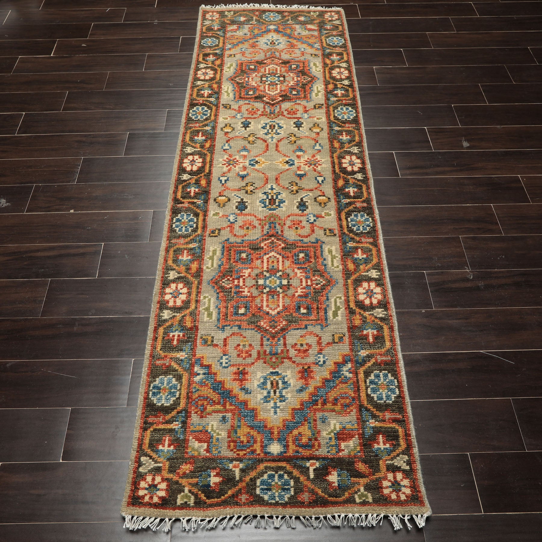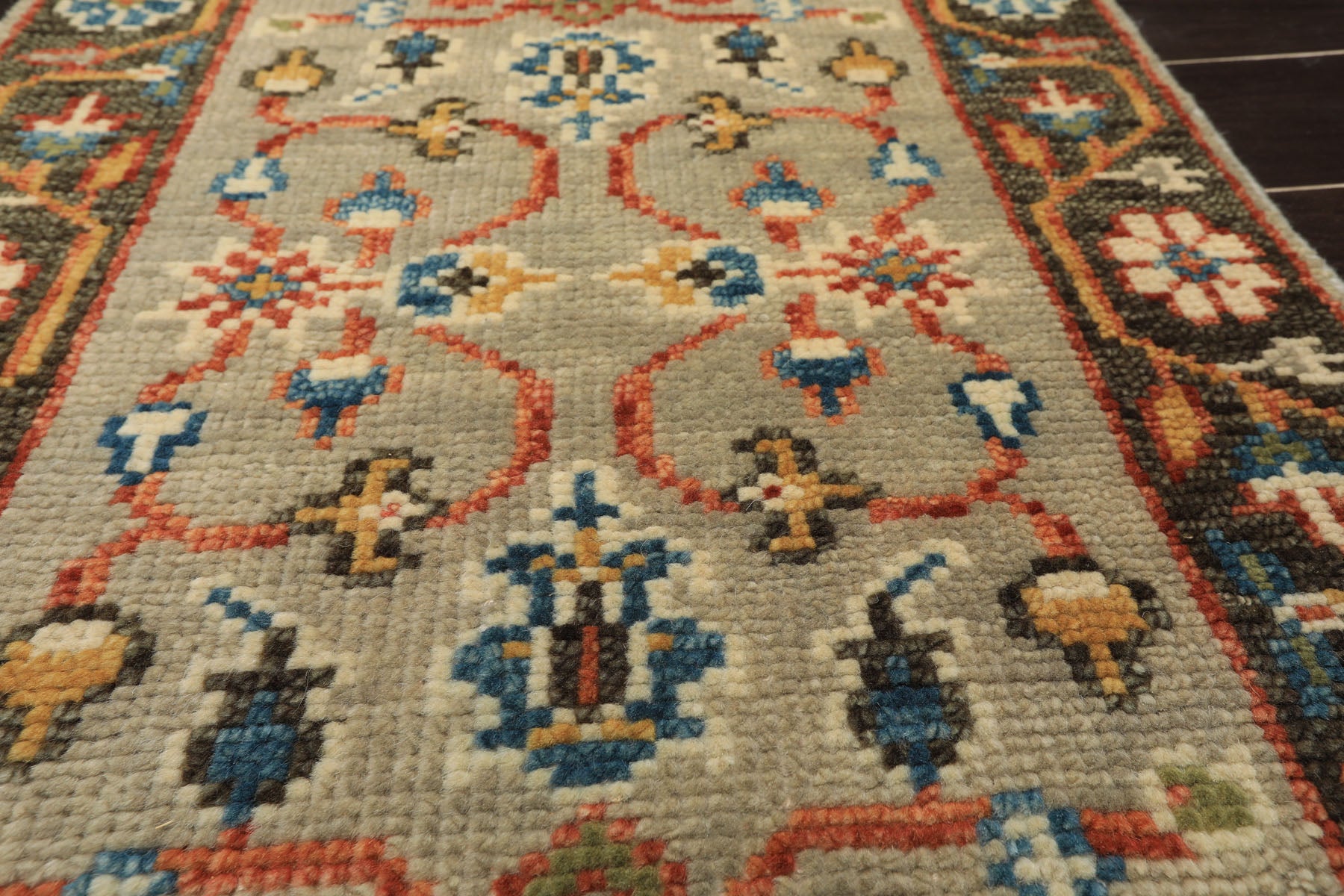 Steeped in the weaving traditions of Turkey's historic Oushak region, this hand-knotted wool runner brings centuries of artisanal expertise into contemporary living with effortless grace. The refreshing mint green foundation creates a serene backdrop for the bold geometric medallions that define traditional Oushak design, while burnt orange, gold, ivory, and aqua accents introduce warmth and dimensional contrast that energizes the pattern. Skilled artisans meticulously hand-knotted each knot on a resilient cotton foundation, employing time-honored techniques that ensure exceptional durability that distinguish authentic craftsmanship from machine-made reproductions. The harmonious multi-toned palette offers remarkable adaptability while the intricate medallion motifs provide visual interest that draws the eye along the runner's length, creating natural focal points that enhance rather than overwhelm your aesthetic. Natural wool fibers deliver luxurious softness underfoot and develop a beautiful patina over years of use, deepening the character and authenticity of this