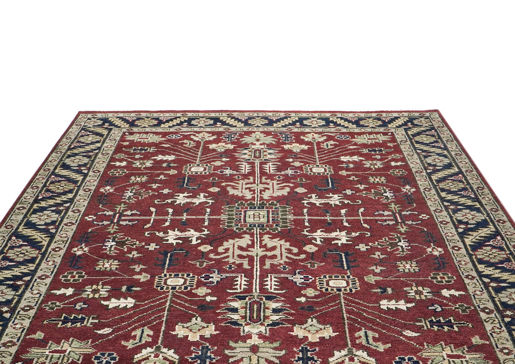 Celebrating the bold geometry and symbolic richness of traditional Oushak weaving, this hand-knotted wool masterpiece commands attention with its striking rust red field populated by an intricate arrangement of tribal motifs and ancestral symbols. The rectangular design features a powerful vertical axis crowned by a central medallion, from which stylized tree-of-life patterns and geometric ornaments radiate with perfect bilateral symmetry, creating a composition that feels both ancient and remarkably fresh. Framed by a deep navy border featuring distinctive zigzag patterns and floral rosettes in beige and gold, the contrasting frame provides dramatic definition that amplifies the visual impact of the richly detailed interior. Skilled artisans have devoted countless hours to hand-knotting premium wool onto a durable cotton foundation, ensuring every symbolic motif and geometric element is rendered with the precision and authenticity that distinguishes true handcrafted artistry. The harmonious palette of rust, navy, and ivory creates timeless appeal that bridges cultural heritage with contemporary design sensibilities, making this piece equally at home in traditional, eclectic, or modern interiors seeking character and depth. Its substantial wool pile delivers plush comfort and exceptional durability, designed to become a treasured artpiece that only grows more beautiful and valuable as it ages gracefully through daily use.