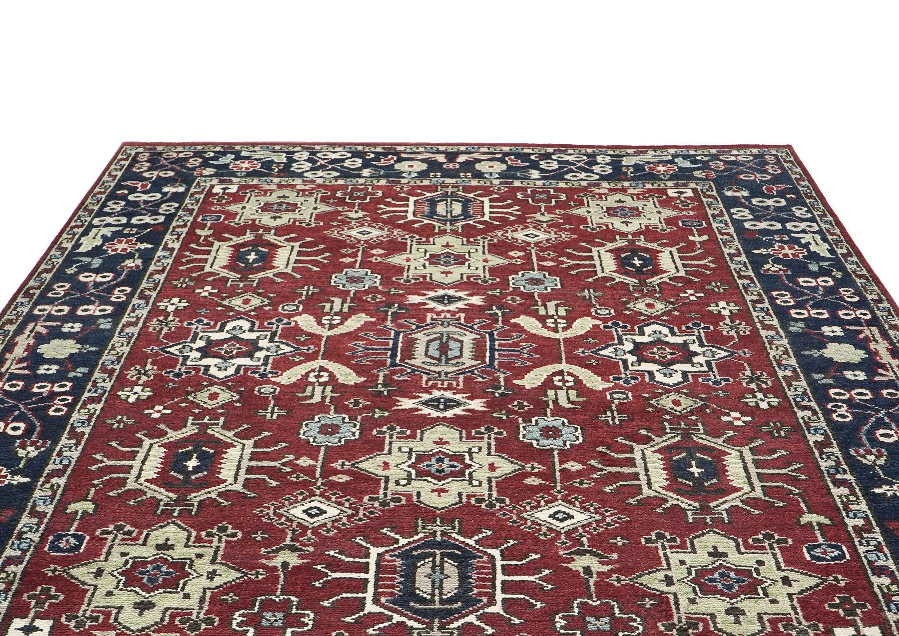 Masterfully blending tribal tradition with refined sophistication, this hand-knotted Oushak rug showcases a captivating transitional design anchored by a rich rust red field alive with symmetrical geometric medallions and ancient symbolic motifs. The rectangular composition features three prominent hexagonal medallions aligned vertically, each filled with intricate tribal patterns in navy, sage, and aqua blue, creating striking focal points that draw the eye through the carefully balanced design. Surrounding these central elements, an array of geometric symbols, stylized florals, and abstract forms populate the field with perfect symmetry, demonstrating the remarkable skill and precision of traditional hand-knotting techniques. The deep navy blue border provides dramatic contrast, adorned with repetitive geometric patterns and floral accents in beige, rust, and sage that create a bold frame worthy of the richly detailed interior. Hand-knotted by master artisans using premium wool on a durable cotton foundation, every knot reflects generations of weaving expertise and cultural heritage, resulting in a piece that honors tradition while remaining thoroughly accessible to contemporary design sensibilities. The warm yet complex palette of rust, navy, and earth tones delivers remarkable versatility, complementing everything from traditional and eclectic interiors to modern spaces seeking authentic character and visual depth. Its substantial wool pile ensures plush comfort and exceptional longevity, designed to become a cherished heirloom that only grows more beautiful and valuable with age.