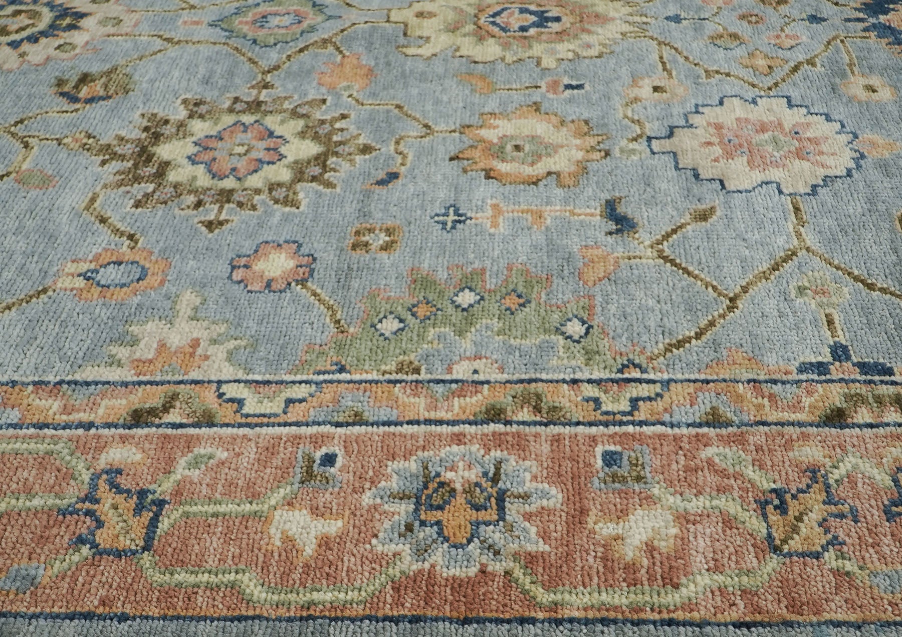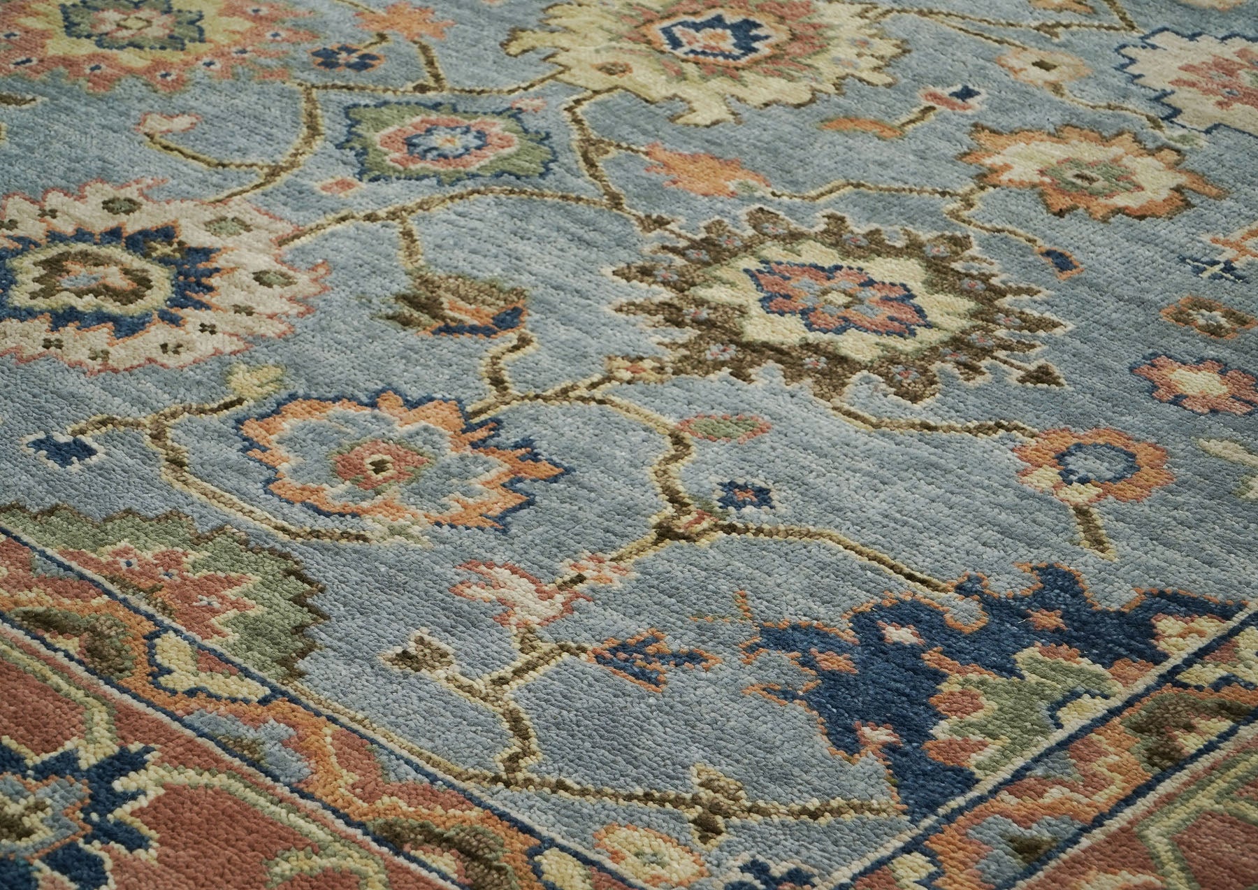 Elegant slate gray provides a serene foundation for this hand-knotted wool masterpiece that embodies the Arts and Crafts philosophy of bringing nature's beauty indoors through thoughtful, human-centered design. Delicate floral medallions in soft peach, navy, lime, and blue seem to float gracefully across the field, connected by meandering vines that create an organic, almost garden-like composition that feels both structured and wonderfully spontaneous. The warm terracotta border, adorned with its own parade of stylized blossoms and geometric motifs, frames the ethereal central field with earthy warmth, creating a sophisticated dialogue between cool and warm tones that brings depth to the overall design. Crafted by skilled artisans who have hand-knotted premium wool onto a sturdy cotton foundation, this piece delivers not only the sumptuous texture and lasting durability expected of traditional craftsmanship, but also the subtle color variations that distinguish genuine handwork from mass production. The harmonious blend of slate, blue, peach, lime, navy, and beige creates a refined yet approachable palette that effortlessly enhances diverse interiors, offering a foundation of quiet beauty and artisanal excellence that transforms any space into a haven of comfort, culture, and understated elegance.