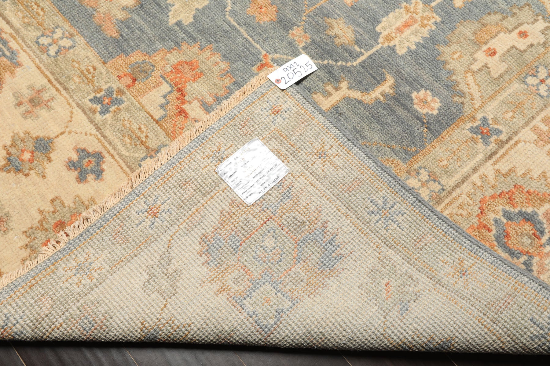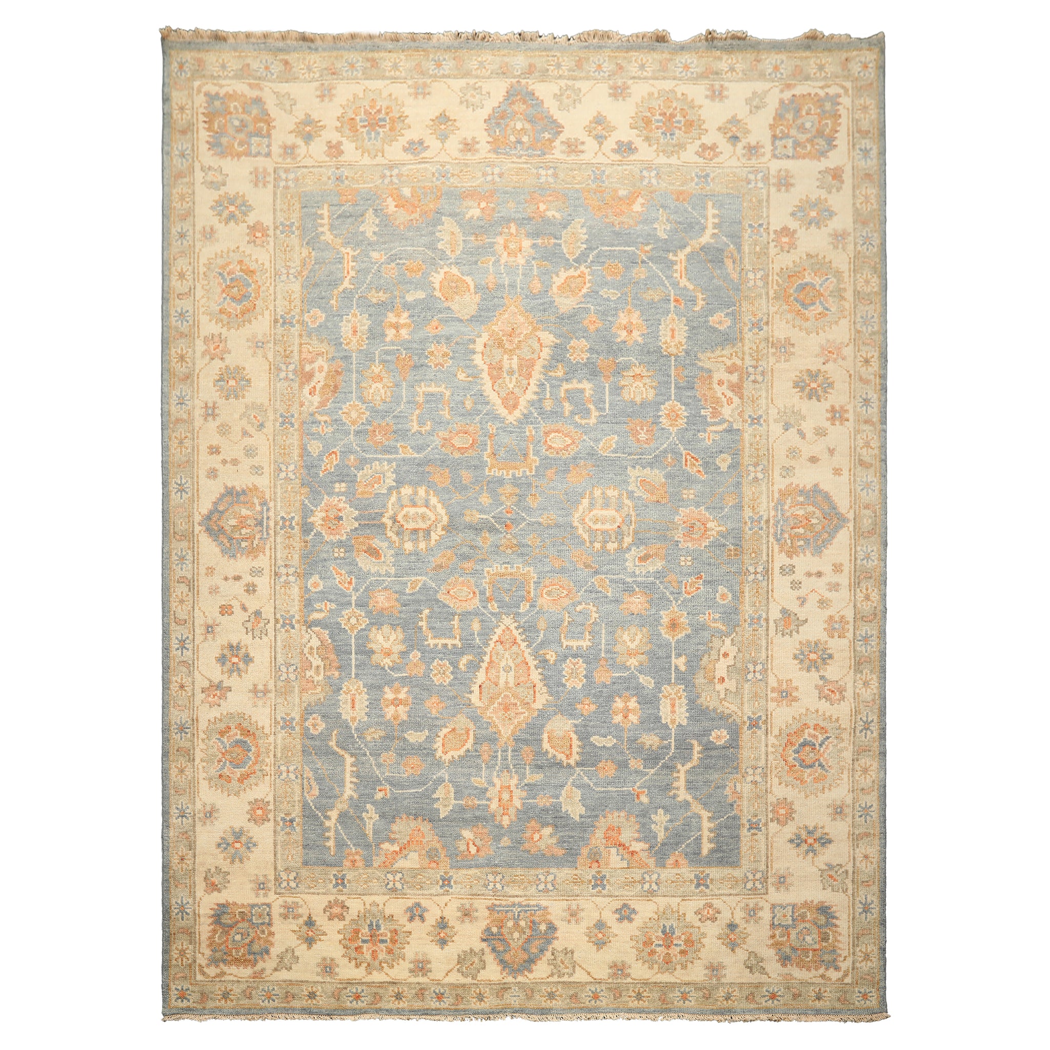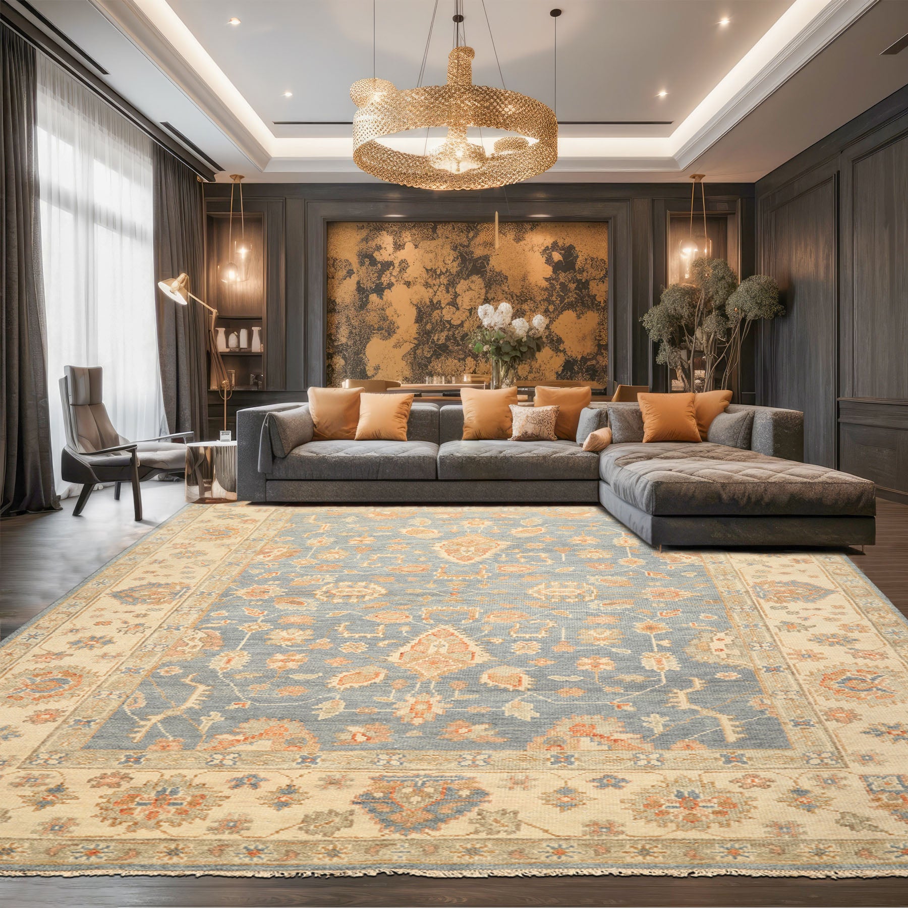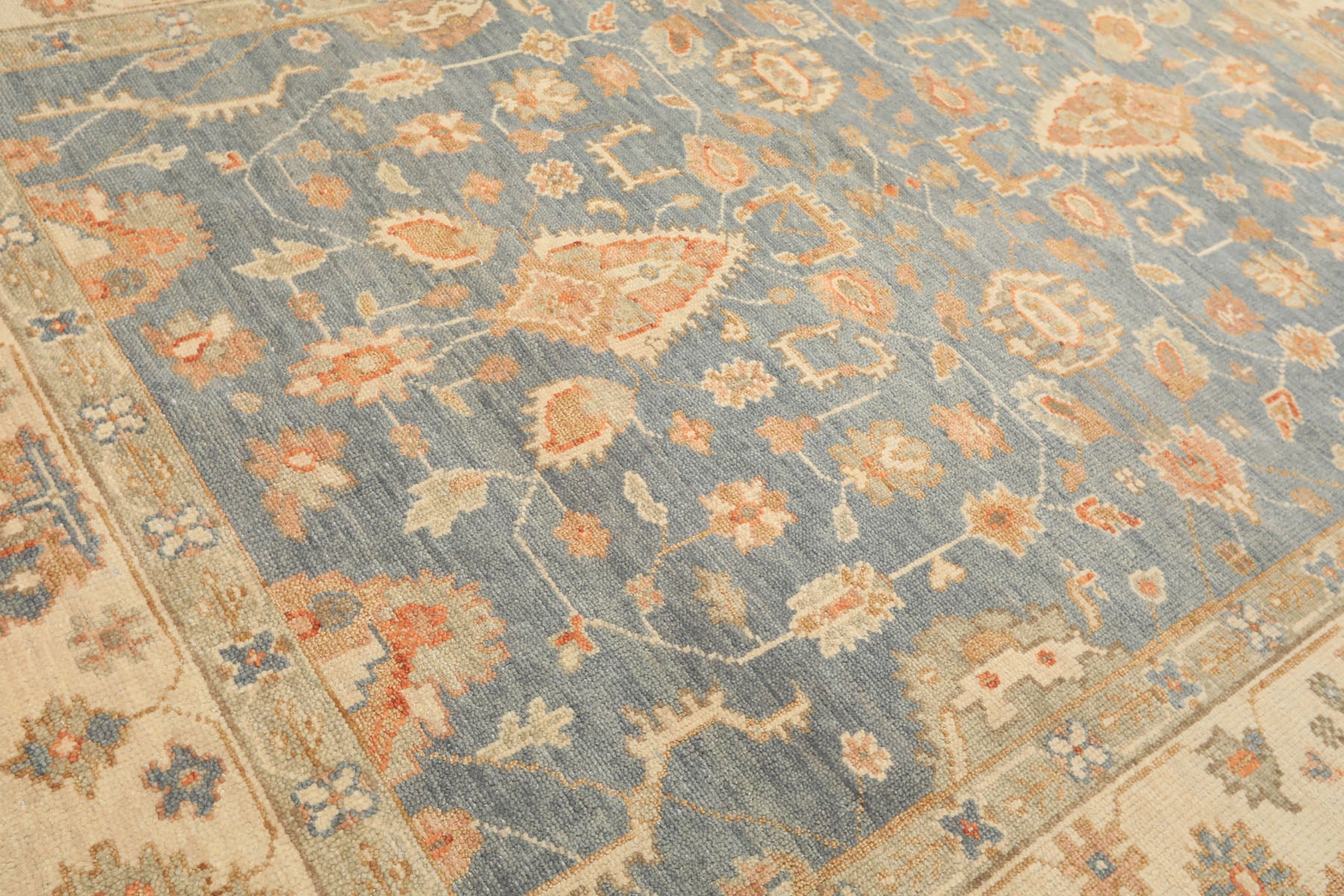Experience the masterful artistry of Tibetan weaving tradition reimagined with modern sensibility in this breathtaking 9x12 hand-knotted rug that seamlessly bridges classical design and contemporary elegance. The soft powder blue rug field showcases an all-over pattern of graceful palmettes, flowering vines, and stylized botanical motifs in warm beige, soft gold, taupe, and aqua tones, creating a harmonious composition that feels both timeless and refreshingly current. The design draws inspiration from traditional Persian and Oushak patterns but interprets them with a lighter touch and more open spacing that gives the rug an airy, sophisticated quality perfect for modern interiors. A generous beige border frames the rug’s composition beautifully, featuring its own complementary arrangement of medallions, rosettes, and delicate floral elements that add an overall sense of refinement and balance. Multiple guard borders in coordinating colors provide elegant layering and visual depth that enhances the rug's traditional craftsmanship while keeping the aesthetic clean and contemporary. Expertly hand-knotted with 100% wool cut pile on a cotton foundation, this rug delivers exceptional softness, durability, and the subtle color variations that only hand-dyeing can achieve.