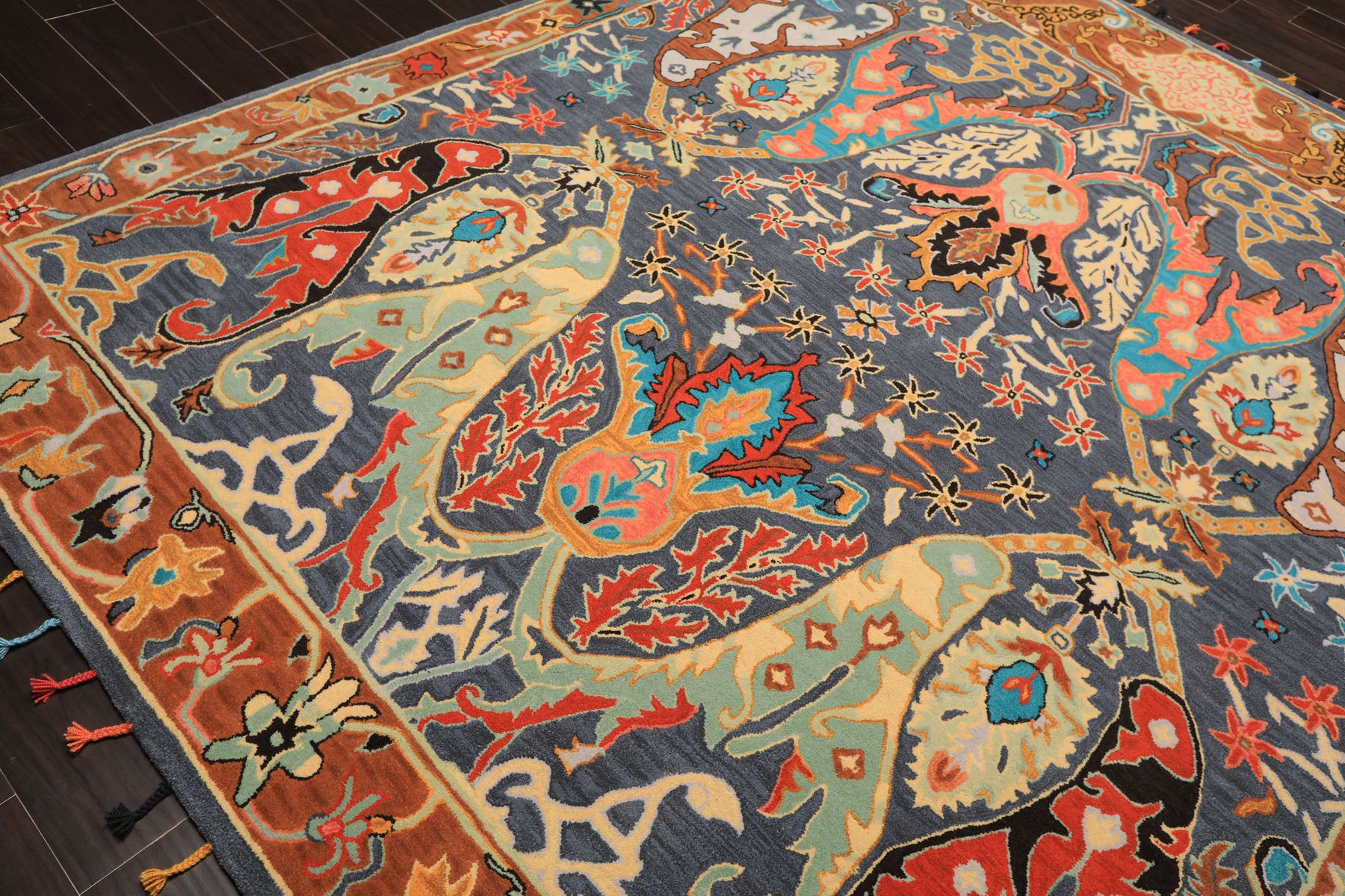 Drawing from the free-spirited essence of bohemian design and the artisanal principles of the Arts & Crafts movement, this hand-tufted wool rug showcases a captivating blue field alive with bold geometric medallions and ornamental motifs in caramel, coral, and turquoise. The masterful composition celebrates the maker's hand with its rich tapestry of orange, gold, aqua, and black interwoven throughout intricate patterns that feel both vintage-inspired and refreshingly contemporary. The warm caramel-brown border, detailed with vibrant floral and geometric patterns, frames the design with bohemian exuberance while tying together the rug's multi-colored vibrancy. Playful tassels in coordinating hues add a finishing artisan touch that speaks to the handmade nature of this exceptional piece. Make this Arts & Crafts bohemian treasure the centerpiece of your interior for a space that truly reflects individuality and enduring crafted beauty.