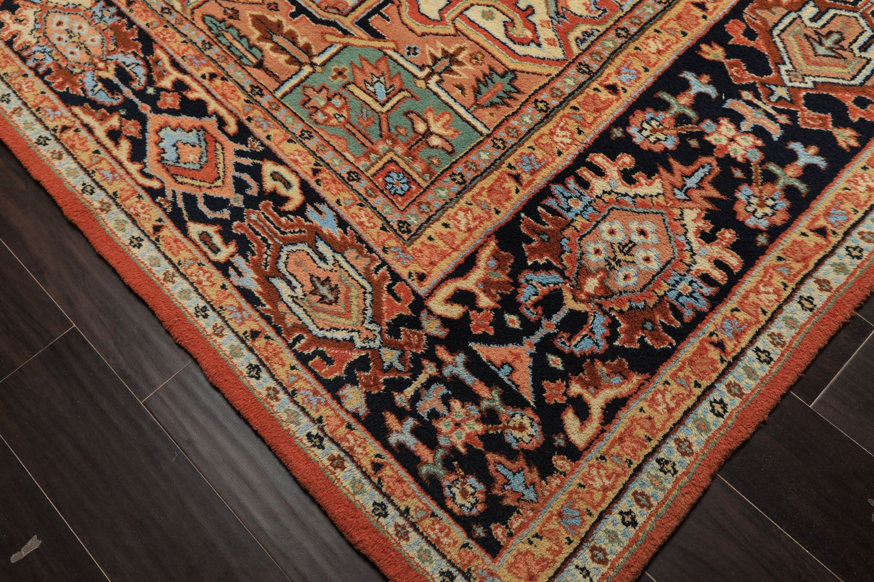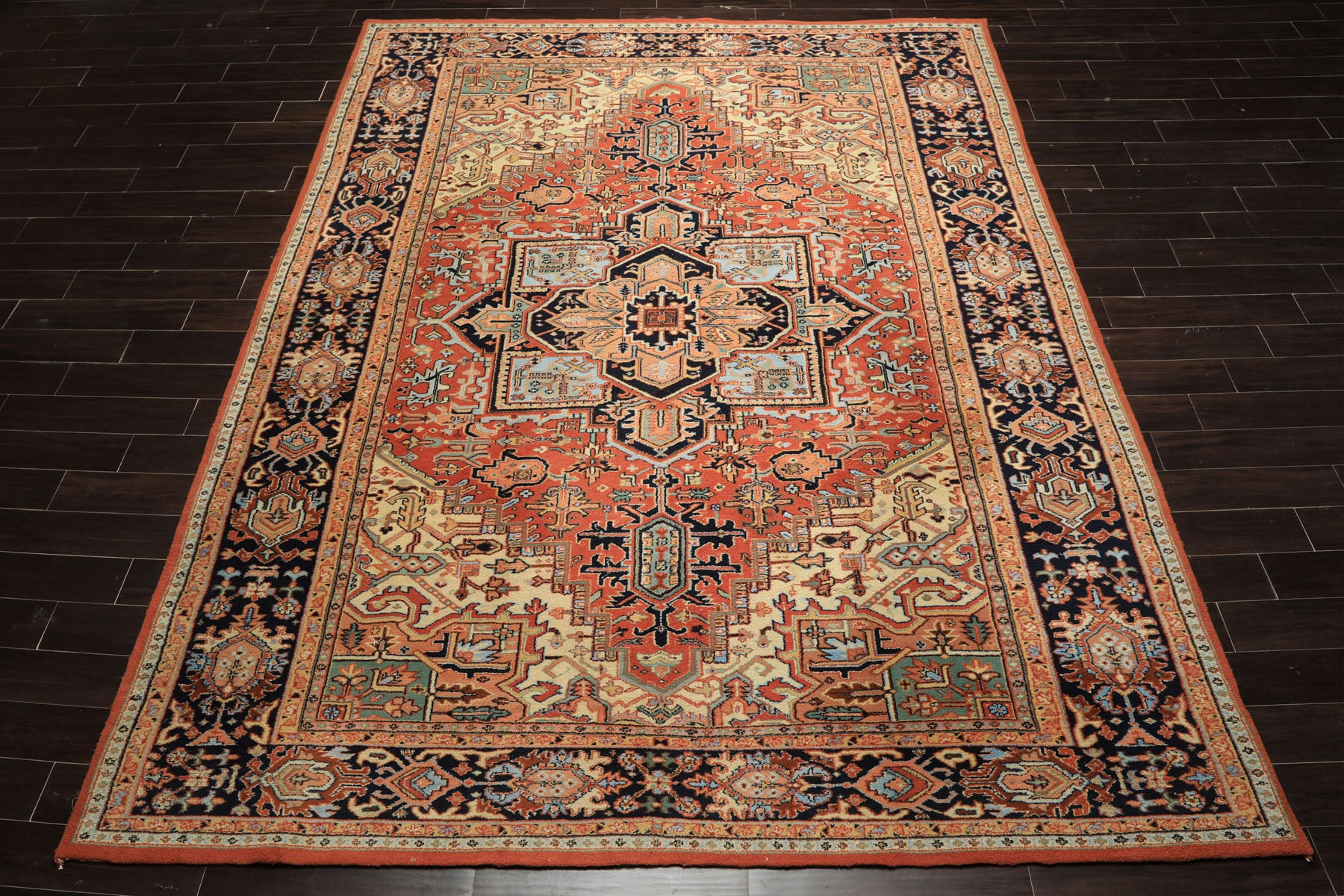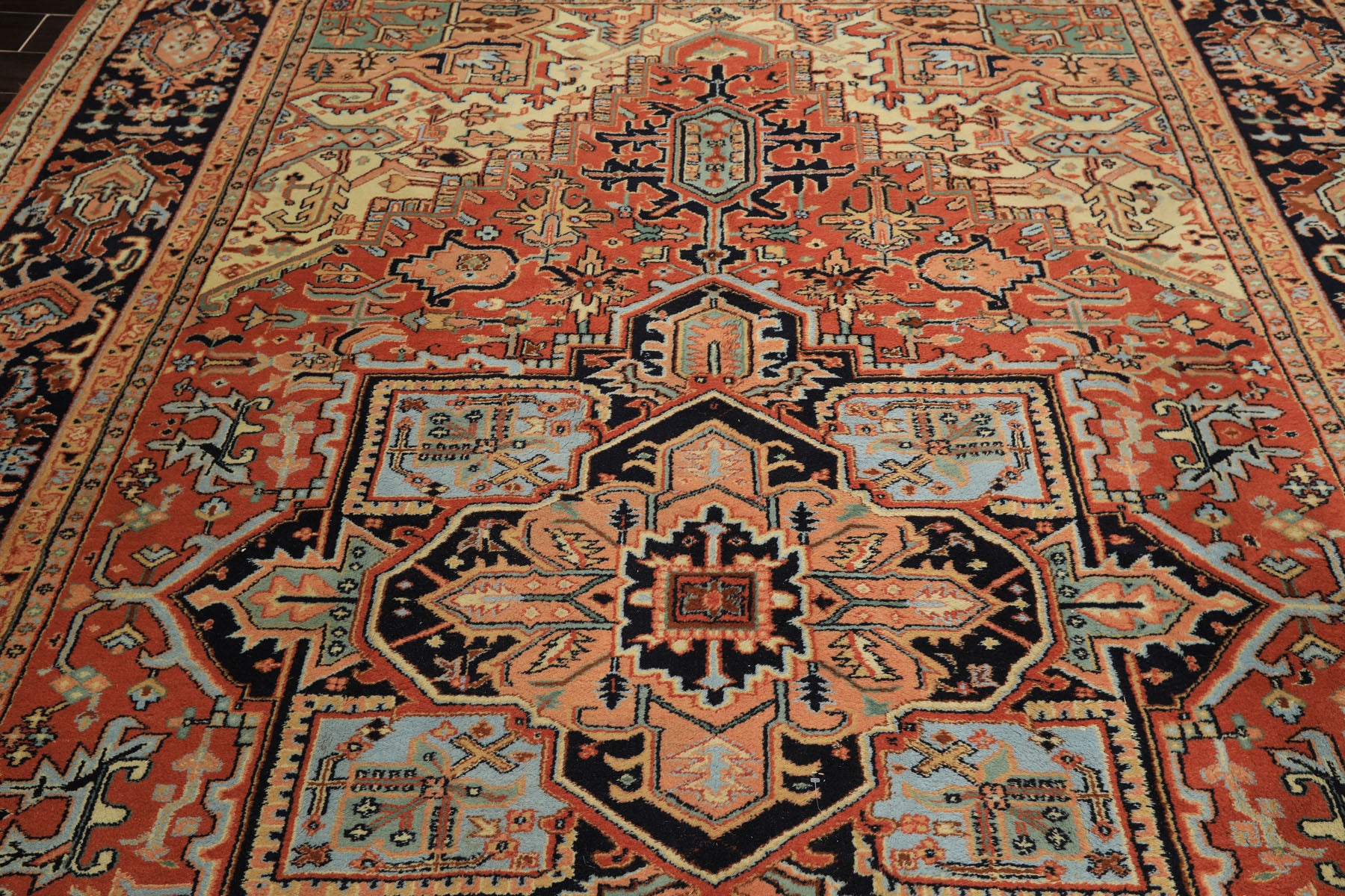Before you is a bold Heriz rug like this instantly grounds a room, offering both presence and balance through its strong geometry and time-tested craftsmanship. Measuring approximately 8'11" x 12", this hand knotted wool rug features a high cut pile with a durable cotton foundation. Woven in the traditional Heriz style, the composition centers around a large, stepped geometric medallion rendered in rich burnt orange tones. Surrounding it are crisp accents of navy and blue, which add depth and contrast, while softer shades of ivory, peach, mint, and aqua subtly lighten the palette. Touches of gold woven throughout the motifs give the rug a gentle warmth, preventing the bold colors from feeling heavy. The deep navy border, filled with repeating geometric and stylized floral elements, frames the central field beautifully and adds a sense of rhythm and order. The rug’s wool pile enhances the colors with a natural softness, allowing the oranges and blues to shift slightly with the light, giving the rug a comforting feel rather than a flat finish. Altogether, this traditional geometric Heriz rug balances bold design with calm harmony, making it a piece that anchors a space while quietly growing more beautiful with time.