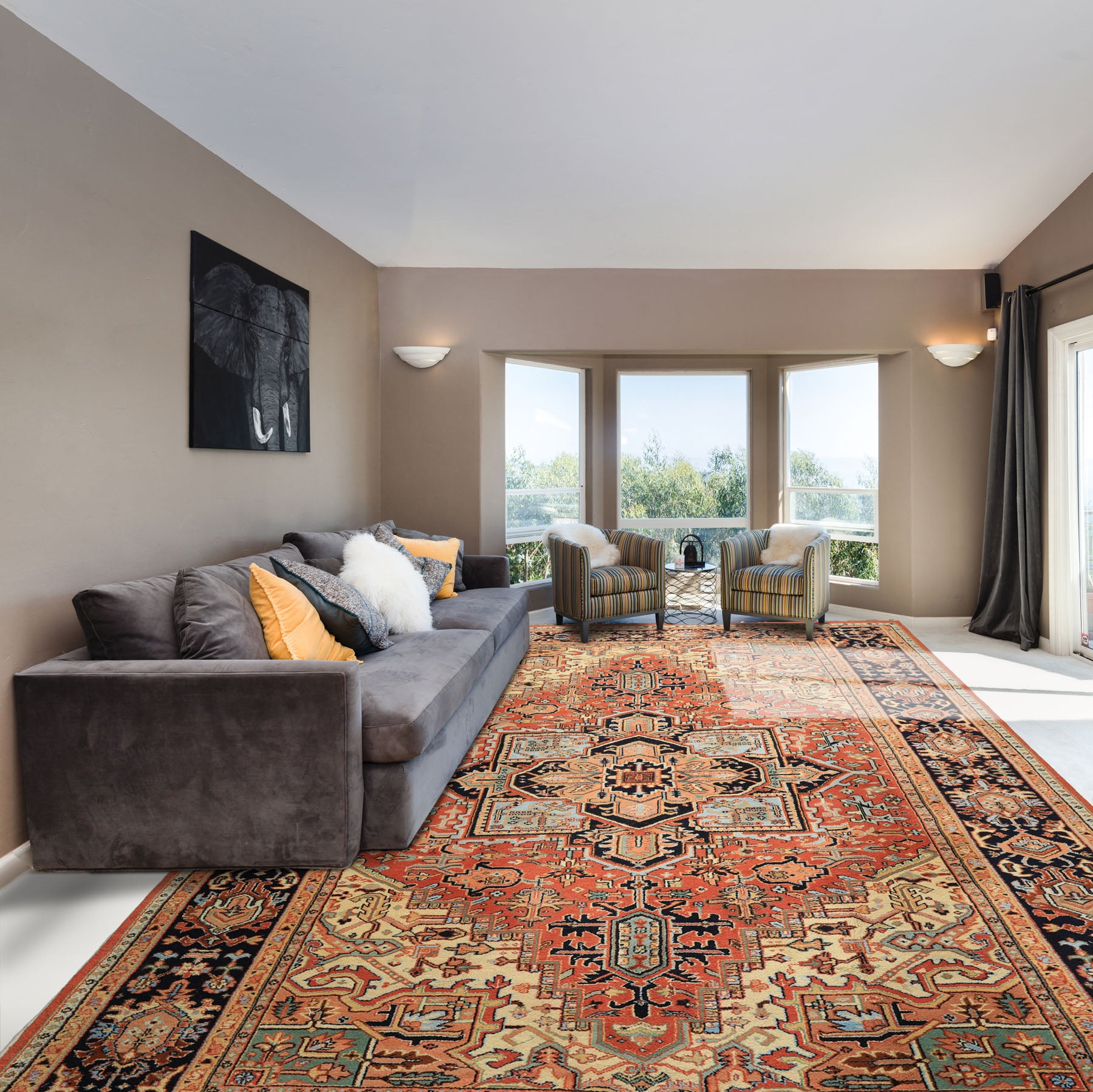 Story Behind the Art: Heriz rugs, woven in the mountainous region of northwestern Iran near Tabriz, are renowned for their bold artistry and exceptional durability. Crafted from robust local wool rich in natural lanolin, they possess a resilience that makes them ideally suited for generations of use. Their hallmark design is the striking angular medallion large, geometric, and commanding framed by stylized leaves and bold motifs that radiate across the field. Rendered in a palette of deep reds, indigos, ivory, and earthy tones, Heriz rugs convey a powerful, architectural presence. Valued for both their strength and their dramatic visual impact, they remain timeless symbols of Persian village weaving, equally admired as practical floor coverings and statement pieces in refined interiors.