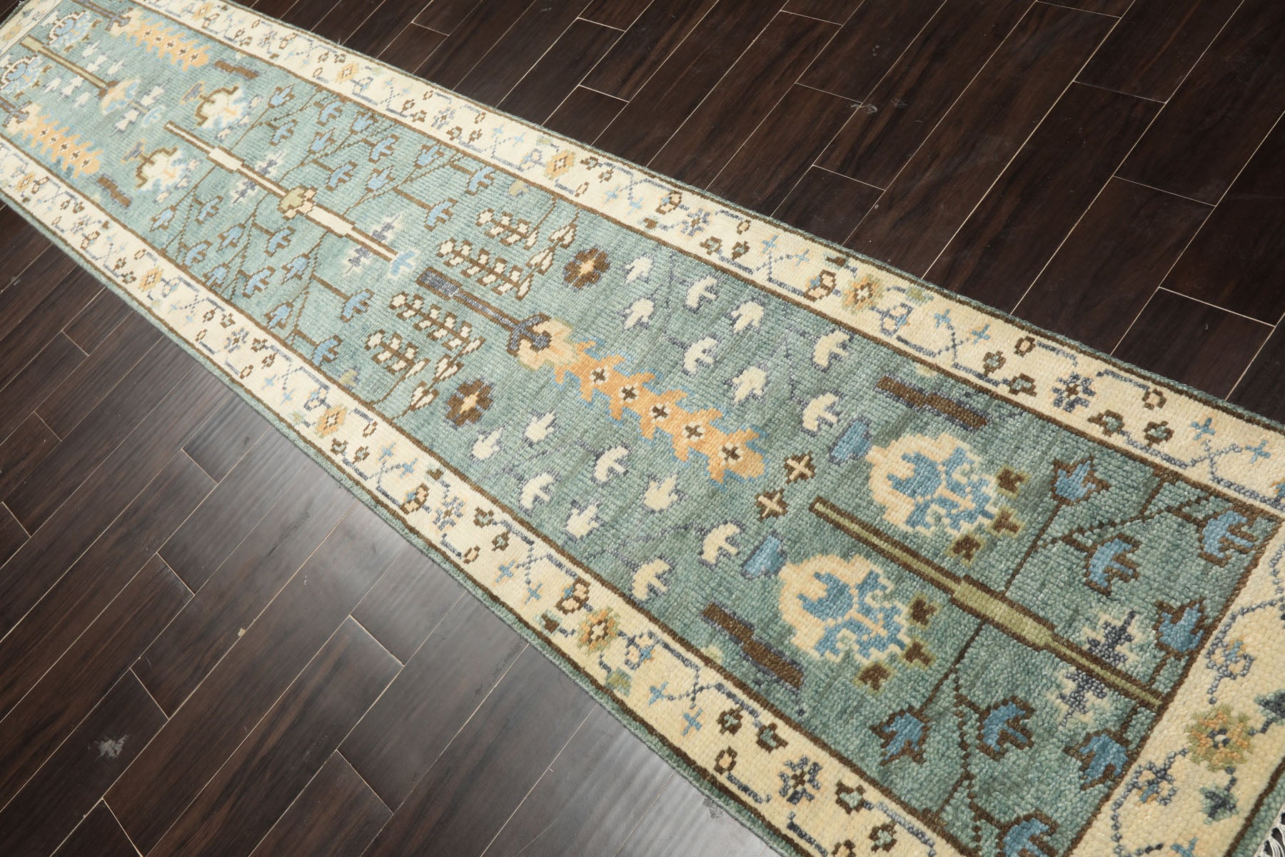 Drawing from the rich weaving heritage of Turkey's Oushak region, this hand-knotted wool runner captures the serene sophistication that has made traditional Oushak design an enduring choice for refined interiors. The tranquil celadon foundation showcases an elegant tree-of-life motif interspersed with geometric medallions, while ivory, beige, brown, tan, and blue accents create layered depth and visual harmony that anchor the composition. Skilled artisans meticulously hand-knotted each knot on a resilient cotton foundation, employing centuries-old techniques that produce the organic texture and dimensional quality characteristic of authentic craftsmanship. The elongated proportions allow the intricate pattern to unfold gracefully, creating a sense of movement and flow that guides the eye while the muted multi-toned palette brings warmth and calm to your aesthetic. Natural wool fibers deliver luxurious softness underfoot and develop a rich patina over time, deepening the rug's character and establishing it as an heirloom-worthy investment in artisanal beauty. Transform your space with timeless craftsmanship that speaks to enduring style.