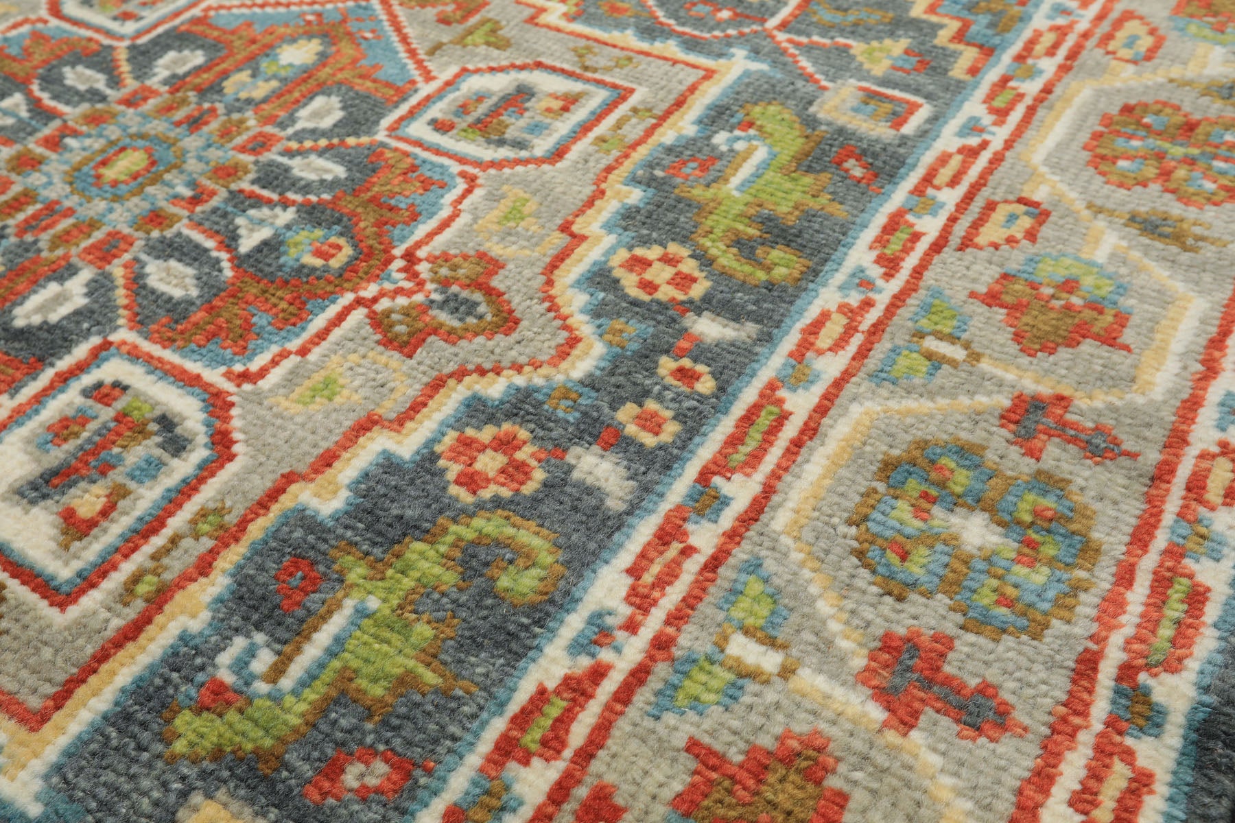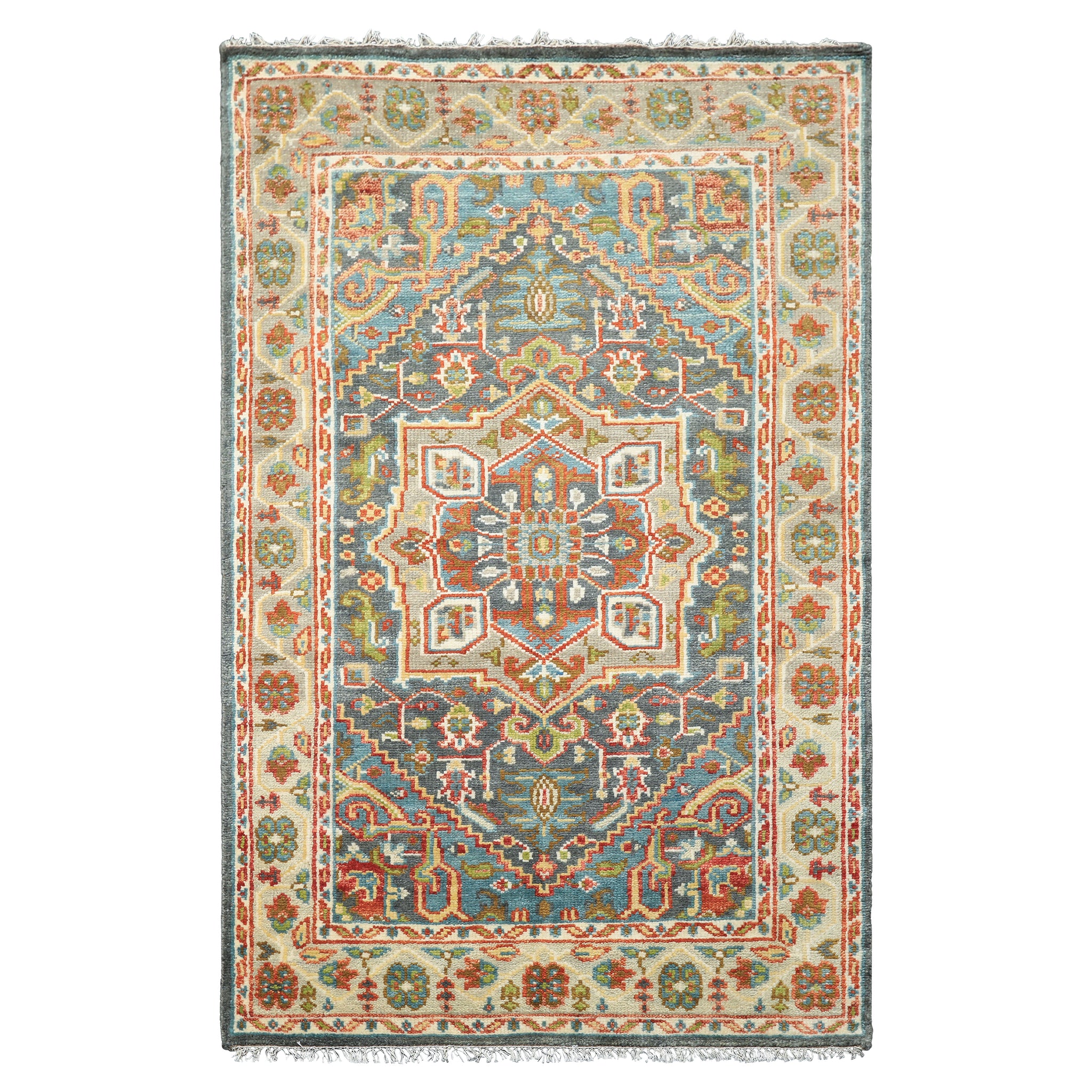 Drawing inspiration from the storied weaving traditions of Oushak, this hand-knotted wool rug captures the elegance that has made these pieces treasured across centuries and continents. The centered medallion design unfolds across a sophisticated gray-blue field, where intricate floral motifs and geometric patterns intertwine in shades of burnt orange, aqua, mint, lime, and gold, a color palette that speaks to both classical Persian aesthetics and contemporary sensibilities. The medium cut pile offers both visual texture and practical comfort underfoot, while the traditional cotton foundation ensures structural integrity that will endure through generations. Whether your aesthetic leans toward the curated eclecticism of collected antiques or the clean lines of modern design, this piece possesses that rare versatility.