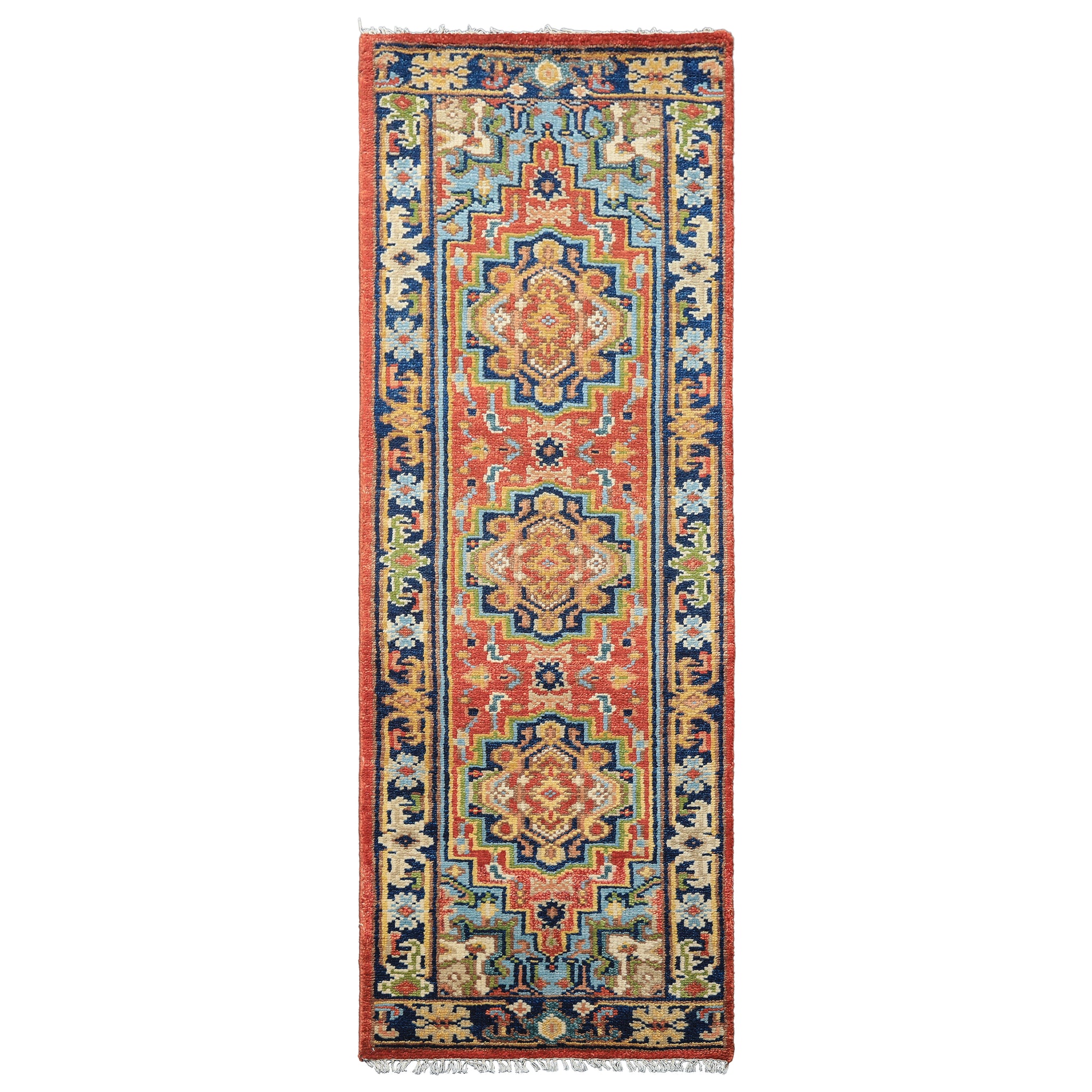 Designed to grace corridors with traditional elegance, this hand-knotted wool Oushak runner presents a warm rose-red field adorned with three bold geometric medallions in navy, sage, and ivory arranged in striking vertical succession. The traditional composition showcases intricate ornamental motifs and delicate floral elements that create layers of visual depth across the luxurious wool surface, while touches of blue add unexpected brightness to the rich color palette. Expert hand-knotting on a cotton foundation ensures this runner combines the resilience needed for high-traffic areas with the sumptuous texture that defines authentic Oushak craftsmanship. The distinguished navy border, richly embellished with classic floral patterns in complementary tones, provides a bold frame that beautifully contrasts with the rose field while reinforcing the rug's multi-colored vibrancy. The dynamic blend of rose, navy, sage, and ivory creates a warm yet sophisticated foundation that brings traditional character and visual impact to hallways and entryways, making it perfect for those seeking a runner with timeless appeal and distinctive presence. Add this traditional Oushak runner to your pathways for genuine artisanal quality and enduring beauty.