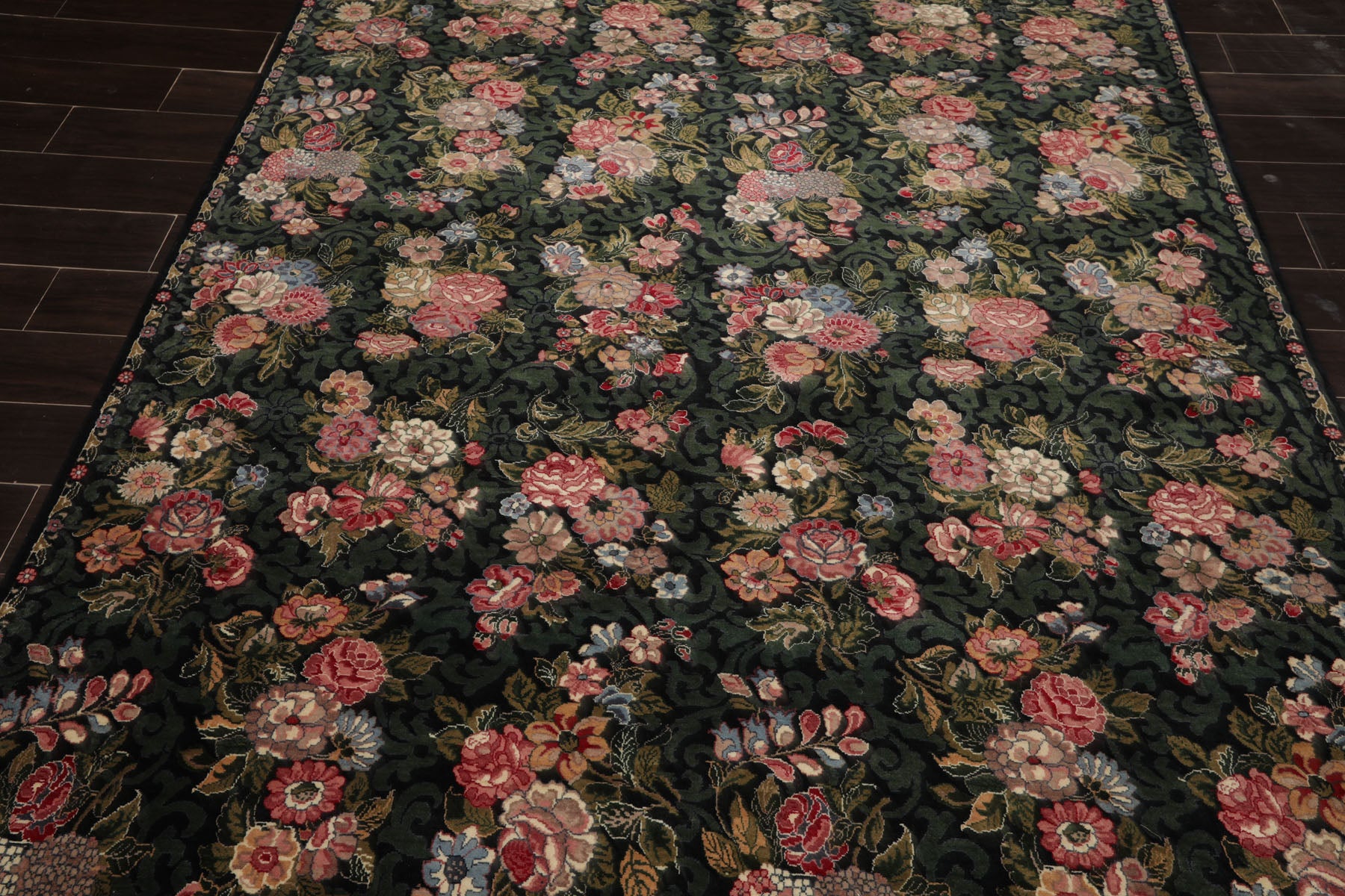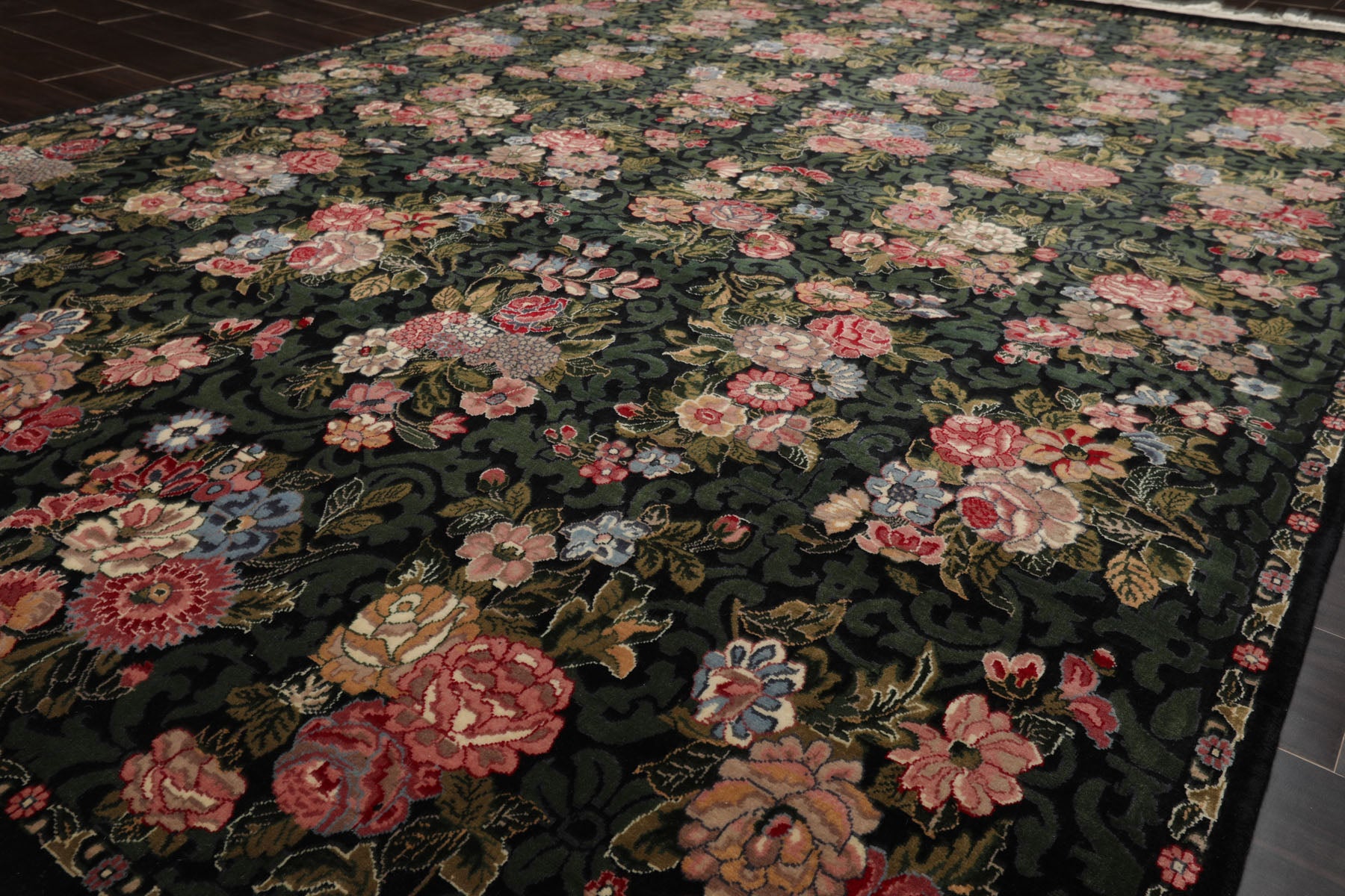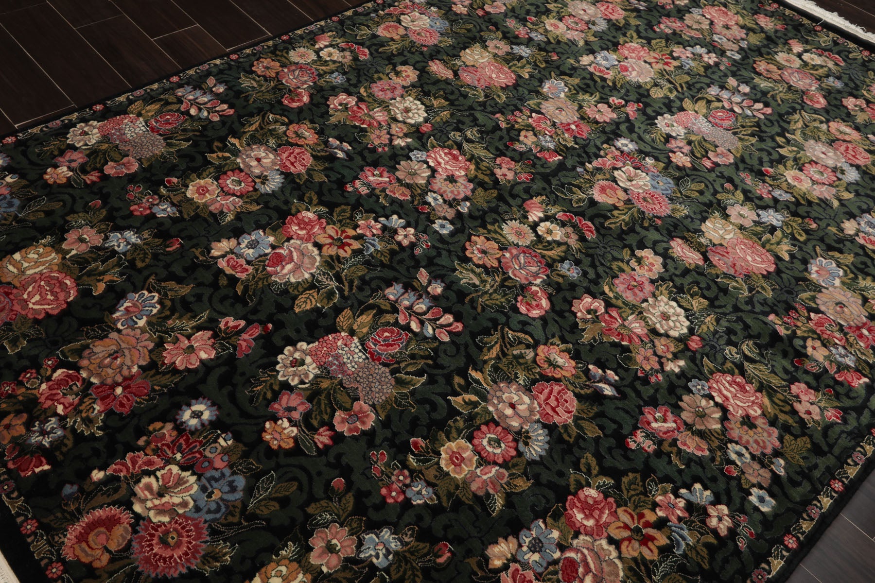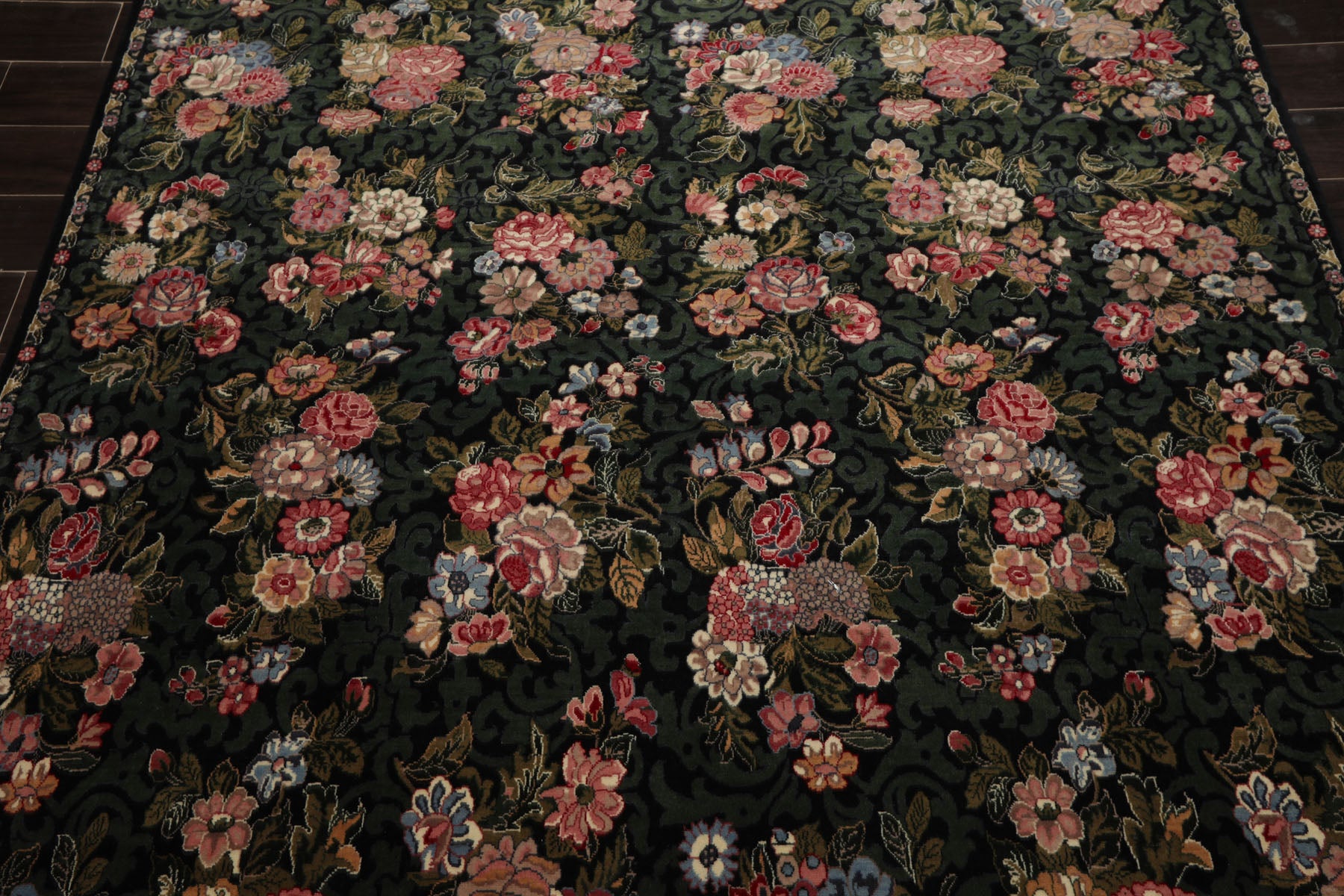 Bring timeless beauty into your home with this hand-knotted Aubusson Savonnerie rug from Pakistan, crafted with 300 kpsi for exceptional quality and longevity. This rug, woven from soft wool, displays an intricate French floral design with a striking color palette of black, green, ivory, rose, pink, red, and blue. The traditional style combined with the floral accents adds an elegant touch to any room, while the 0.25-inch pile ensures comfort underfoot.