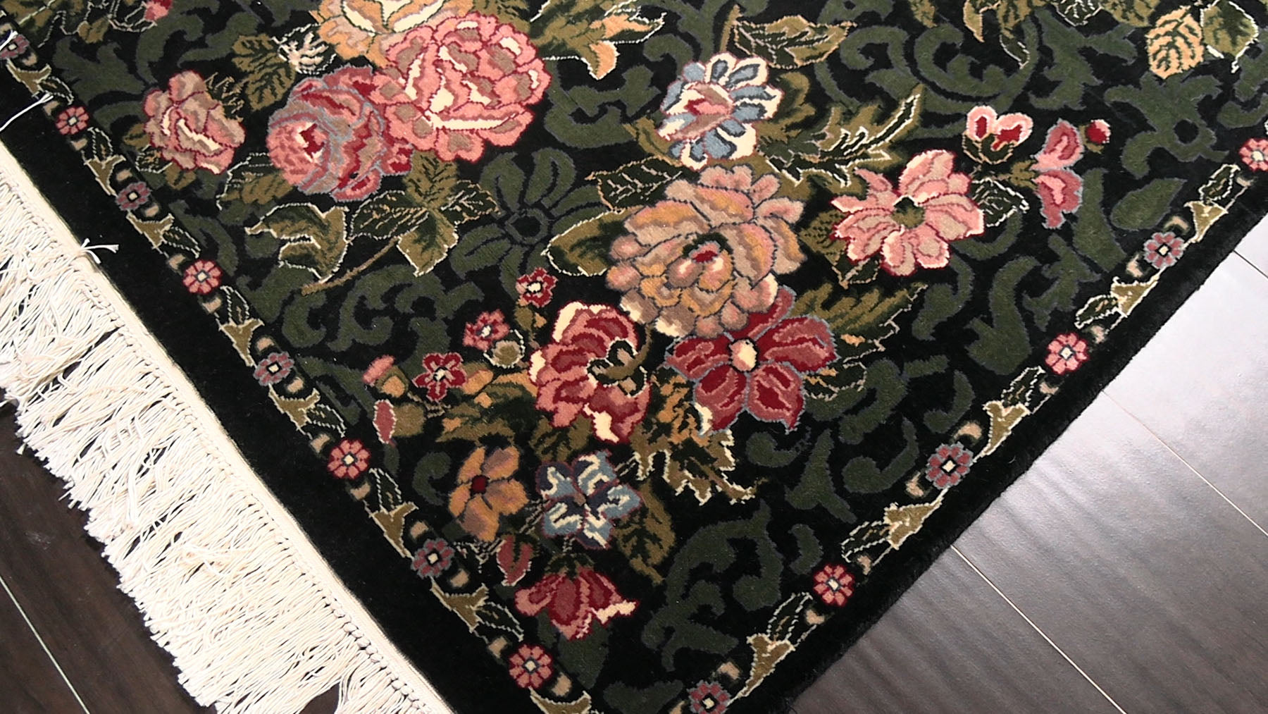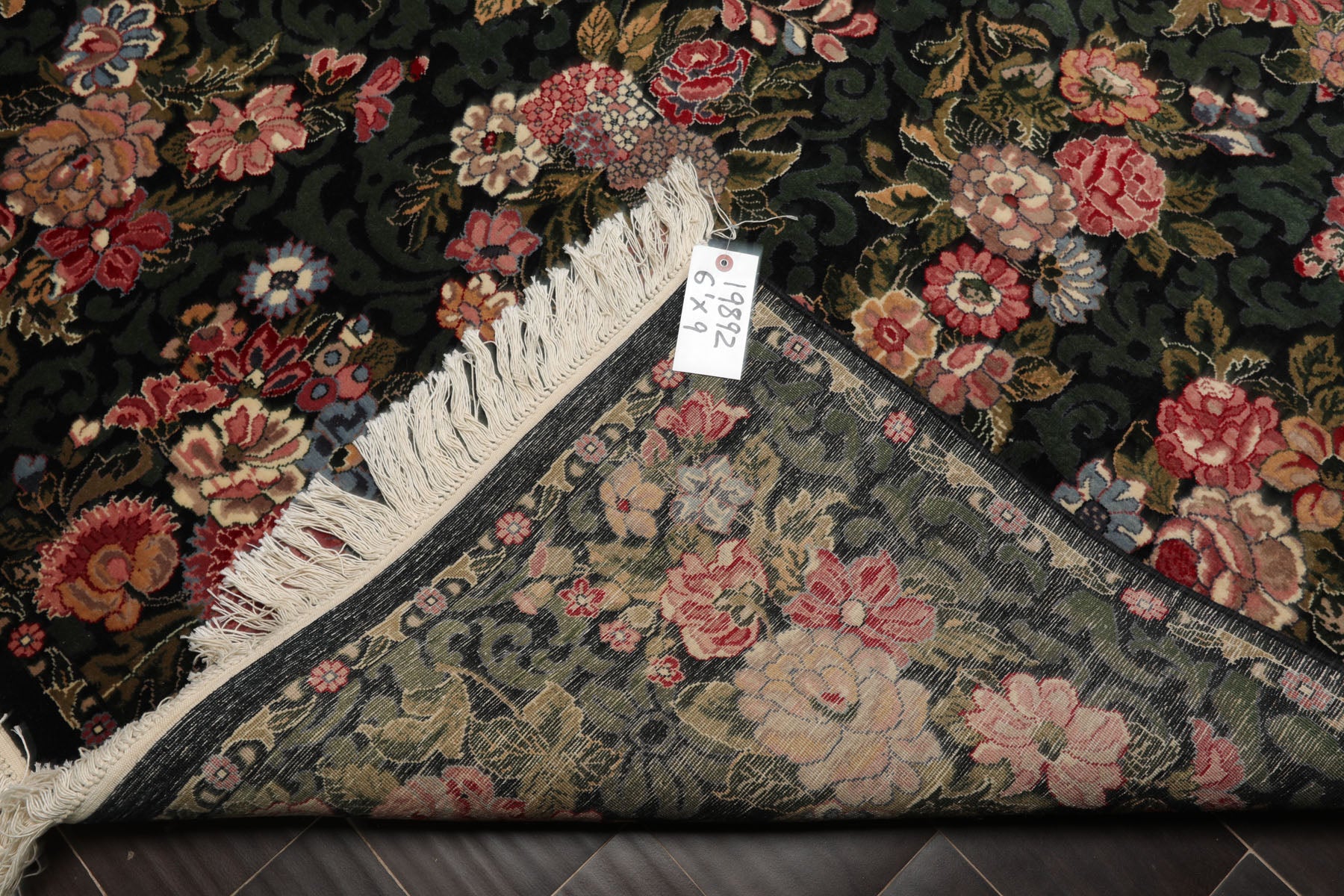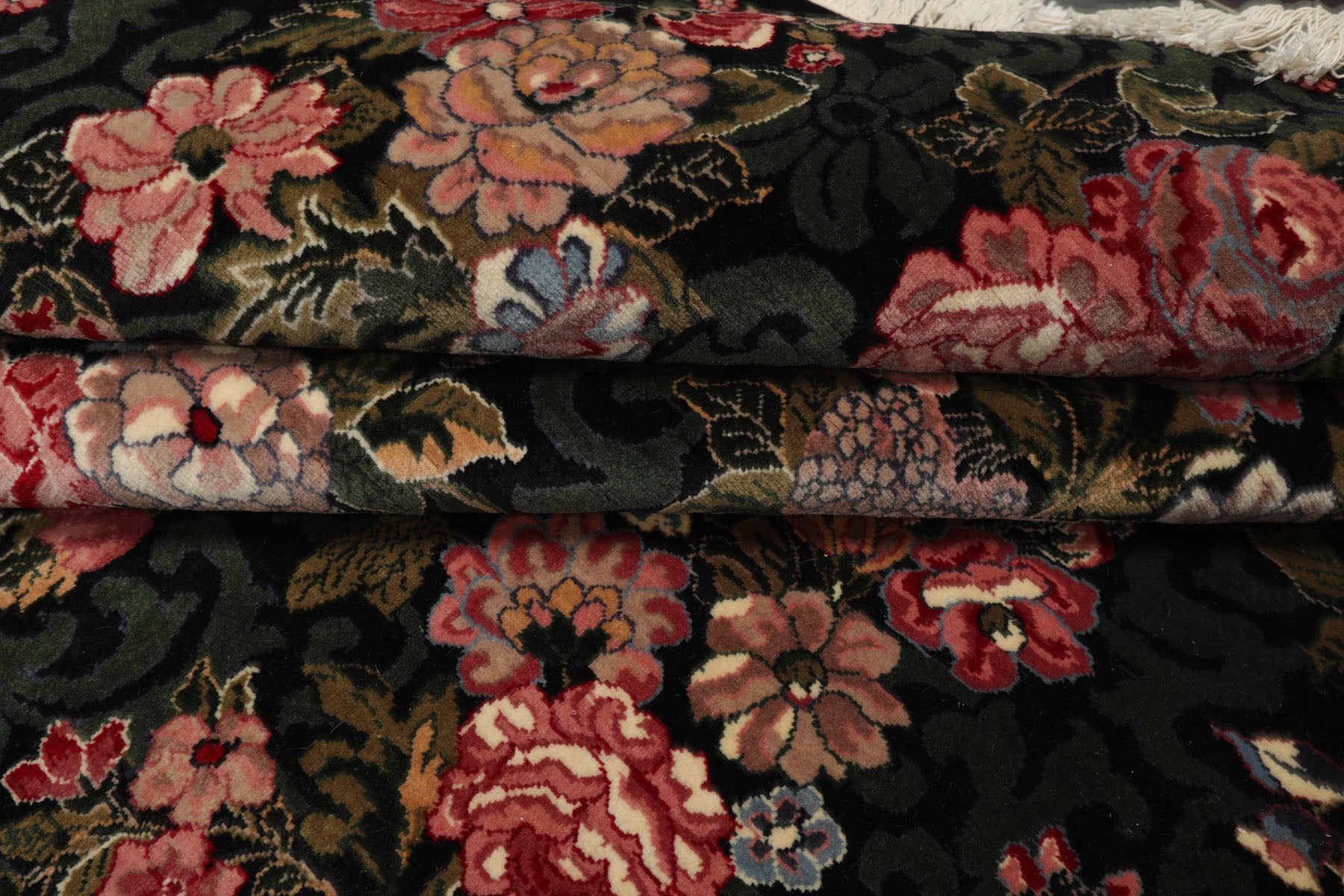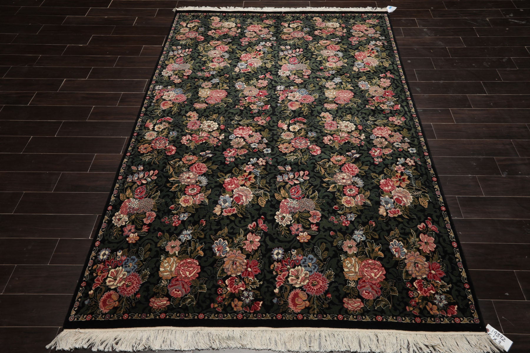Bring timeless beauty into your home with this hand-knotted Aubusson Savonnerie rug from Pakistan, crafted with 300 kpsi for exceptional quality and longevity. This rug, woven from soft wool, displays an intricate French floral design with a striking color palette of black, green, ivory, rose, pink, red, and blue. The traditional style combined with the floral accents adds an elegant touch to any room, while the 0.25-inch pile ensures comfort underfoot.