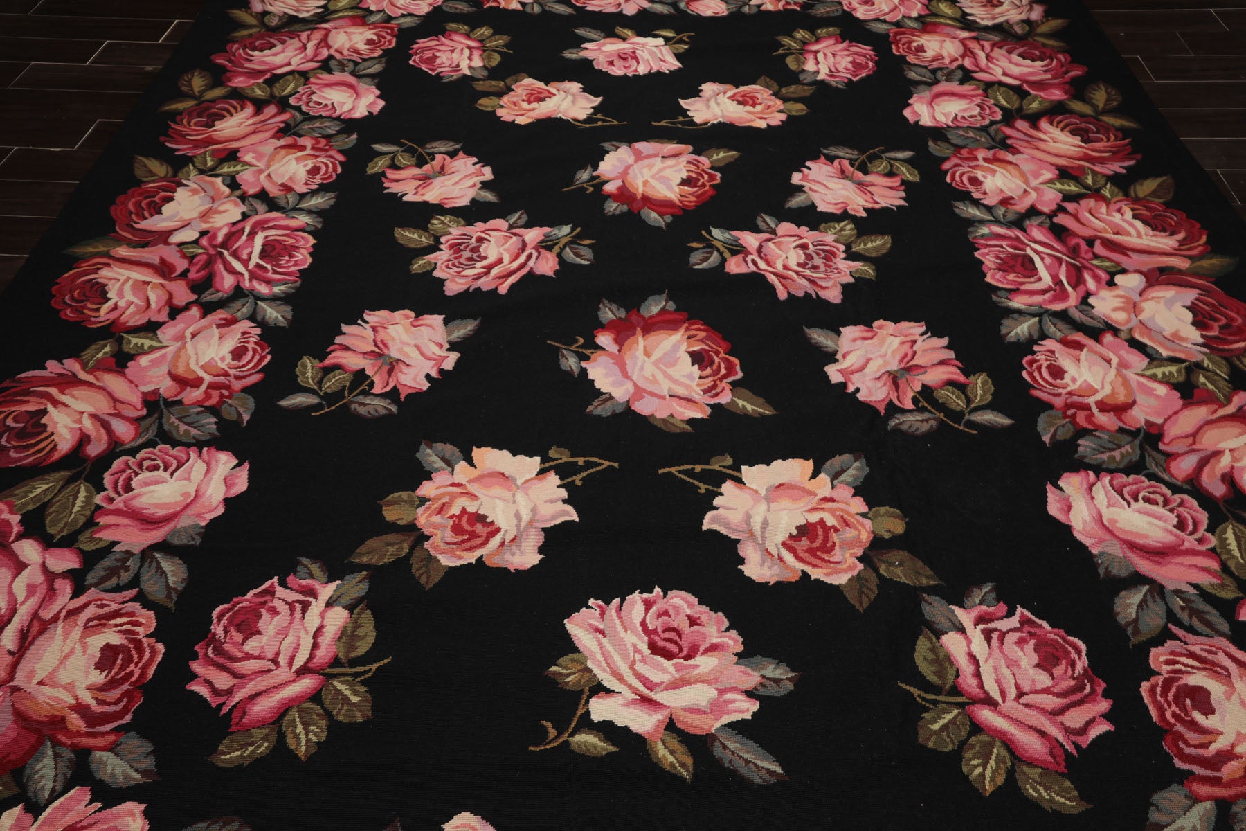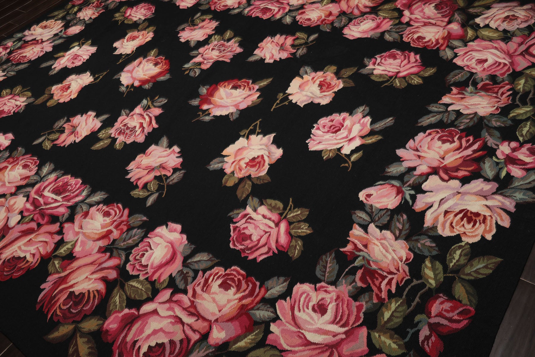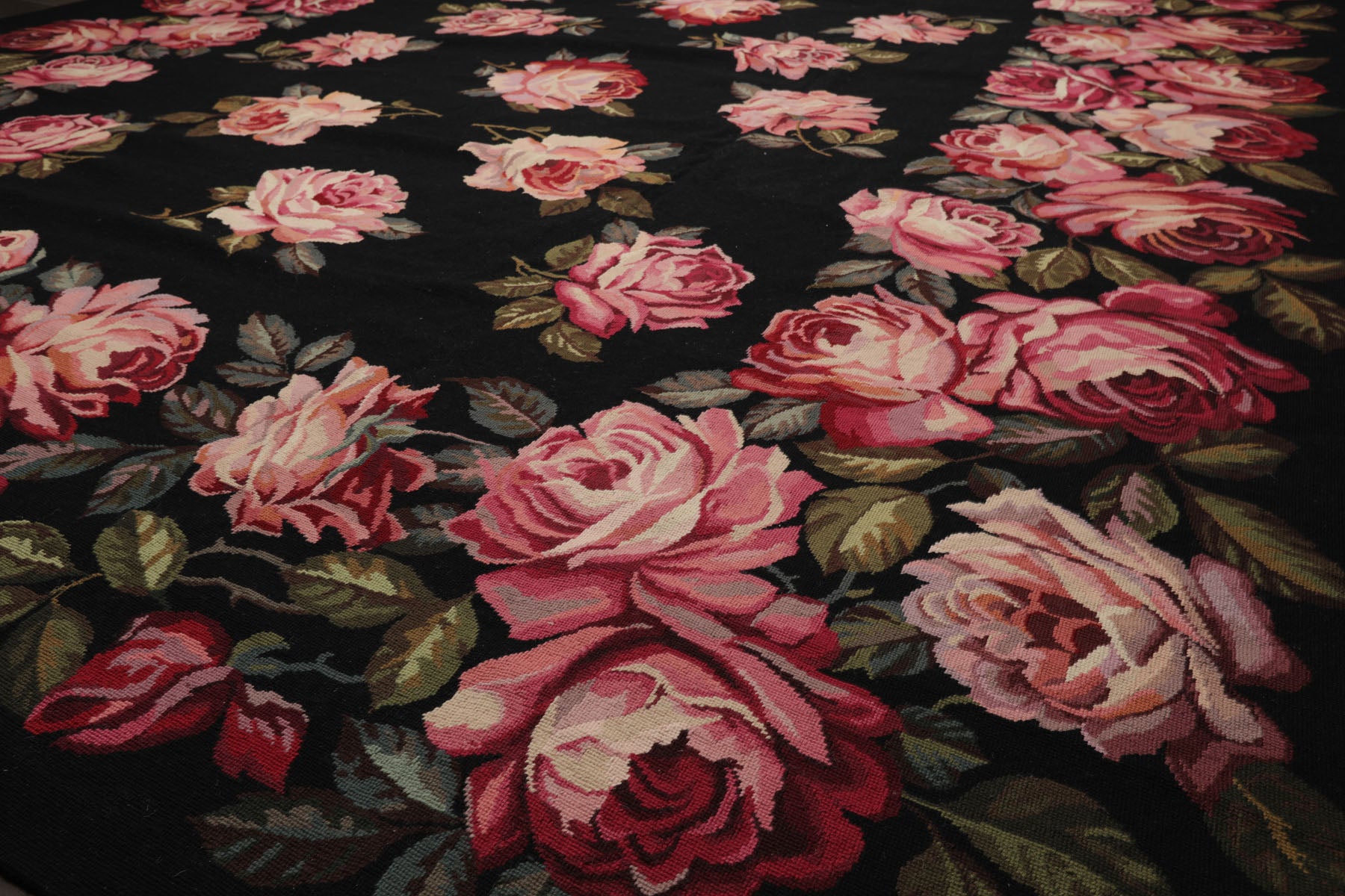 Inspired by timeless French elegance this handwoven needlepoint evokes the romantic charm of classic European décor. Woven in China with a fine .1" flatweave pile the rug showcases lush pink and rose blooms set dramatically against a bold black backdrop. Accented with hues of green brown teal and ivory the detailed floral arrangements form a striking border and balanced center medallion. Lightweight yet durable this rug delivers the refined tapestry-like appeal of European décor perfect for formal living rooms sitting areas or vintage-inspired interiors.