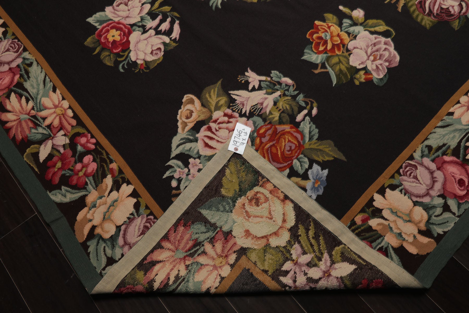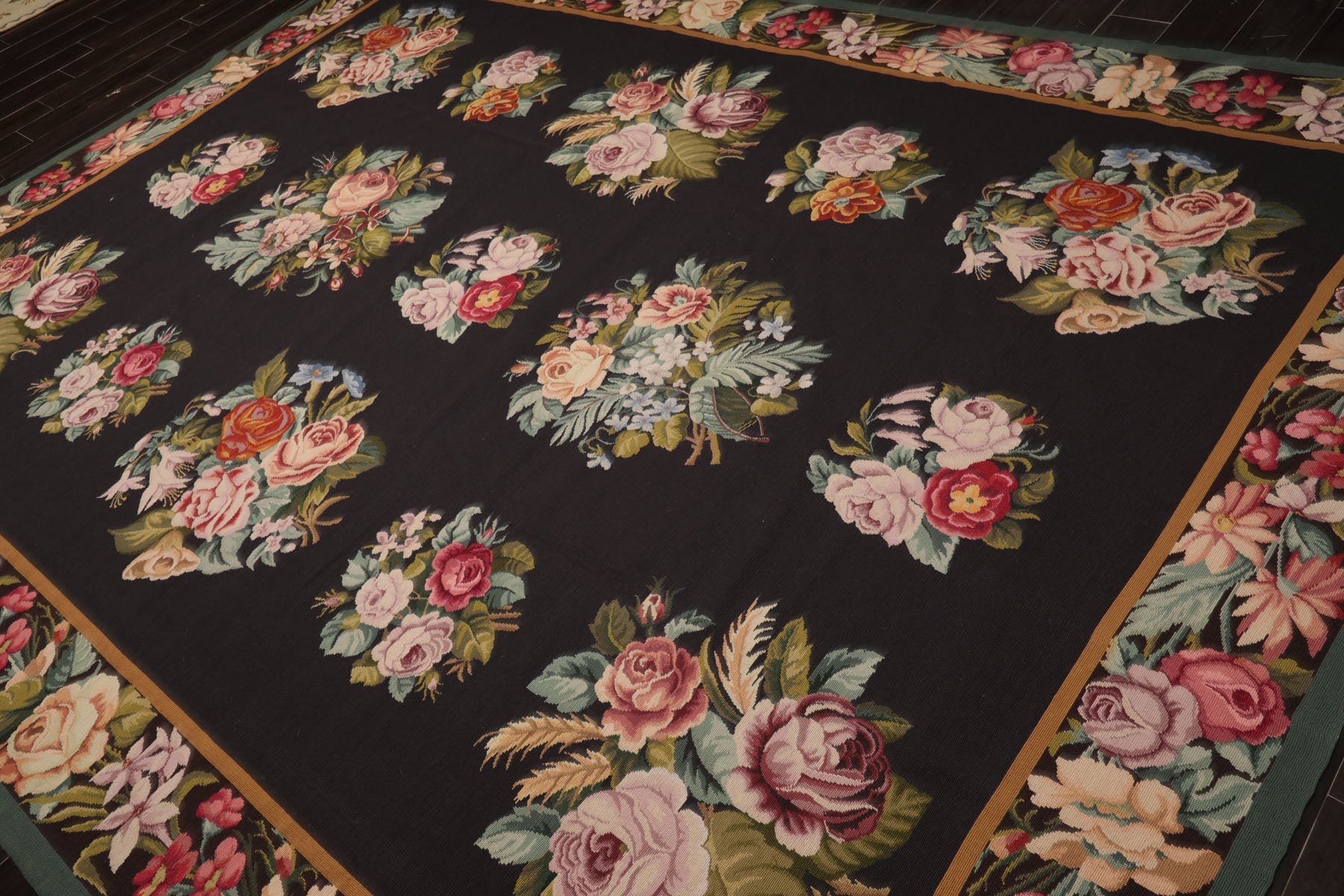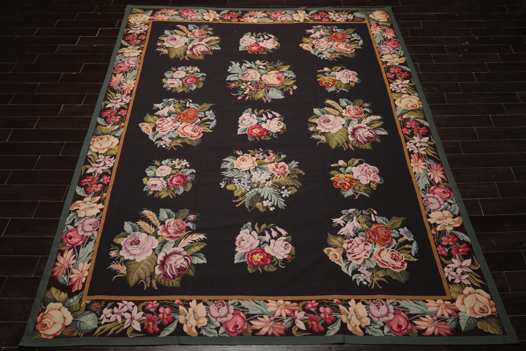 A masterpiece of European-inspired artistry, the Aubusson needlepoint rug brings timeless elegance with its charcoal backdrop richly decorated in floral bouquets of rose, ivory, teal, and green. Handwoven in fine wool on a flatweave cotton foundation, it reflects the refined craftsmanship of traditional French needlepoint. Lush blossoms framed by a vibrant multicolor border create a striking yet graceful presence, balancing drama with sophistication. An Asmara French Needlepoint piece, it offers a perfect blend of heritage design and decorative beauty, destined to elevate any interior with its classical charm.