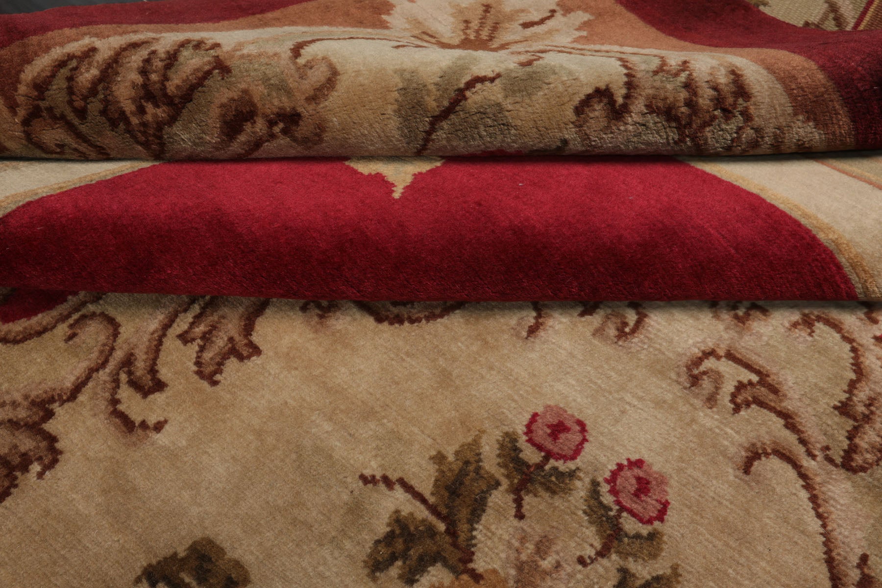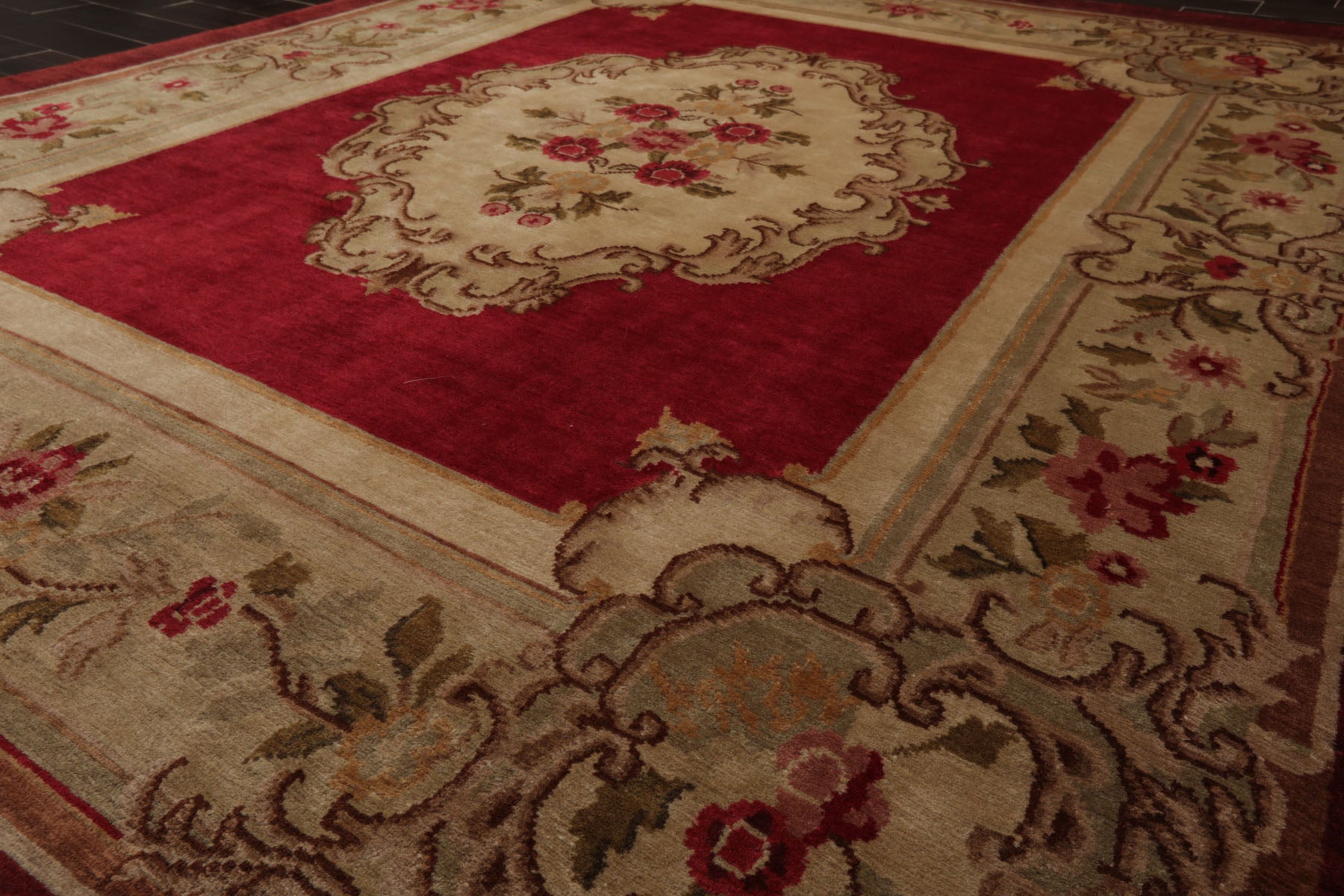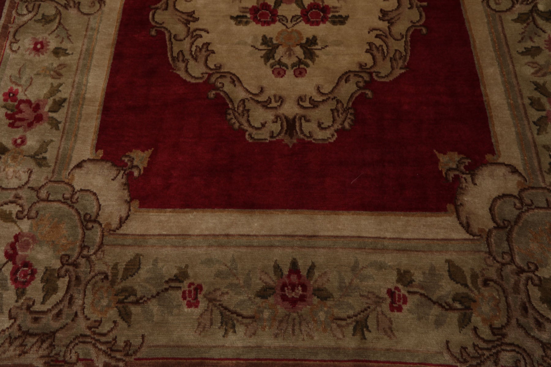 Rich in tradition and elegance this hand knotted Aubusson Savonnerie rug from India features a classic European-inspired floral medallion design beautifully rendered in a warm crimson field. Woven with precision and care it features a refined medallion centerpiece framed by ornate scrollwork floral garlands and architectural border motifs. The ornate border blends shades of green tan brown rose and gold forming a harmonious palette that enhances its timeless charm. With a soft .6-inch wool pile the rug is both luxurious underfoot and visually captivating. Ideal for formal living rooms dining areas or traditional interiors seeking warmth and sophistication.