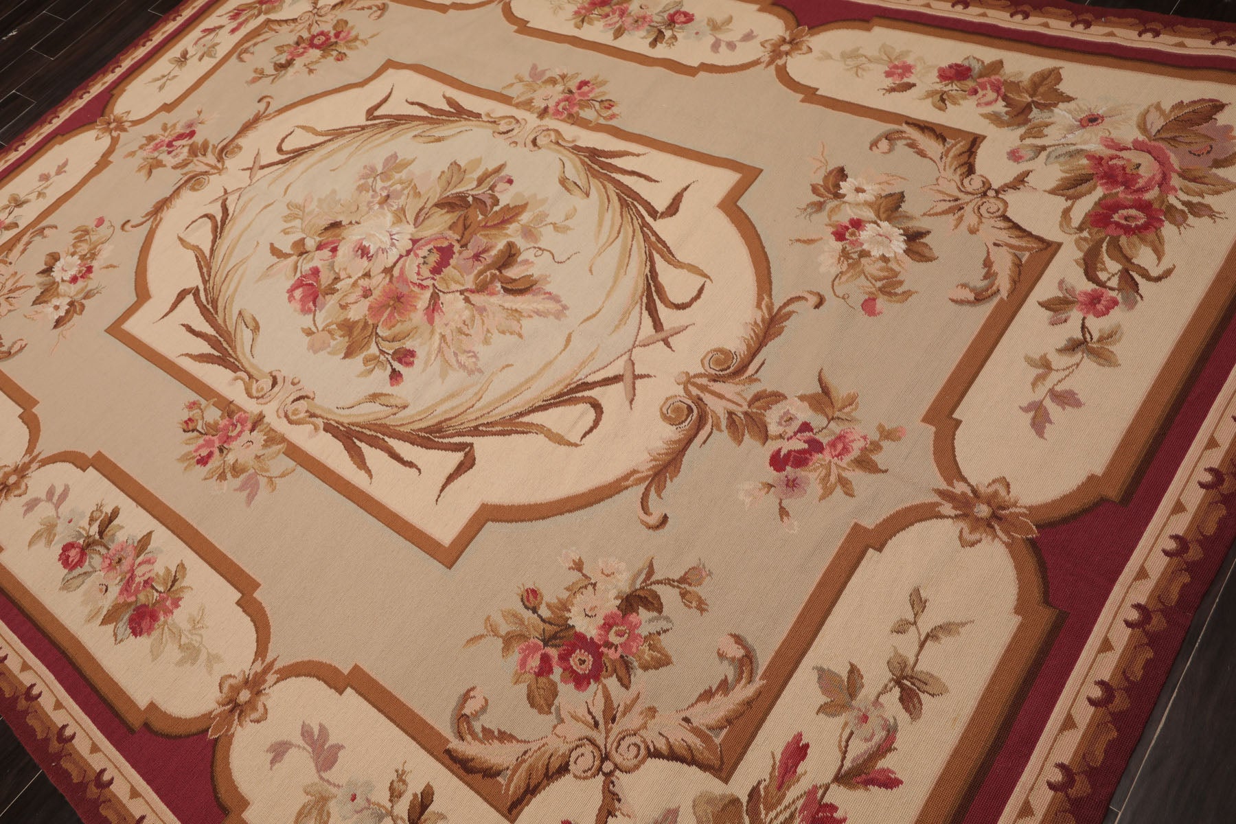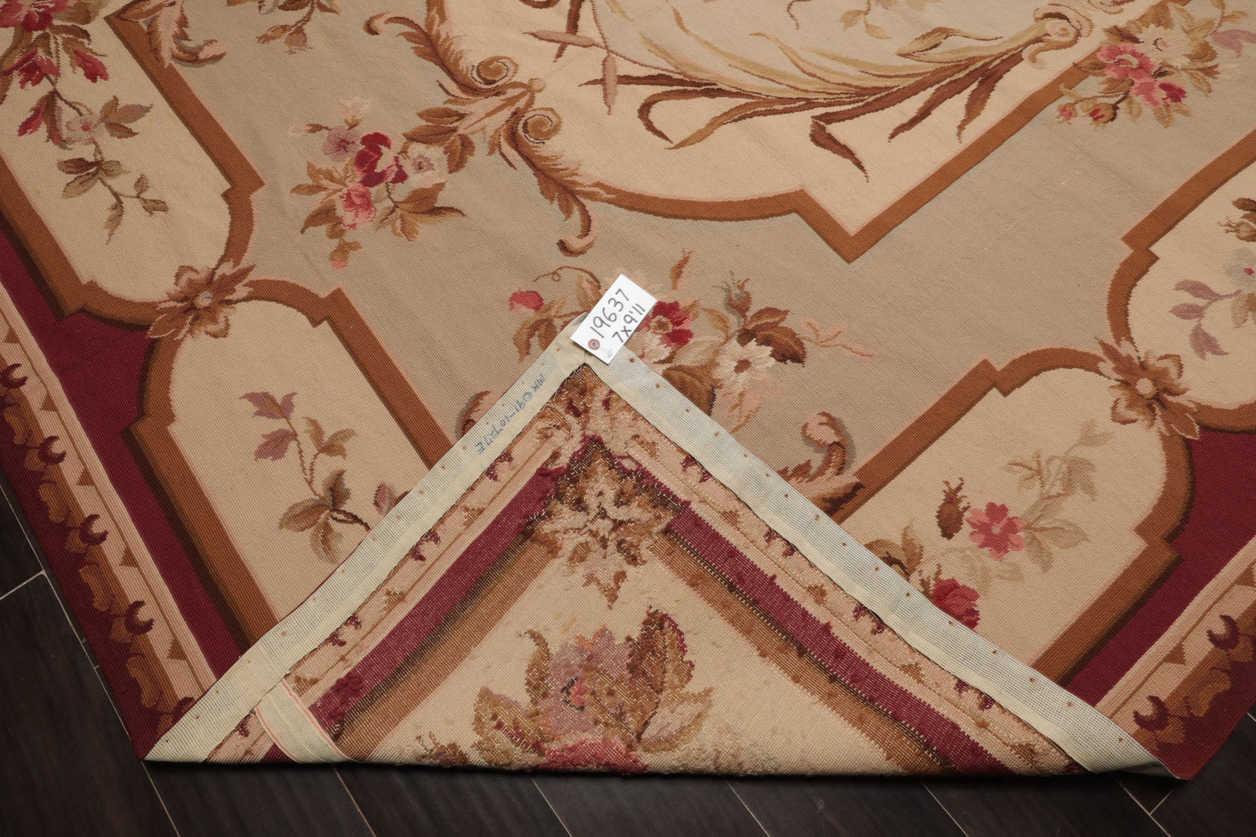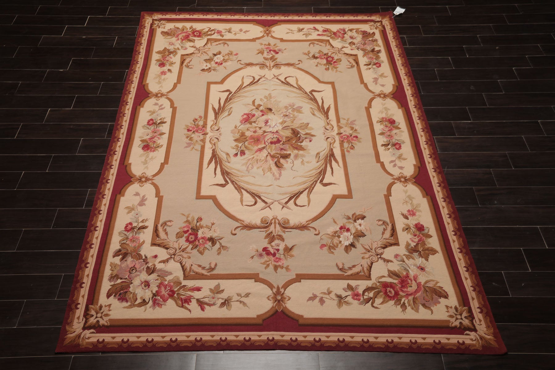 Before you is a beautiful handwoven French Aubusson needlepoint rug from China that captures timeless European elegance in a delicate flatweave form. A graceful central floral medallion sits on an ivory and beige backdrop framed by scrolling garlands and rose bouquets in shades of burgundy gold mint and brown. The refined palette and ornate detailing echo 18th-century French sophistication perfect for formal interiors or under fine furnishings. Lightweight and luxurious this piece brings soft beauty and aristocratic charm to any sophisticated setting.
