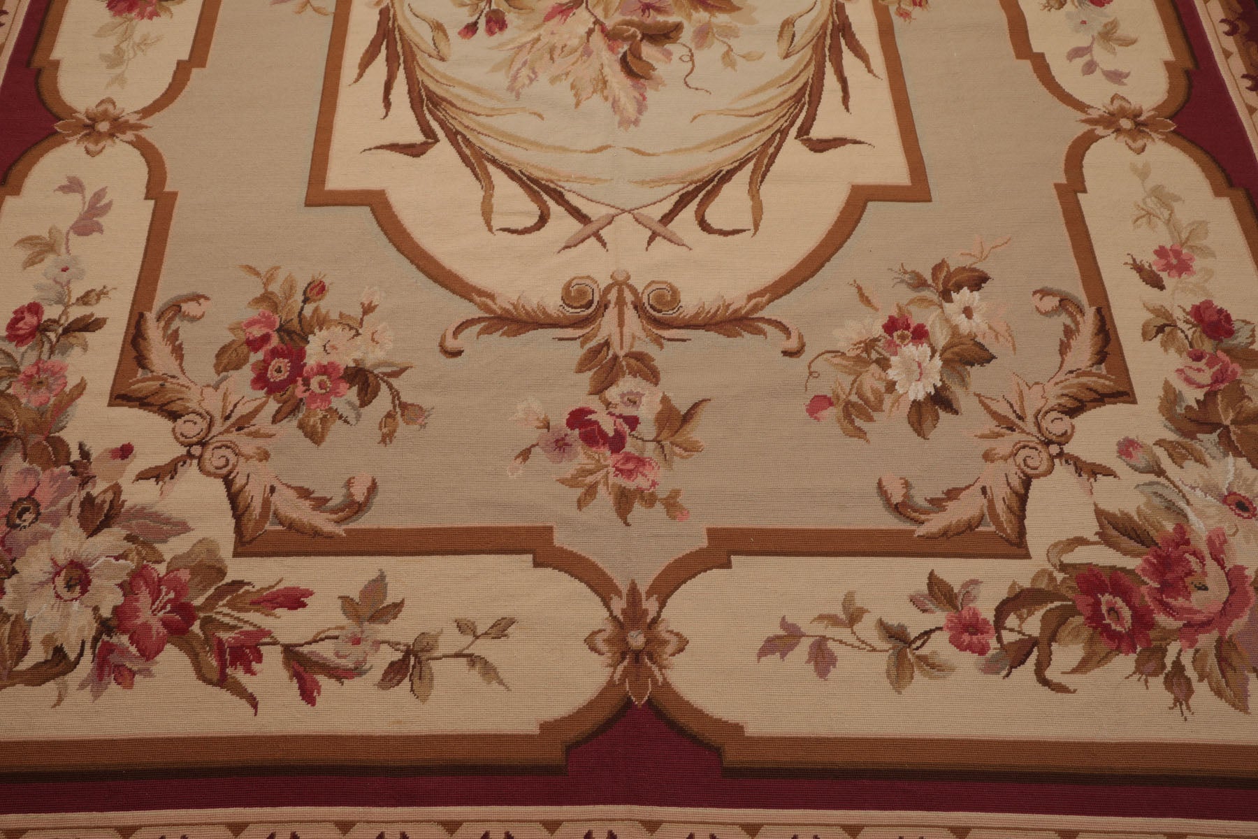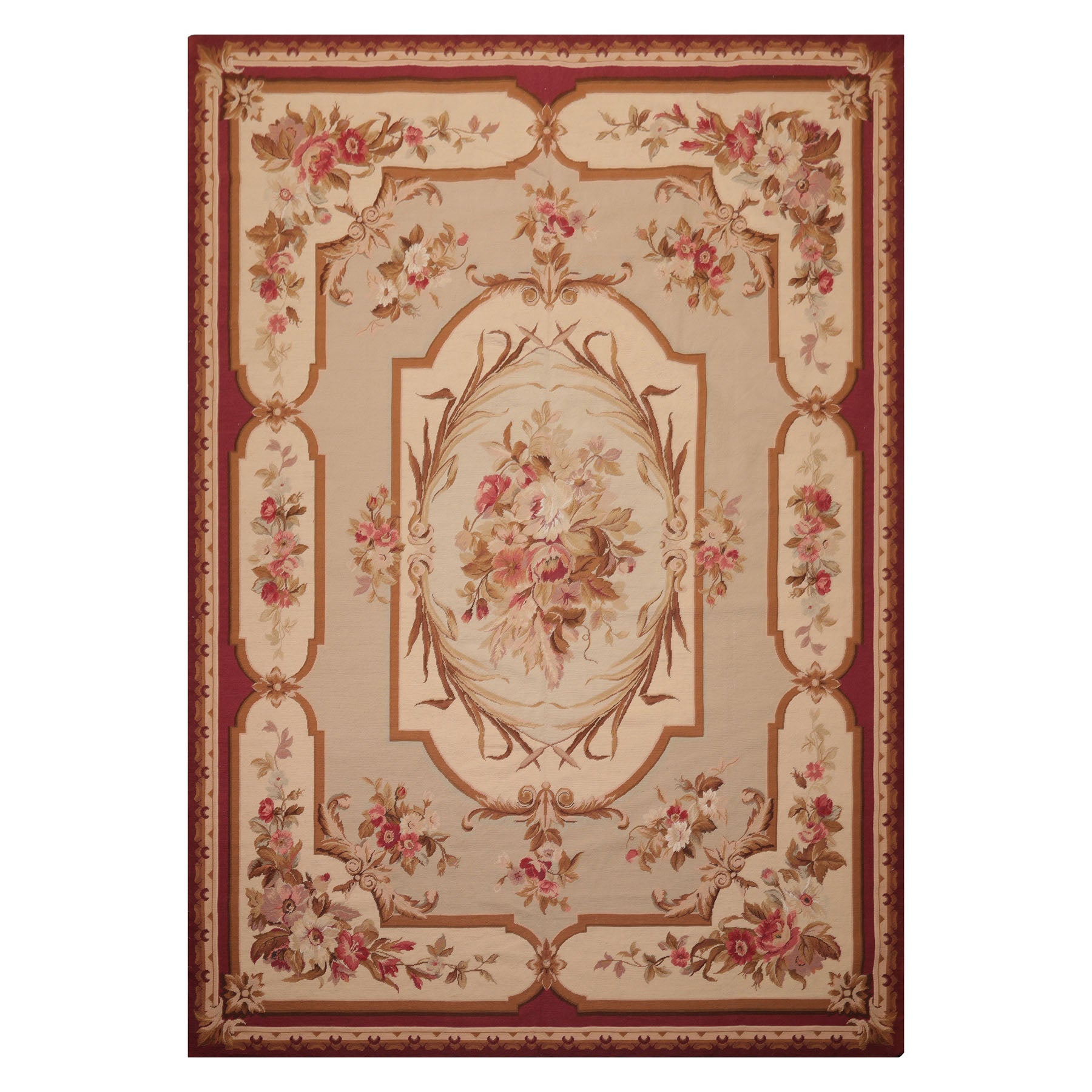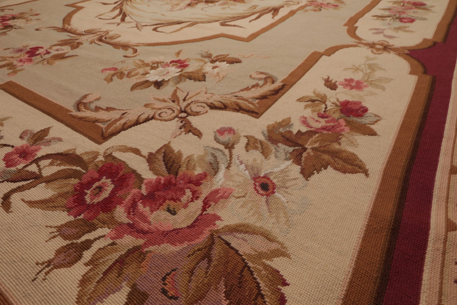Before you is a beautiful handwoven French Aubusson needlepoint rug from China that captures timeless European elegance in a delicate flatweave form. A graceful central floral medallion sits on an ivory and beige backdrop framed by scrolling garlands and rose bouquets in shades of burgundy gold mint and brown. The refined palette and ornate detailing echo 18th-century French sophistication perfect for formal interiors or under fine furnishings. Lightweight and luxurious this piece brings soft beauty and aristocratic charm to any sophisticated setting.