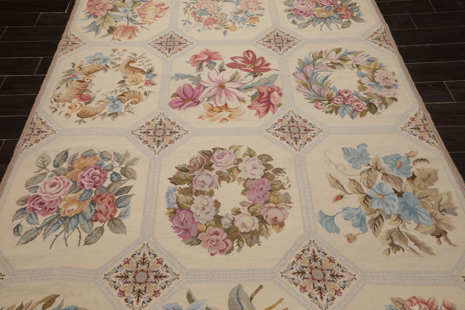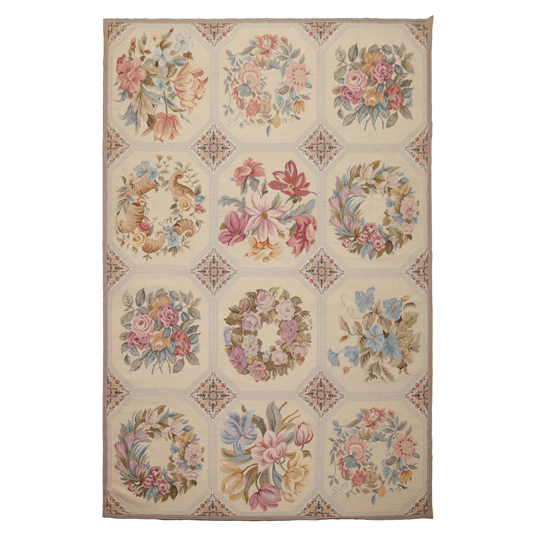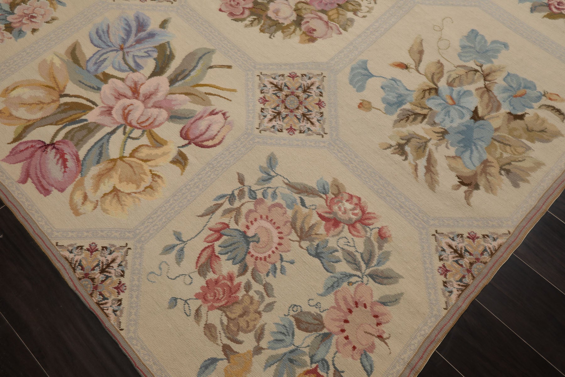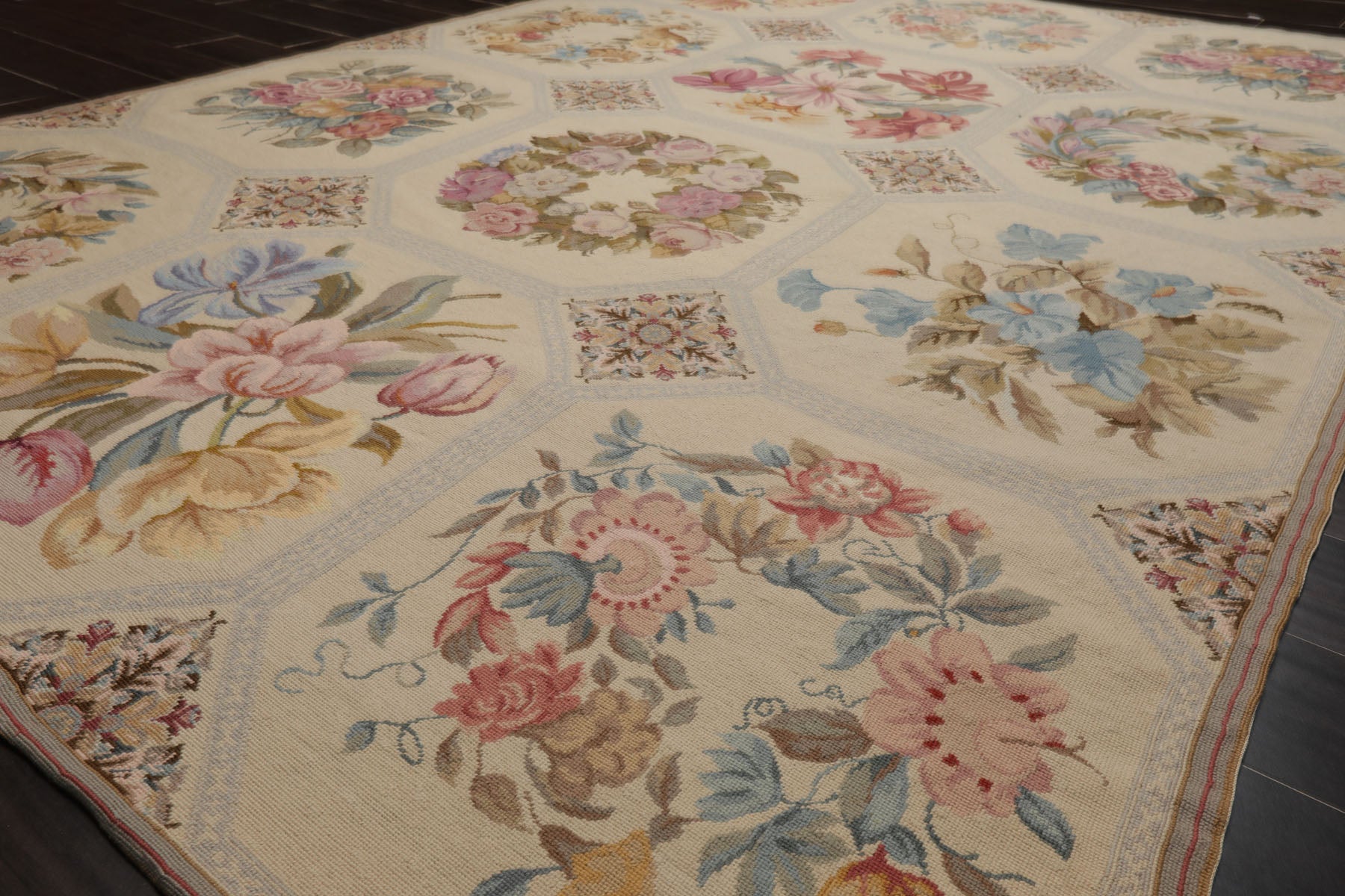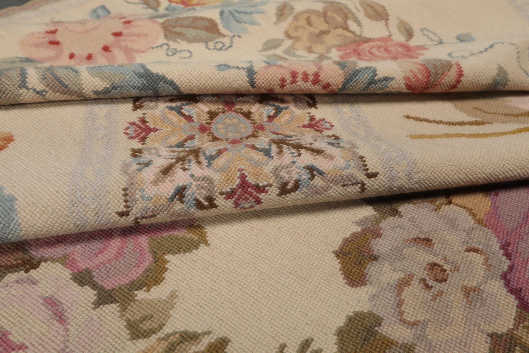 Story Behind the Art: French needlepoint rugs originated in 17th–18th century France, famously crafted in Aubusson and Savonnerie workshops for royal and aristocratic interiors. Featuring floral medallions and elegant scrollwork, they were hand-stitched onto canvas using fine petit and gros point techniques. These rugs were heavily influenced by classical European art, featuring floral medallions, scrollwork, garlands, and pastel palettes. They were often used in palaces, chateaux, and salons, woven with meticulous craftsmanship using the petit point and gros point techniques. By the late 20th century, China became a major producer of French-style needlepoint rugs. Using centuries-old weaving and embroidery skills, Chinese artisans began replicating Aubusson and Savonnerie designs on a global scale. These rugs are hand-stitched or handwoven, often using wool on cotton canvas, and maintain the look of antique French originals at more accessible price points.