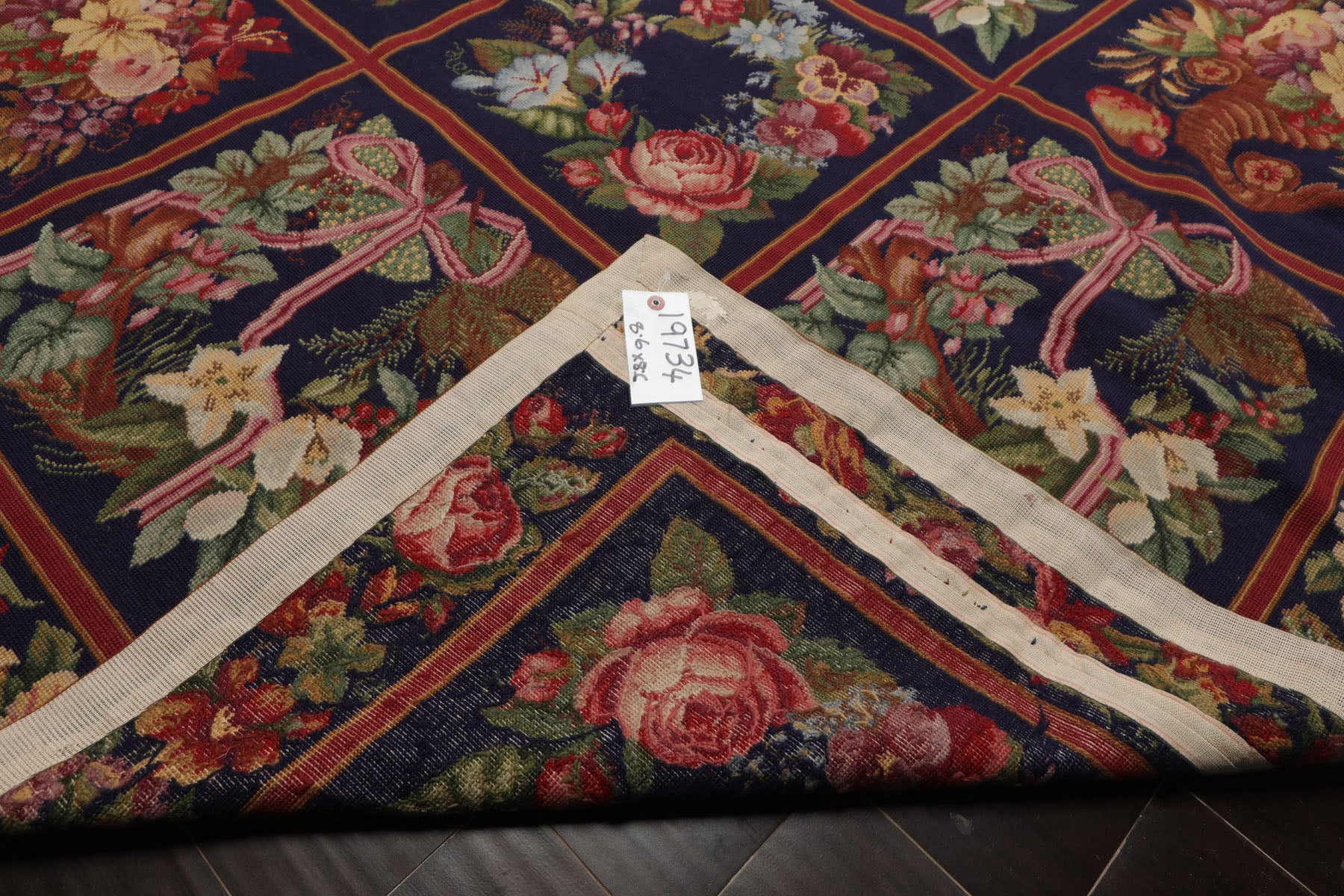 Perfect for adding vintage character to interiors, this Aubusson needlepoint rug from China blends French design heritage with botanical charm. Navy serves as the primary ground, overlaid with framed floral vignettes in shades of ivory, red, green, pink, and gold, bordered by a lively floral garland. Woven from wool on a cotton base, the rug’s flatweave construction gives it a thin, decorative finish at 0.1" pile height. A timeless piece, it works beautifully as both a floor rug and a wall tapestry.