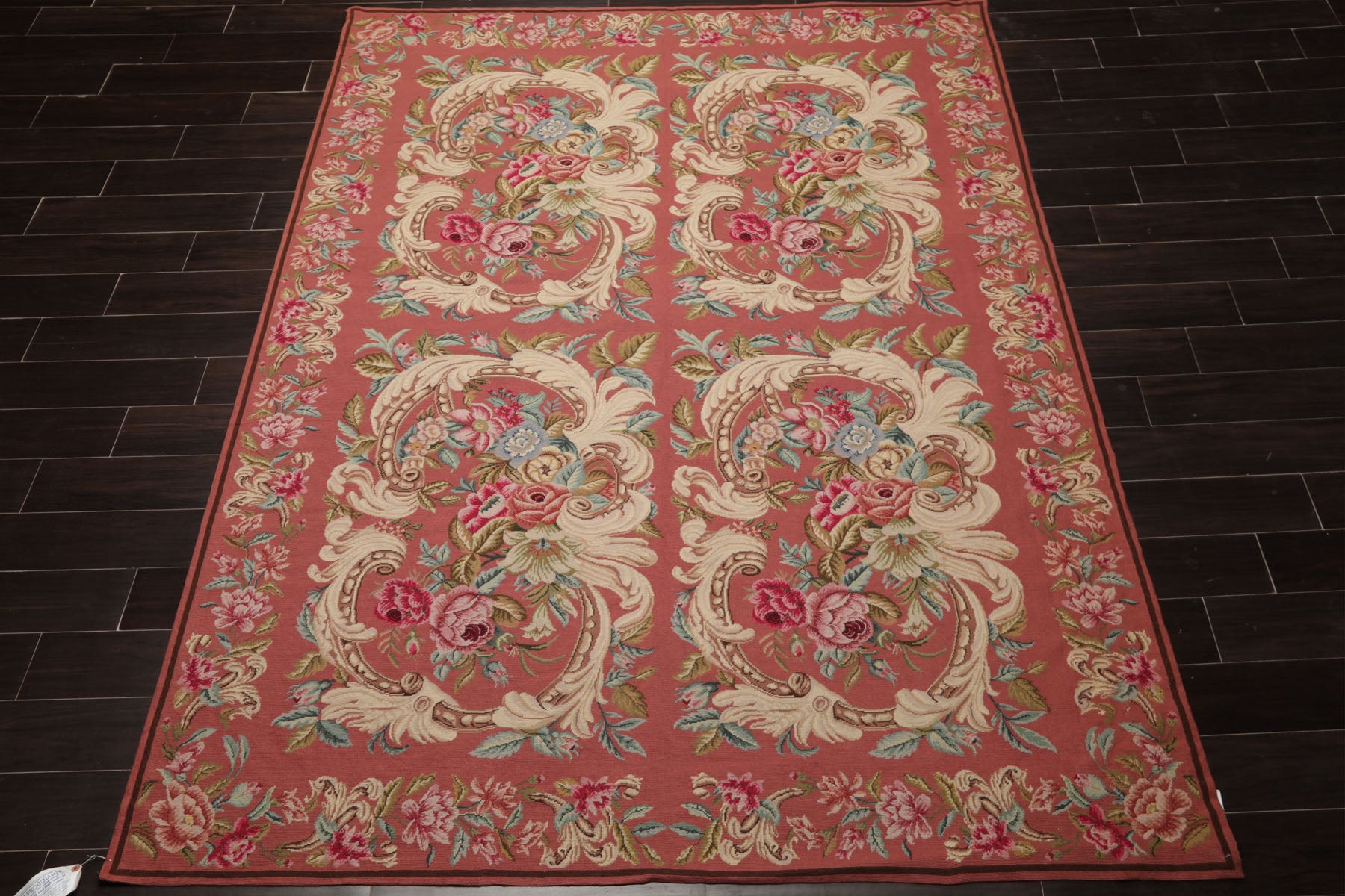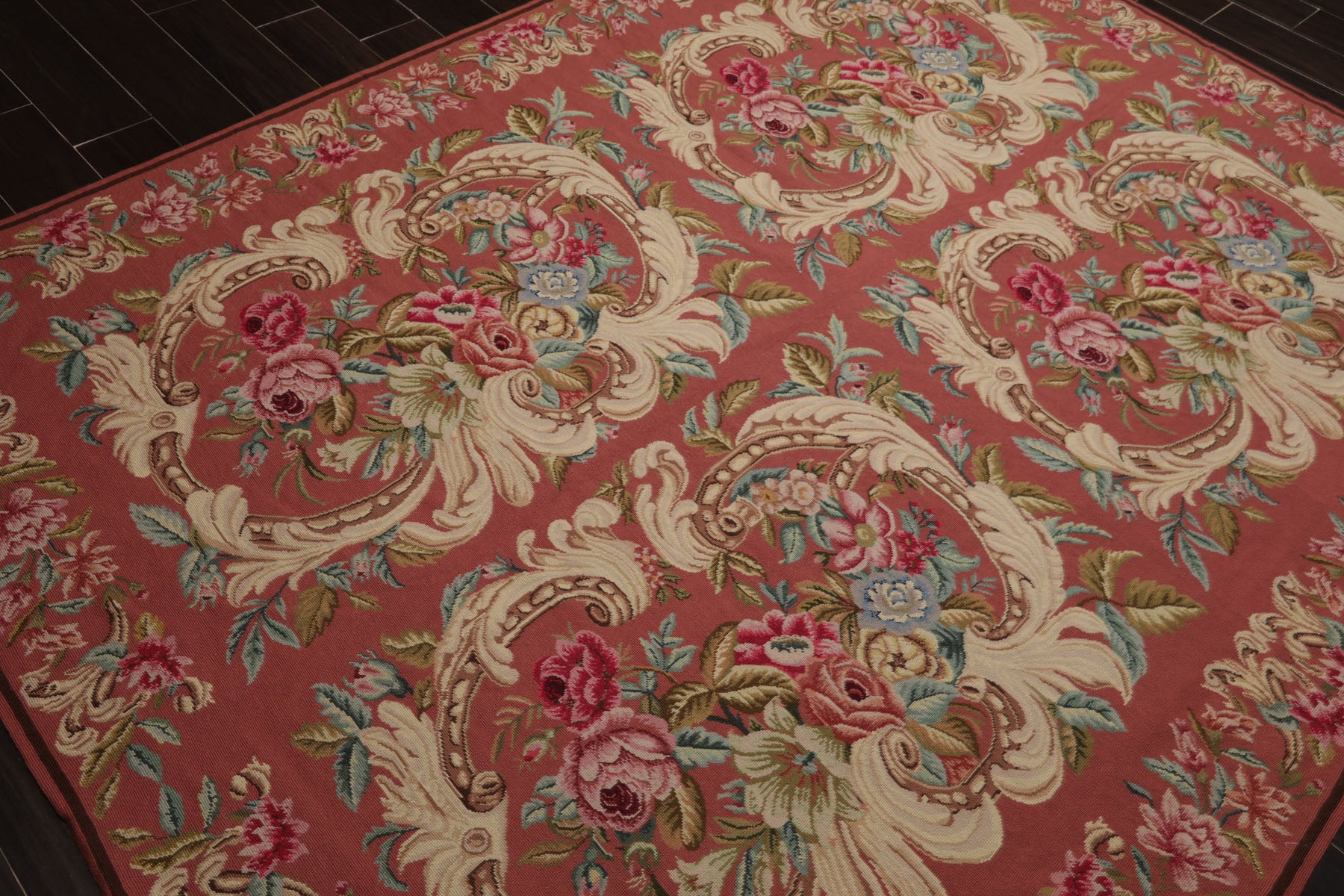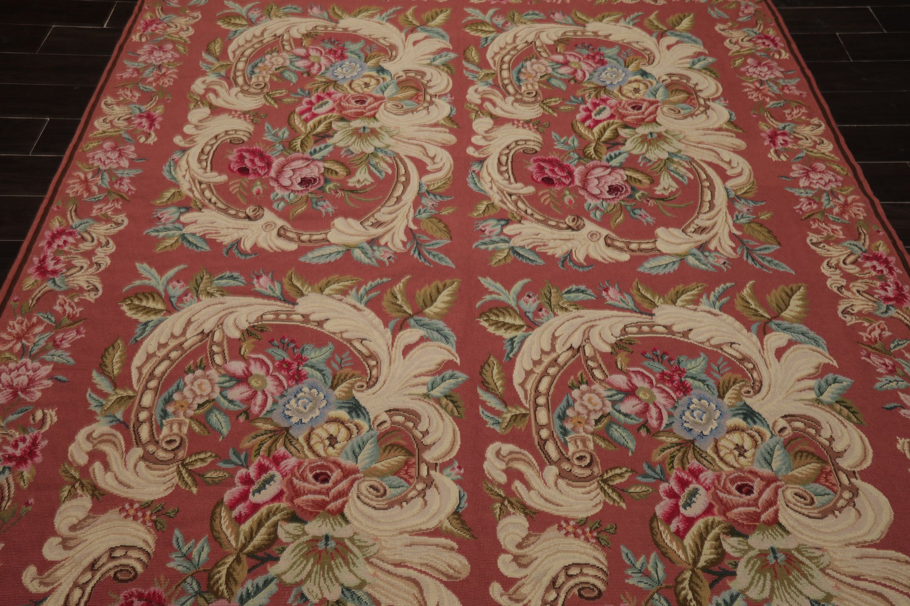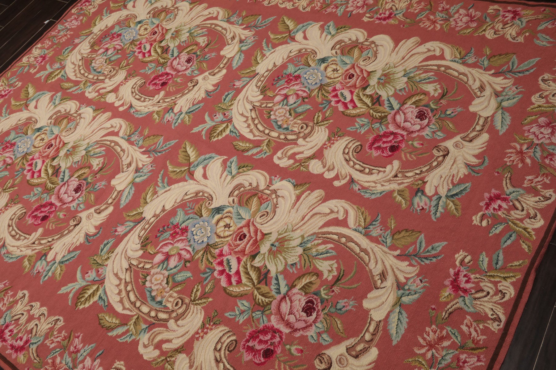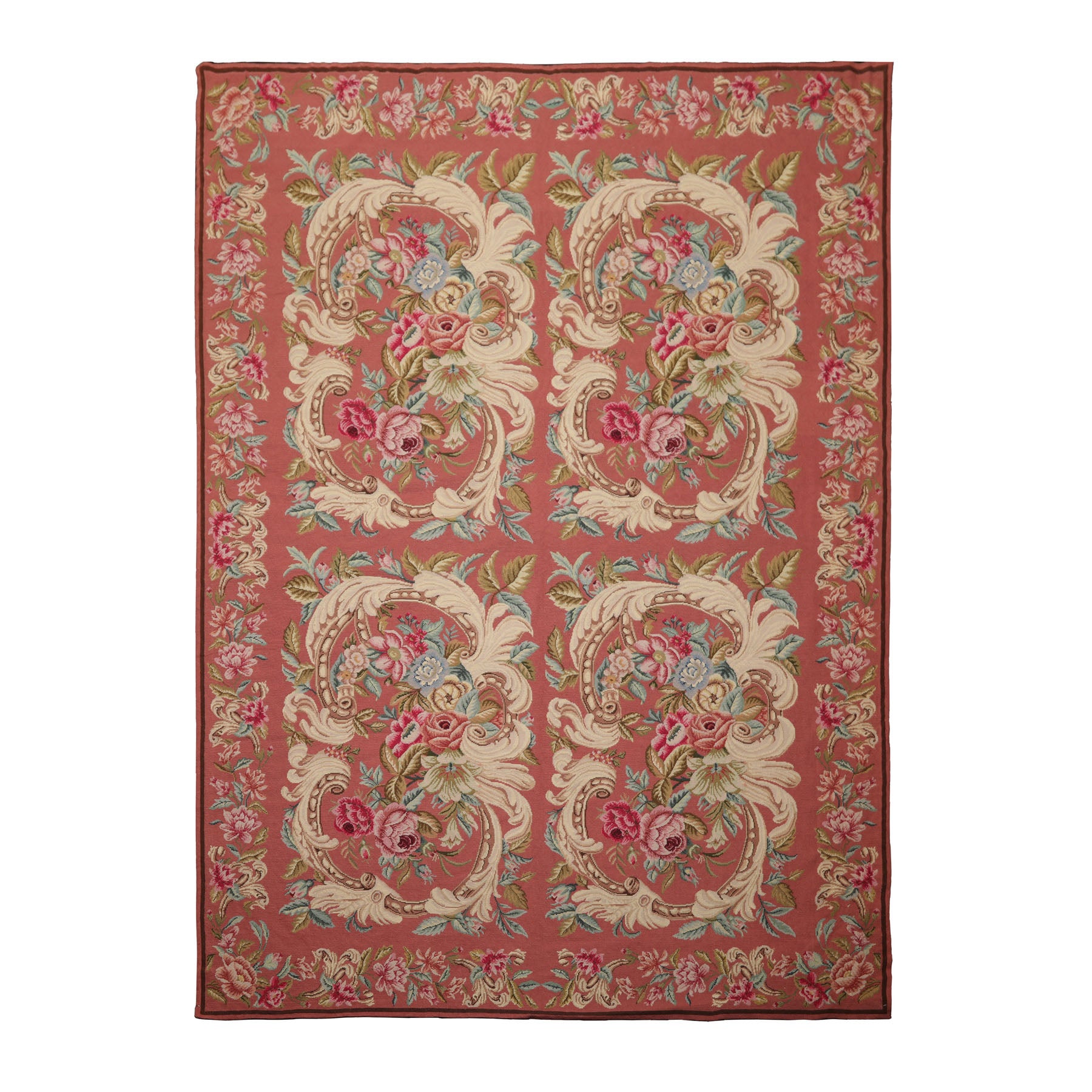 Elegance unfolds in this rose-toned French needlepoint rug, where scrolling ivory flourishes embrace clusters of pink, aqua, and blue florals. The delicate border completes the design, offering timeless refinement. Woven in China with a low-profile 0.1" pile, it highlights meticulous craftsmanship and enduring beauty. A versatile work of decorative art, it functions as both a floor covering and a wall tapestry, embodying tradition and refinement.