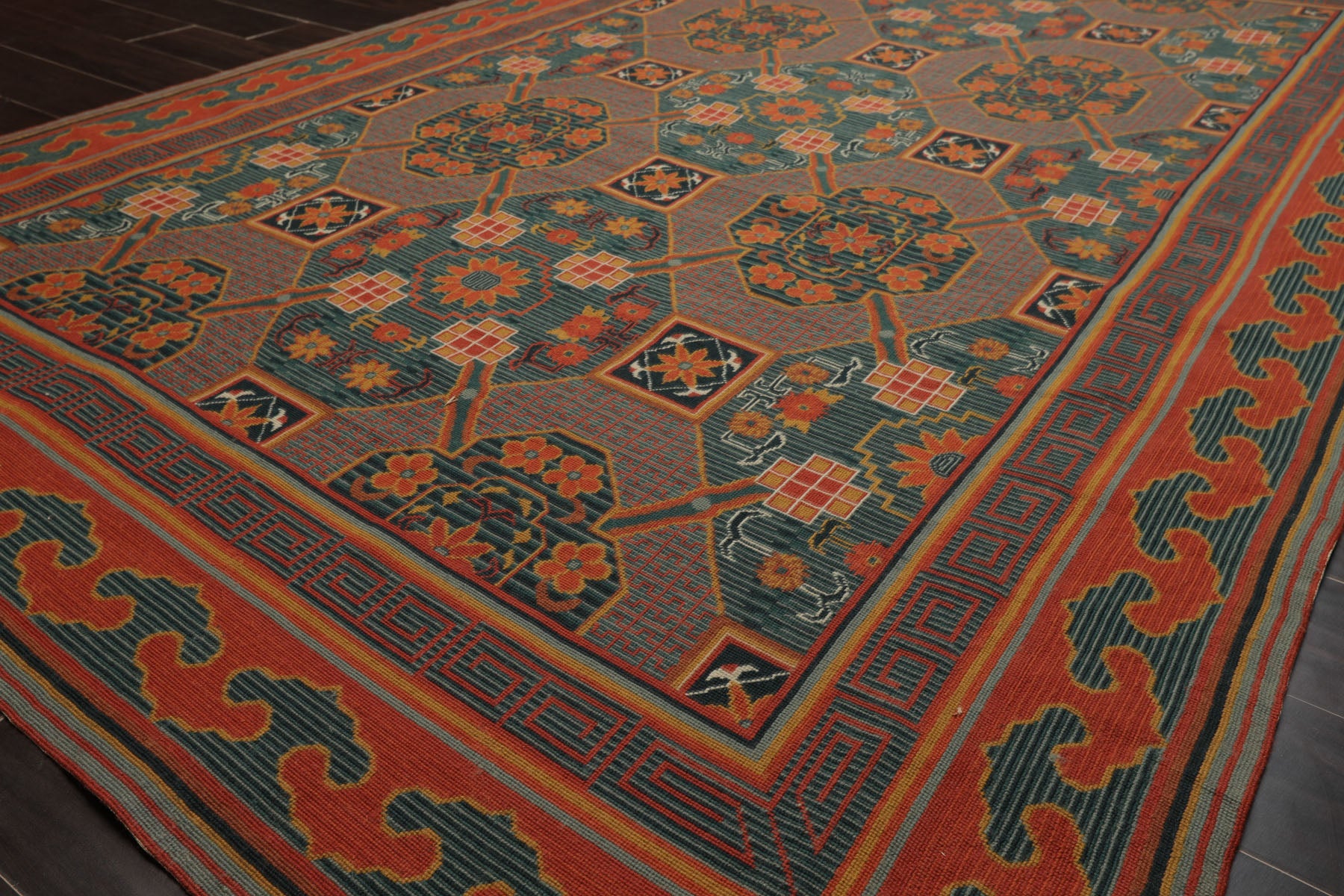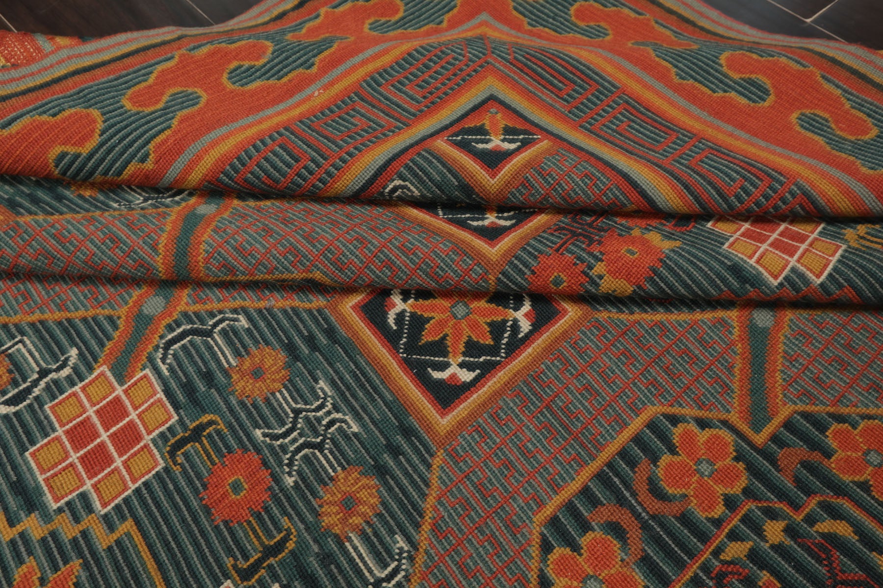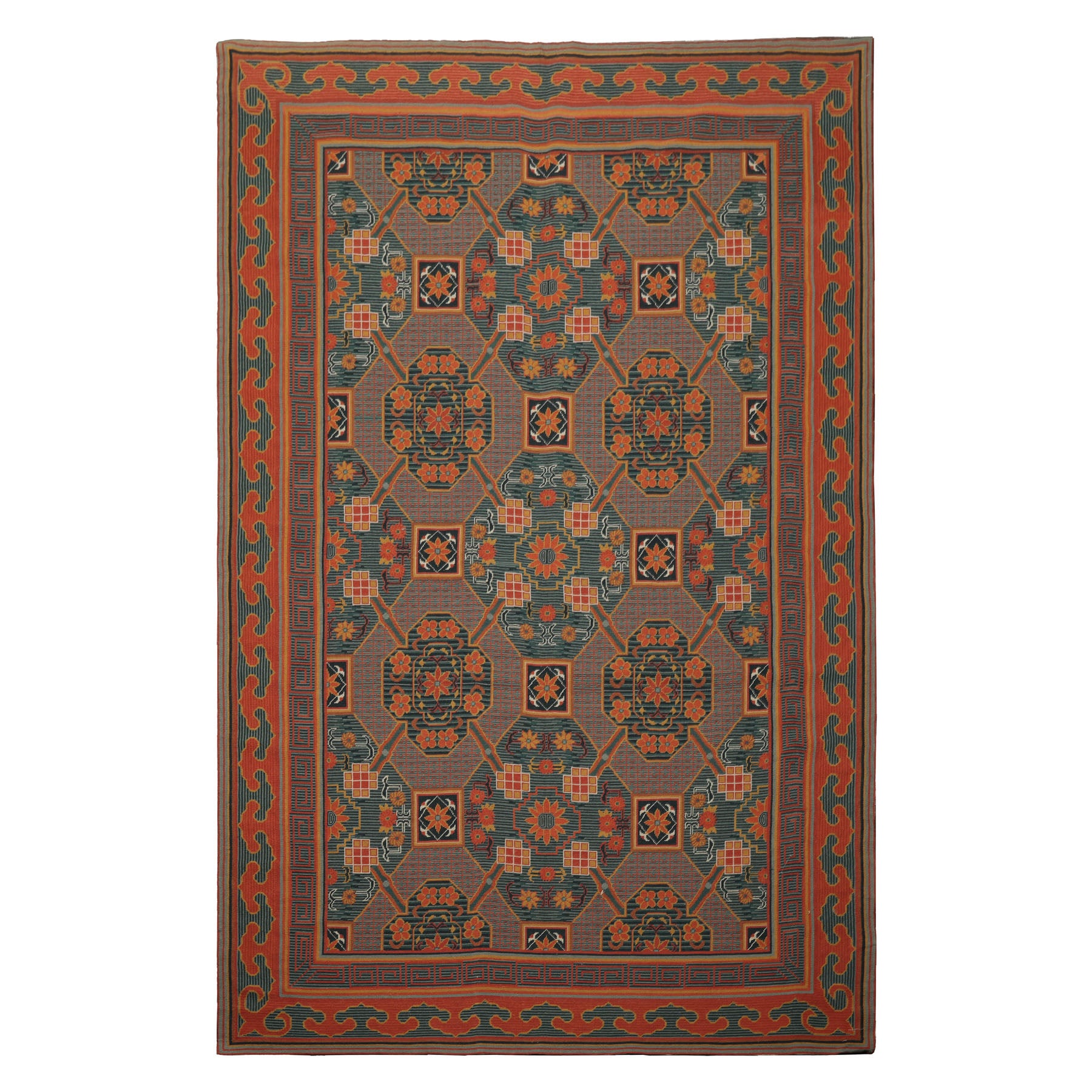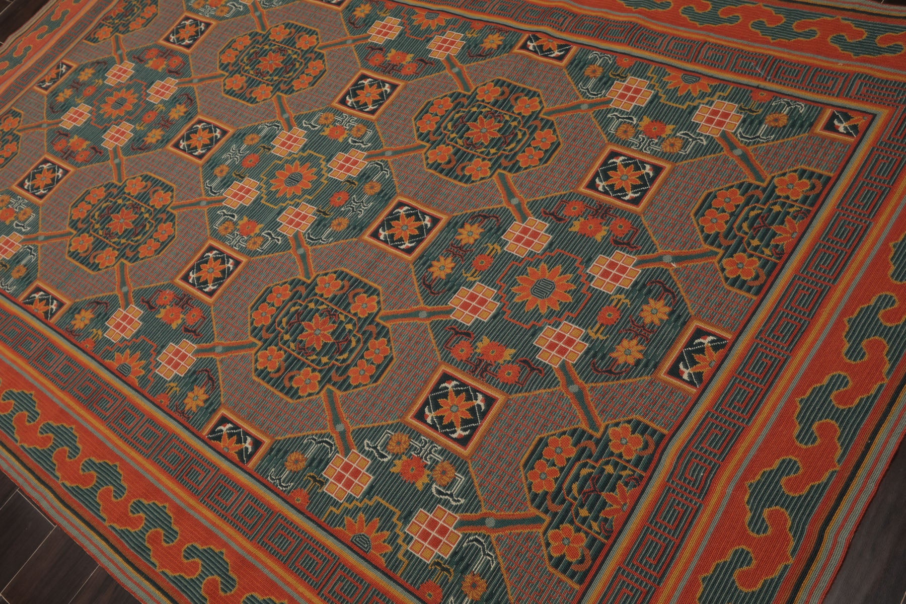 A striking mix of teal and orange against ivory defines this French needlepoint flatweave, showcasing Art Deco-inspired floral patterns with timeless appeal. Its flat 0.1" wool pile offers durability and versatility, making it practical for layering or standalone display. Perfect for transitional interiors, the rug adds warmth and vibrancy while keeping a sophisticated, European-inspired edge.