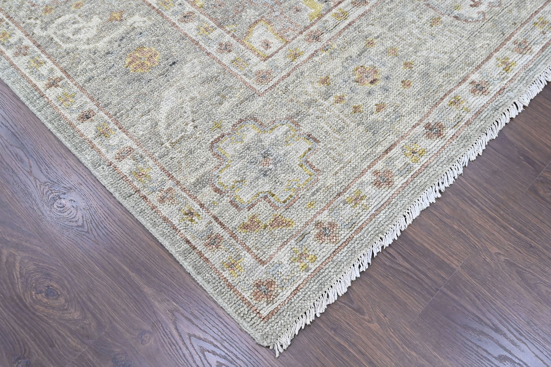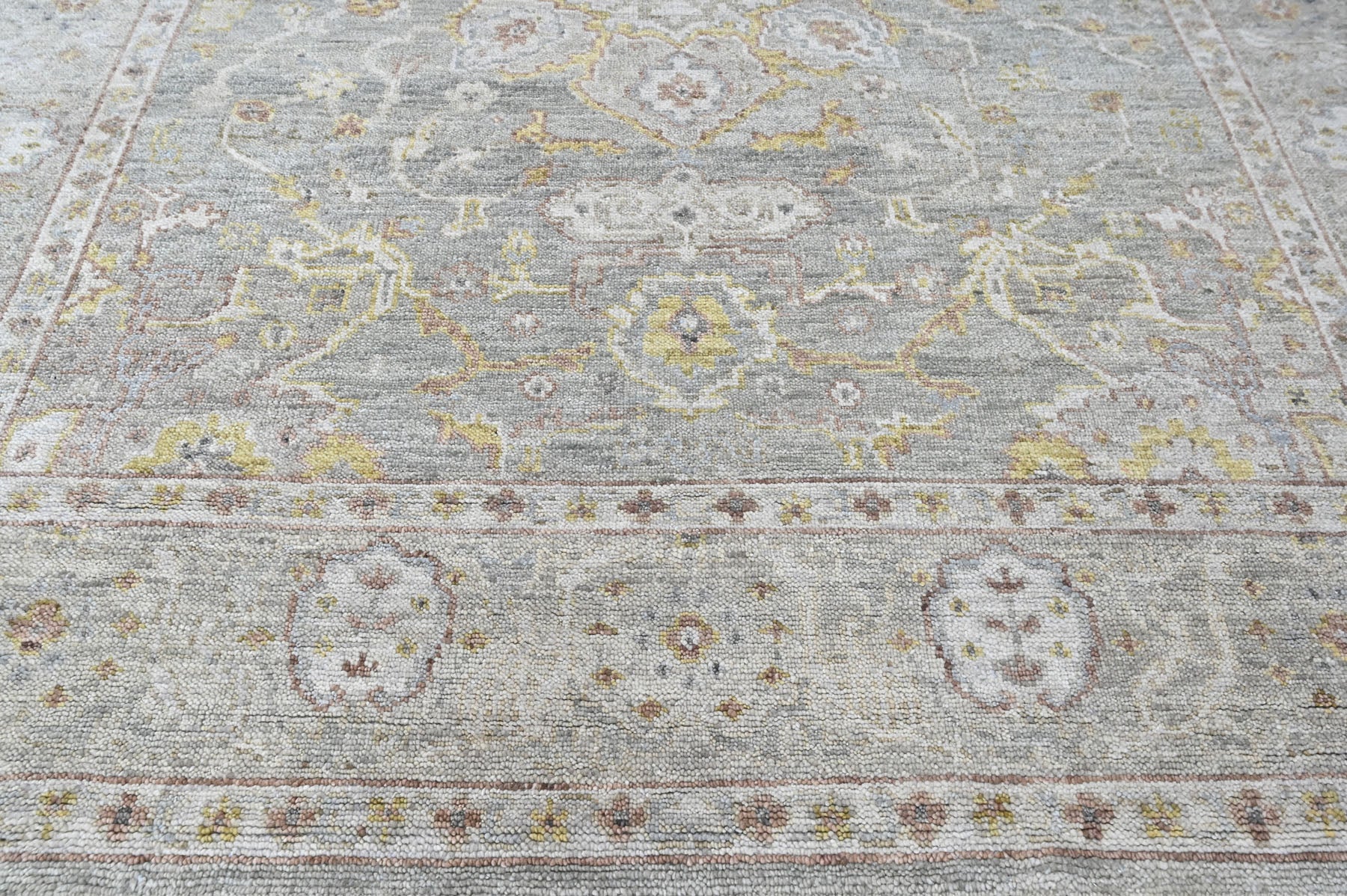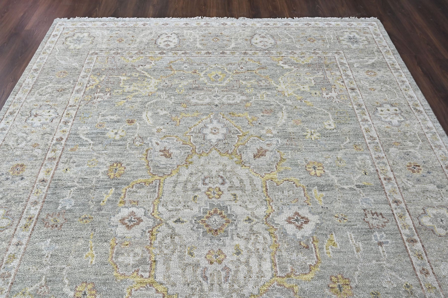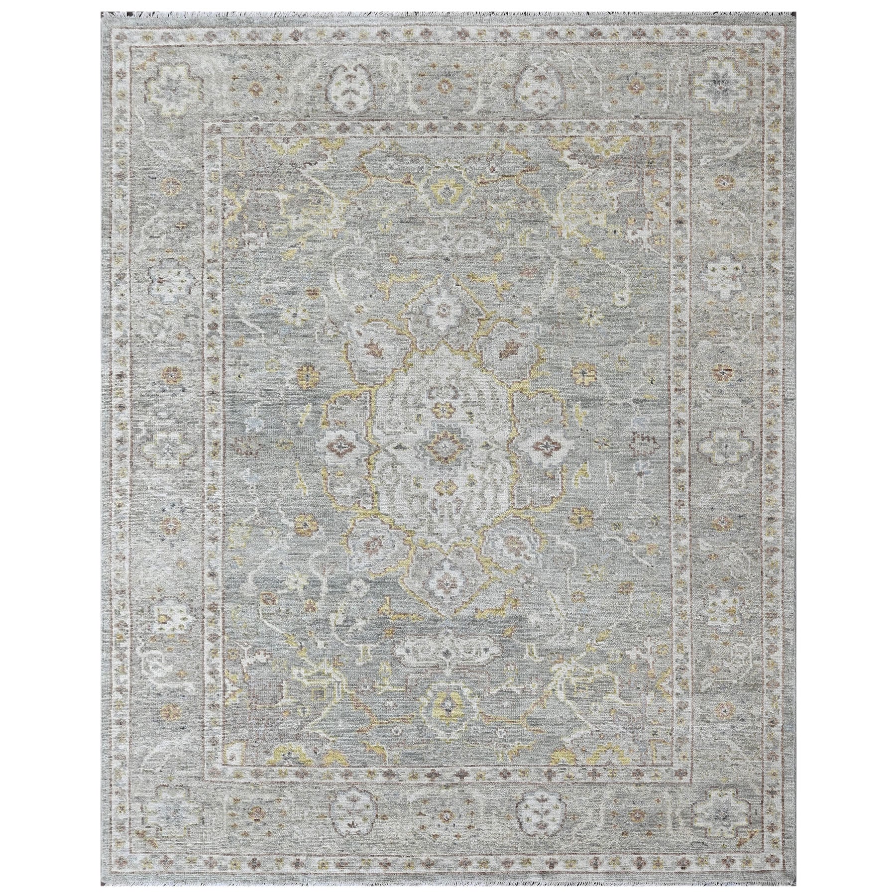 Anchored in refined transitional design, the 9x12 hand knotted wool gray transitional rug is crafted with a medium pile on a durable cotton foundation, offering a sophisticated balance of softness, structure, and longevity. The rug’s composition is organized around a subtle central medallion that draws from classical Persian floral traditions, softened and slightly abridged to create a calm, contemporary presence rather than a bold focal point. A layered gray field forms the foundation of the design, nuanced with tonal variations that give the surface depth and a gently aged character, while accents of light gold trace the medallion contours and scrolling vinework with understated warmth. Delicate floral rosettes and palmette motifs are interspersed throughout the field in muted gold and moss tones, lending a natural, organic rhythm without visual clutter. The border echoes the interior language with finely detailed floral elements rendered in complementary shades of gray, gold, and soft neutral highlights, framing the rug with quiet definition rather than contrast. Harmonious in palette and restrained in pattern, this rug is especially well suited for living rooms, bedrooms, or open-plan spaces where a serene, layered foundation is needed to complement both modern and classic interiors without overpowering the room.