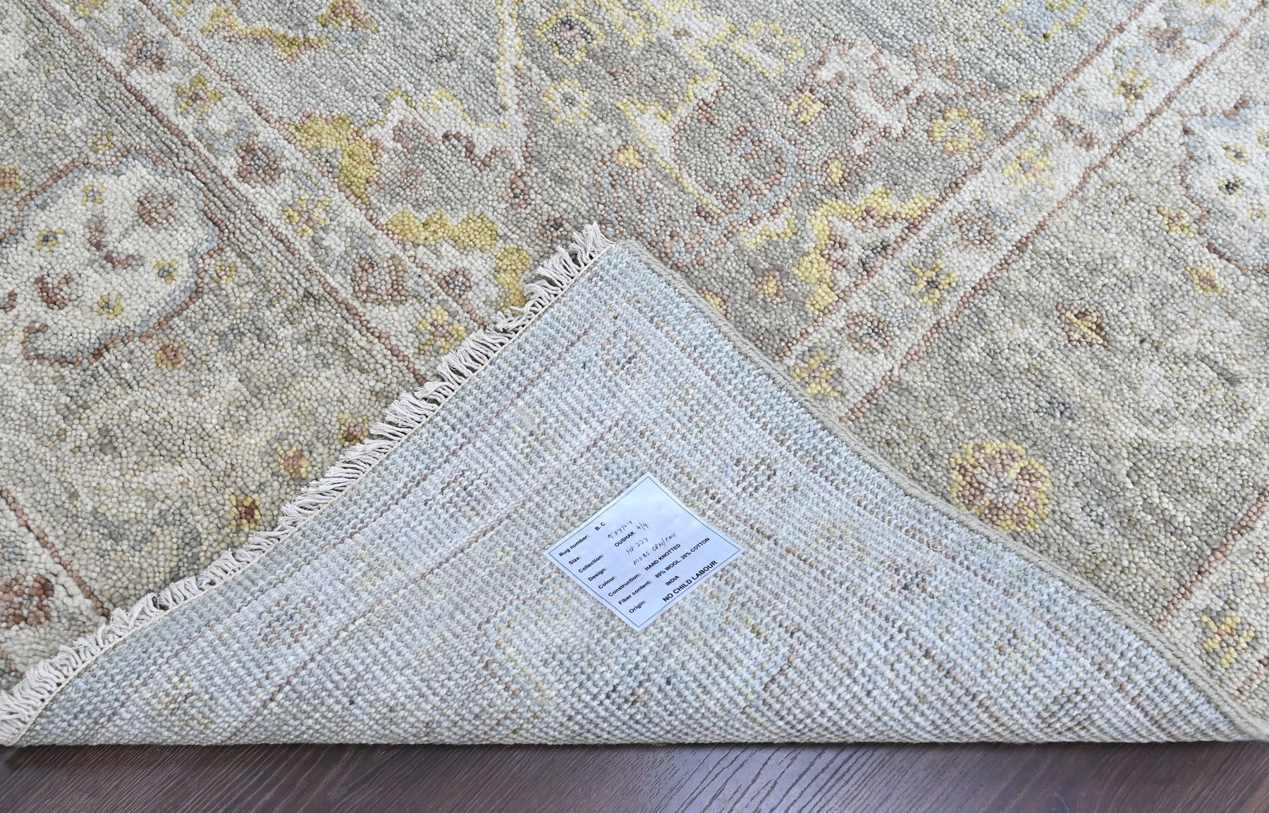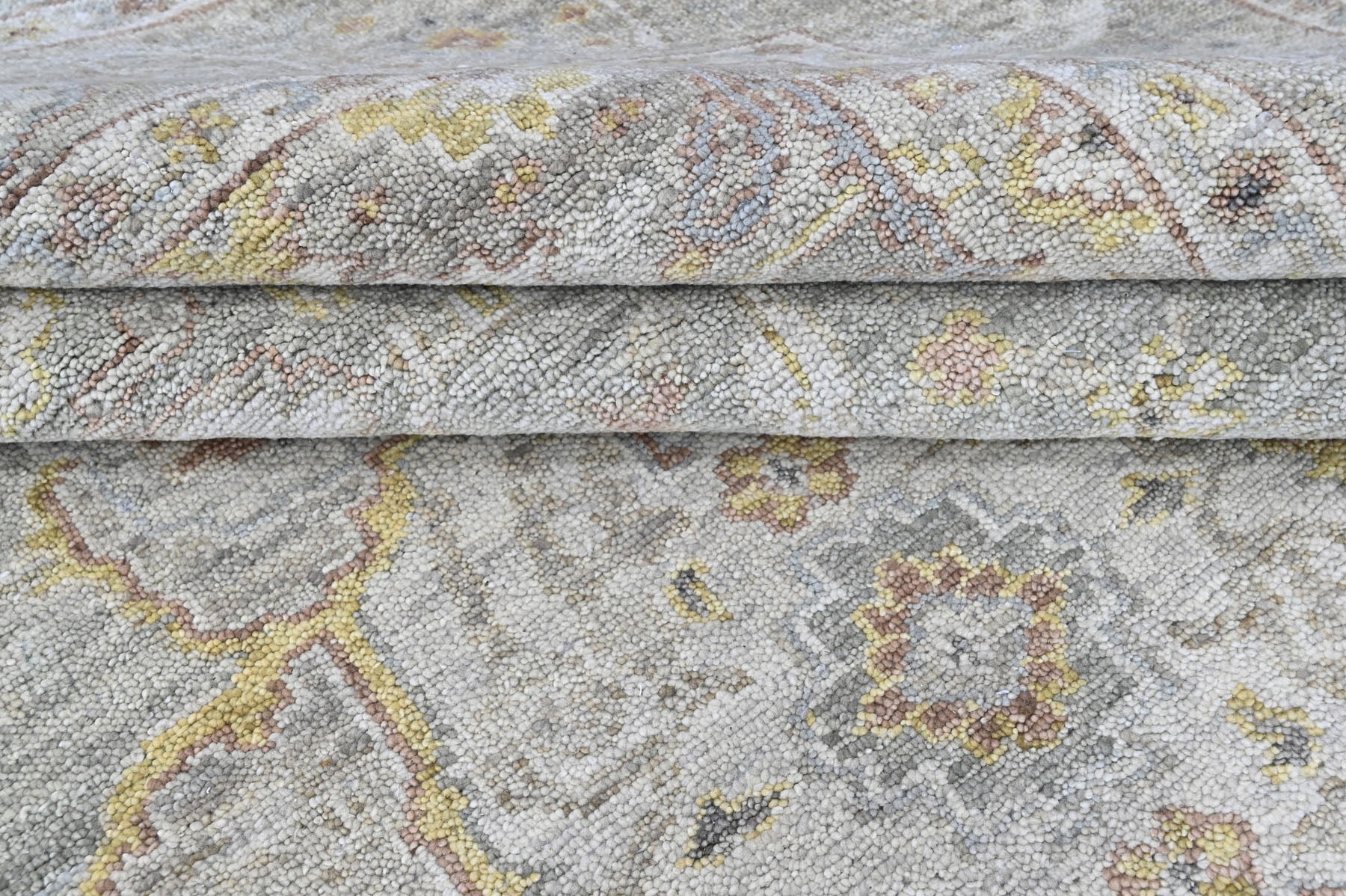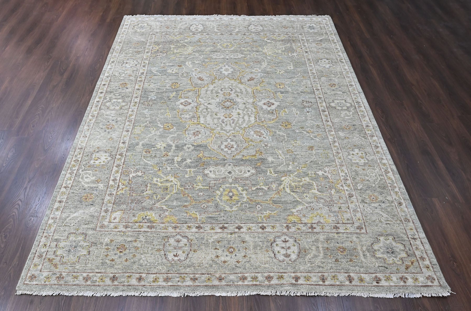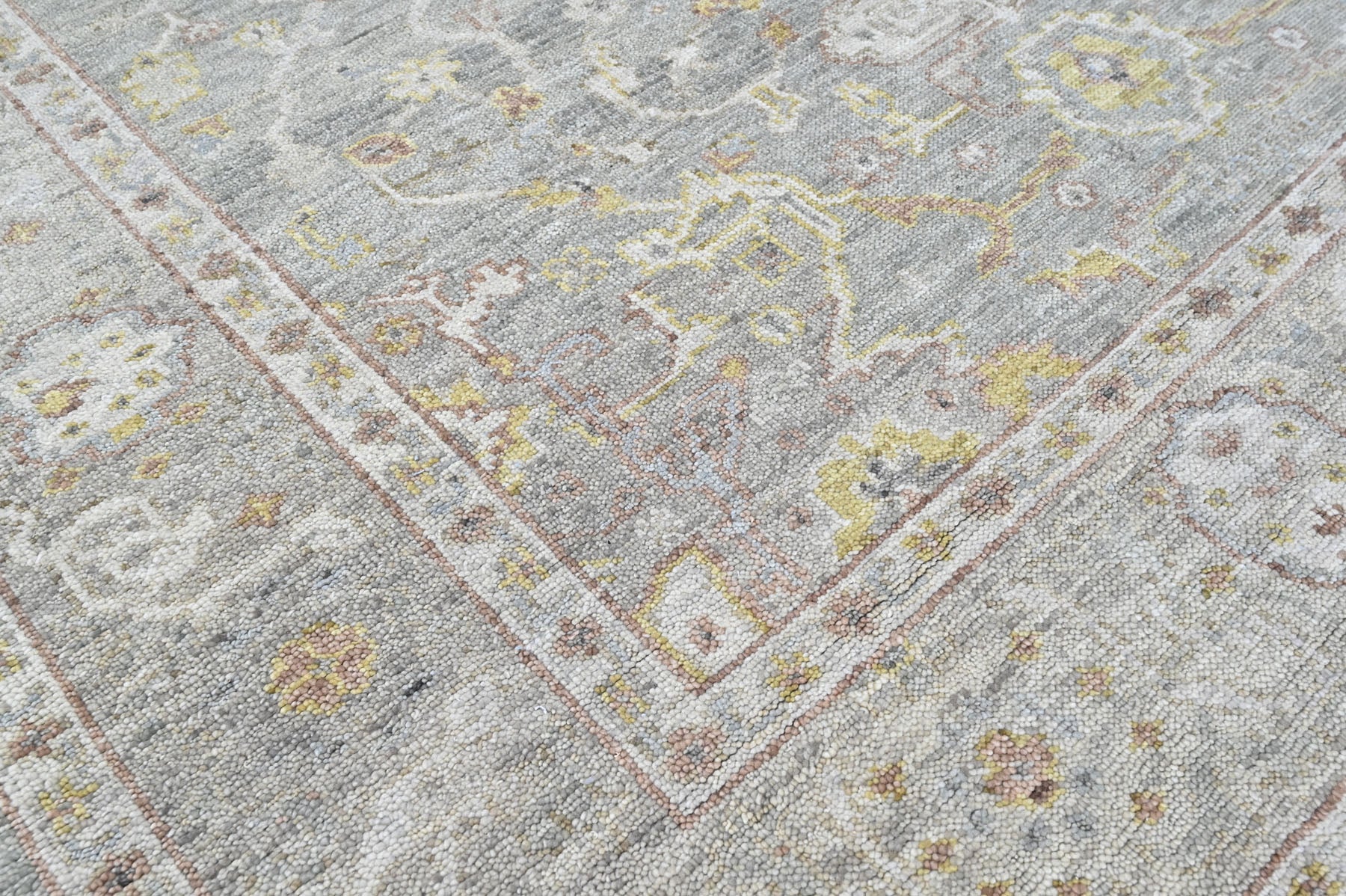 Anchored in refined transitional design, the 9x12 hand knotted wool gray transitional rug is crafted with a medium pile on a durable cotton foundation, offering a sophisticated balance of softness, structure, and longevity. The rug’s composition is organized around a subtle central medallion that draws from classical Persian floral traditions, softened and slightly abridged to create a calm, contemporary presence rather than a bold focal point. A layered gray field forms the foundation of the design, nuanced with tonal variations that give the surface depth and a gently aged character, while accents of light gold trace the medallion contours and scrolling vinework with understated warmth. Delicate floral rosettes and palmette motifs are interspersed throughout the field in muted gold and moss tones, lending a natural, organic rhythm without visual clutter. The border echoes the interior language with finely detailed floral elements rendered in complementary shades of gray, gold, and soft neutral highlights, framing the rug with quiet definition rather than contrast. Harmonious in palette and restrained in pattern, this rug is especially well suited for living rooms, bedrooms, or open-plan spaces where a serene, layered foundation is needed to complement both modern and classic interiors without overpowering the room.