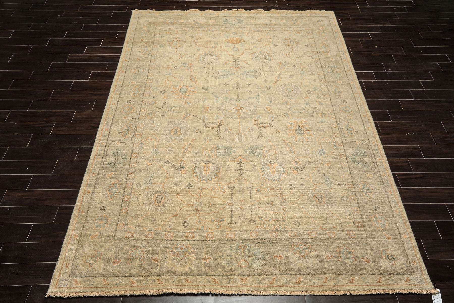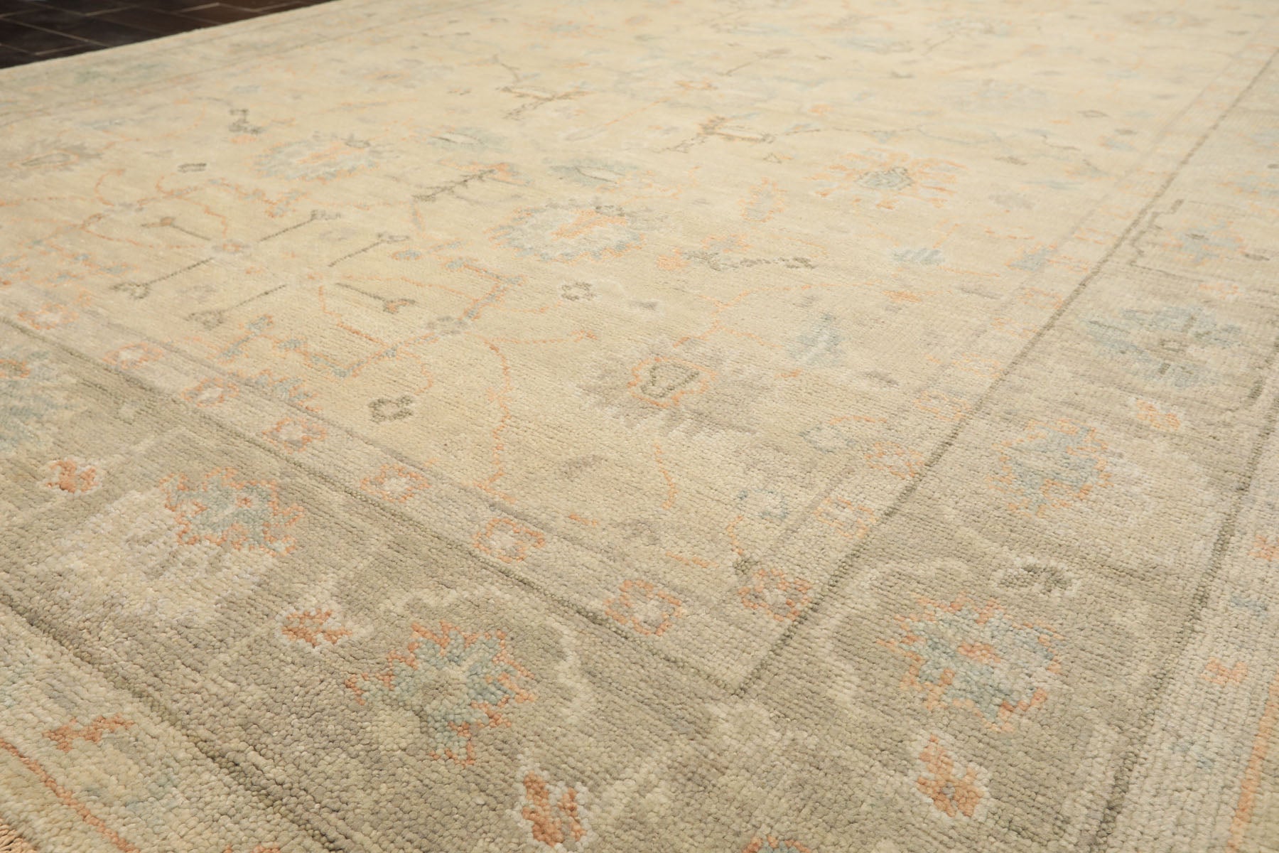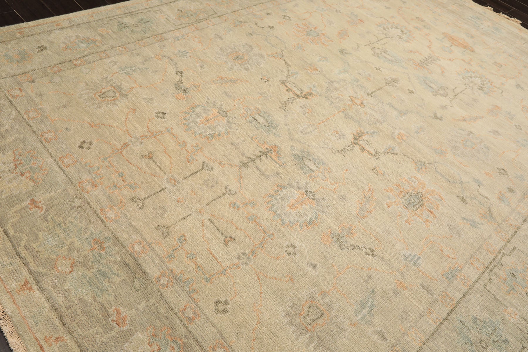 Discover the tranquil beauty of Turkish Oushak weaving paired with Arts & Crafts design principles in this captivating 8'6''x11'6'' hand-knotted rug that brings a sense of calm sophistication to any space. The distinctive faded mint green rug field creates a soft, ethereal backdrop for a wonderfully open and airy design featuring scattered botanical motifs including stylized trees, delicate flowering sprigs, and abstract floral forms rendered in muted tones of beige, peach, gray, and taupe that seem to float across the surface with painterly grace. The minimalist approach to decoration allows generous negative space throughout the field, creating a meditative quality that's both restful and visually interesting, while the organic placement of motifs reflects the Arts & Crafts philosophy of honoring natural forms and handcrafted imperfection. A subtle border in complementary beige and soft green tones frames the composition with understated elegance, featuring its own arrangement of delicate floral and geometric elements that enhance without overpowering the serene central design. Masterfully hand-knotted with 100% wool cut pile on a cotton foundation using techniques characteristic of the Oushak tradition, this rug delivers exceptional softness underfoot while ensuring durability that will serve your home beautifully for years to come.