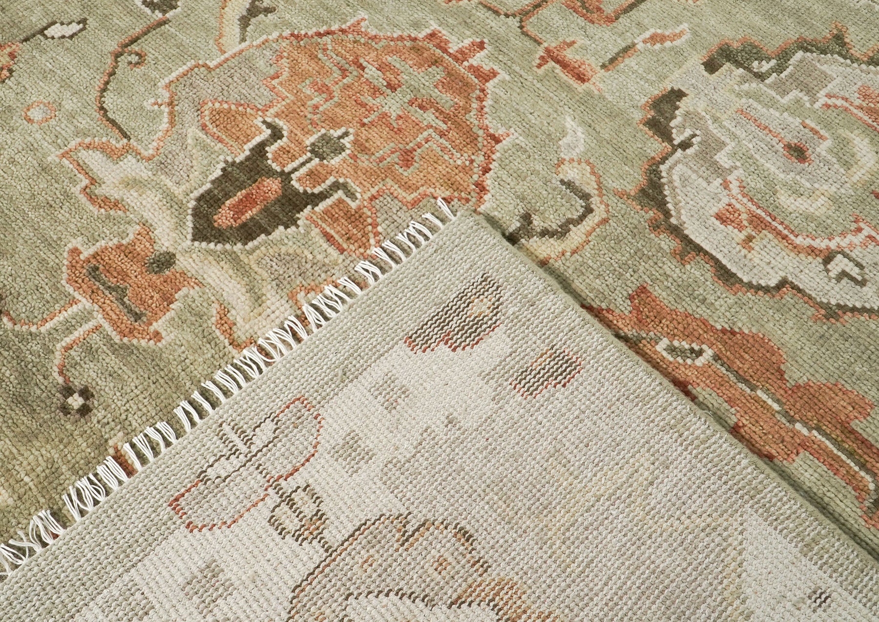 This exceptional hand-knotted Oushak rug embodies the timeless elegance of Arts and Crafts design with its sophisticated sage green field that serves as a canvas for an enchanting all-over pattern. Meticulously woven from premium wool on a cotton foundation, the piece features gracefully flowing botanical motifs and medallions in a refined palette of peach, soft pink, gray, and beige that create a wonderfully organic aesthetic. The rug’s design showcases symmetrically placed floral elements and curvilinear forms that echo nature's beauty, while subtle color variations add depth and visual interest throughout. Each hand-tied knot reflects masterful craftsmanship, resulting in a sumptuous texture and heirloom quality that only authentic handmade rugs possess. This versatile piece harmonizes effortlessly with both vintage-inspired and contemporary interiors, offering a perfect balance of understated sophistication and artistic expression. Add this stunning work of textile art to your collection and enjoy its enduring beauty for years to come.
