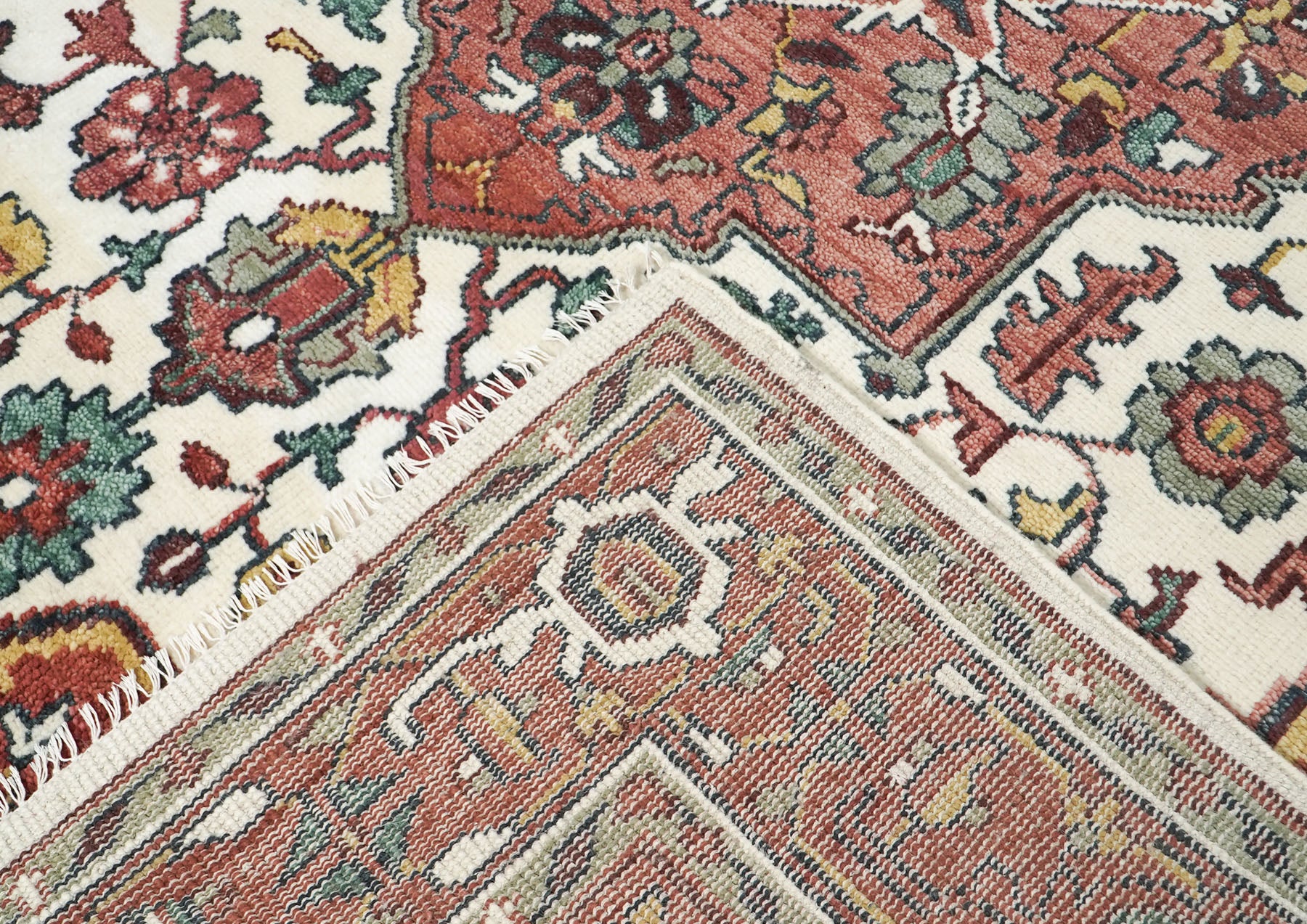 Anchored by a striking central medallion design, this hand-knotted Oushak delivers the classic elegance and intricate detail that defines timeless Persian-inspired artistry. The warm rose and rust tones create an inviting foundation while an elaborate ivory field medallion bursts with geometric precision and botanical flourishes, framed by delicate spandrels and complementary corner motifs that complete the symmetrical composition. Jewel-like accents of gold, teal, and charcoal enhance the visual richness, adding layers of depth and sophistication that reward closer inspection while maintaining overall harmony. Every inch of this rug reflects the painstaking craftsmanship of skilled weavers who have mastered the demanding Tabriz knotting technique, resulting in exceptional detail clarity and a dense, luxurious pile that feels as magnificent as it looks. The traditional medallion format provides a focal point that naturally anchors furniture arrangements and draws the eye, making it effortless to build a cohesive interior design around this statement piece. Hand-knotted from premium wool on a sturdy cotton foundation, this investment delivers the durability and longevity you'd expect from authentic artisan quality, standing up beautifully to years of daily use.
