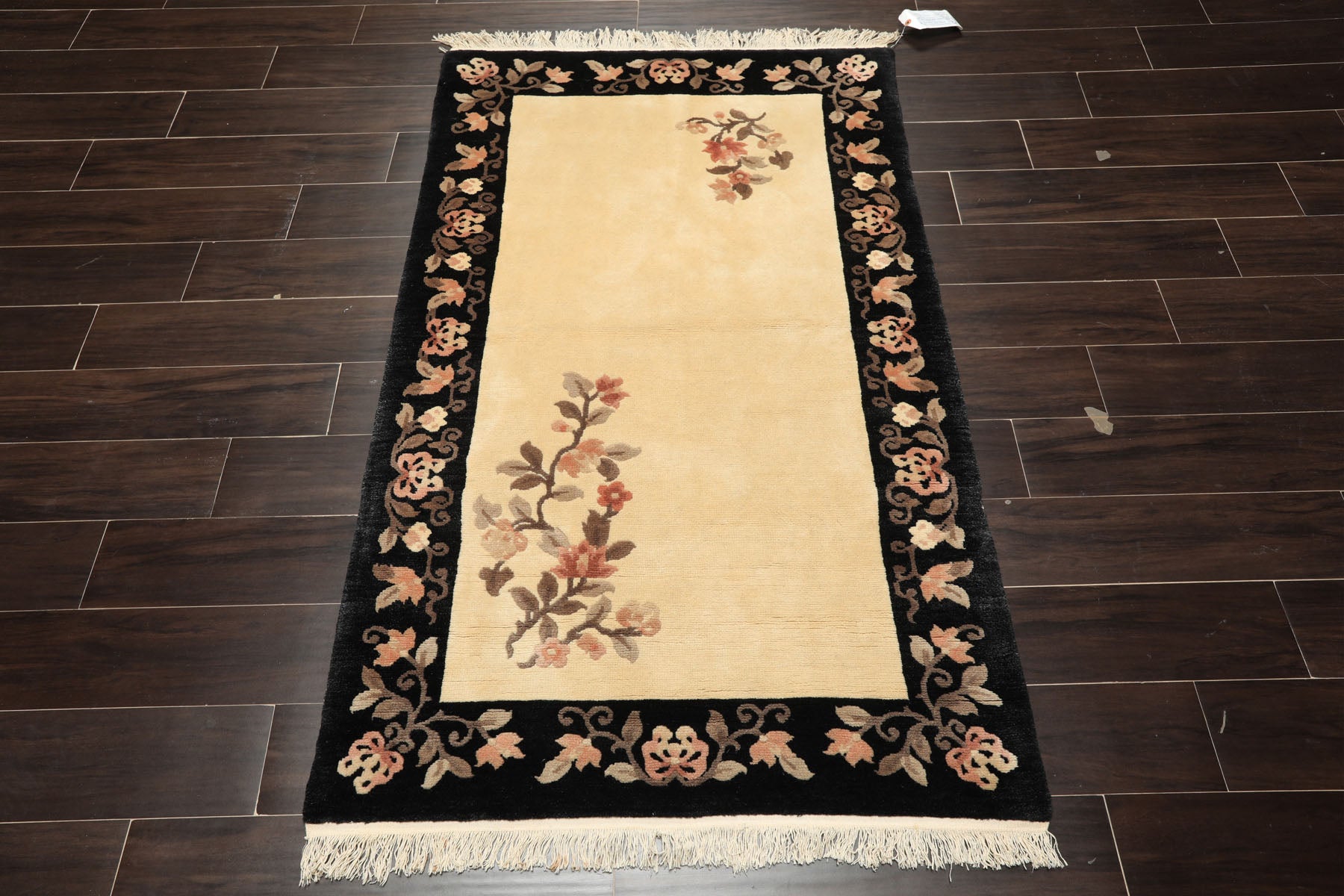 Quiet elegance and refined contrast define this 3x5'3'' hand knotted Chinese Art Deco rug, designed to elevate smaller spaces with timeless appeal. Crafted in fine wool with a smooth cut pile, the rug features delicate botanical sprigs set against an open beige field, framed by a charcoal border adorned with soft floral detailing. Accents of blush, rust, brown, and multi-tonal hues add warmth and subtle depth without overpowering the composition. The silky sheen and velvety-soft texture enhance its luxurious feel, while a cotton foundation ensures durability. Ideal for entryways, reading corners, or beside a bed, this rug works beautifully in traditional or transitional interiors that value balance, restraint, and artisanal detail.