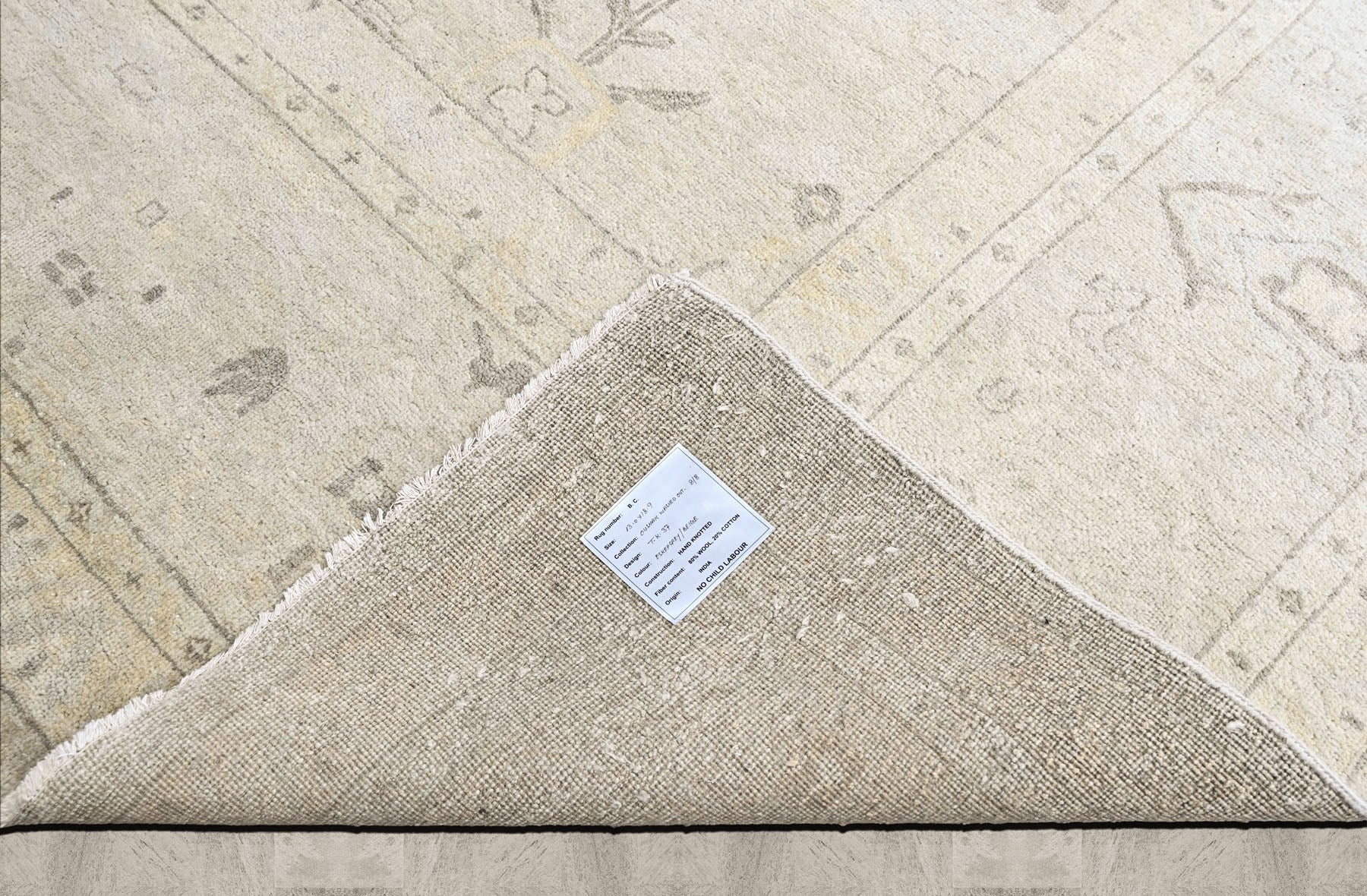 Rooted in a refined interpretation of classical carpet traditions, the 13' x 19' hand-knotted wool rug presents a transitional design that thoughtfully distills historic motifs into a calm, contemporary composition. The rug field is organized around a loose, allover pattern inspired by early Persian and Anatolian village rugs, where small-scale floral rosettes, abstracted palmettes, and symbolic geometric forms are evenly dispersed rather than centered around a dominant medallion. These motifs appear intentionally softened and slightly faded, echoing the aesthetic of naturally aged textiles. Rendered in a restrained palette of beige and gray with layered muted earth tones, the design relies on tonal contrast rather than bold color shifts, allowing the patterns to surface gently through subtle variations in shade and texture. Delicate vine-like elements and angular botanical forms introduce quiet movement across the field, while a lightly defined border of repeating minimalist motifs in complementary neutrals frames the rug without overpowering the interior design. The result is a balanced, scholarly composition that feels both timeless and livable, making this rug especially well suited for large living rooms, formal sitting areas, or open-plan spaces where an understated foundation with depth and cultural nuance is desired.