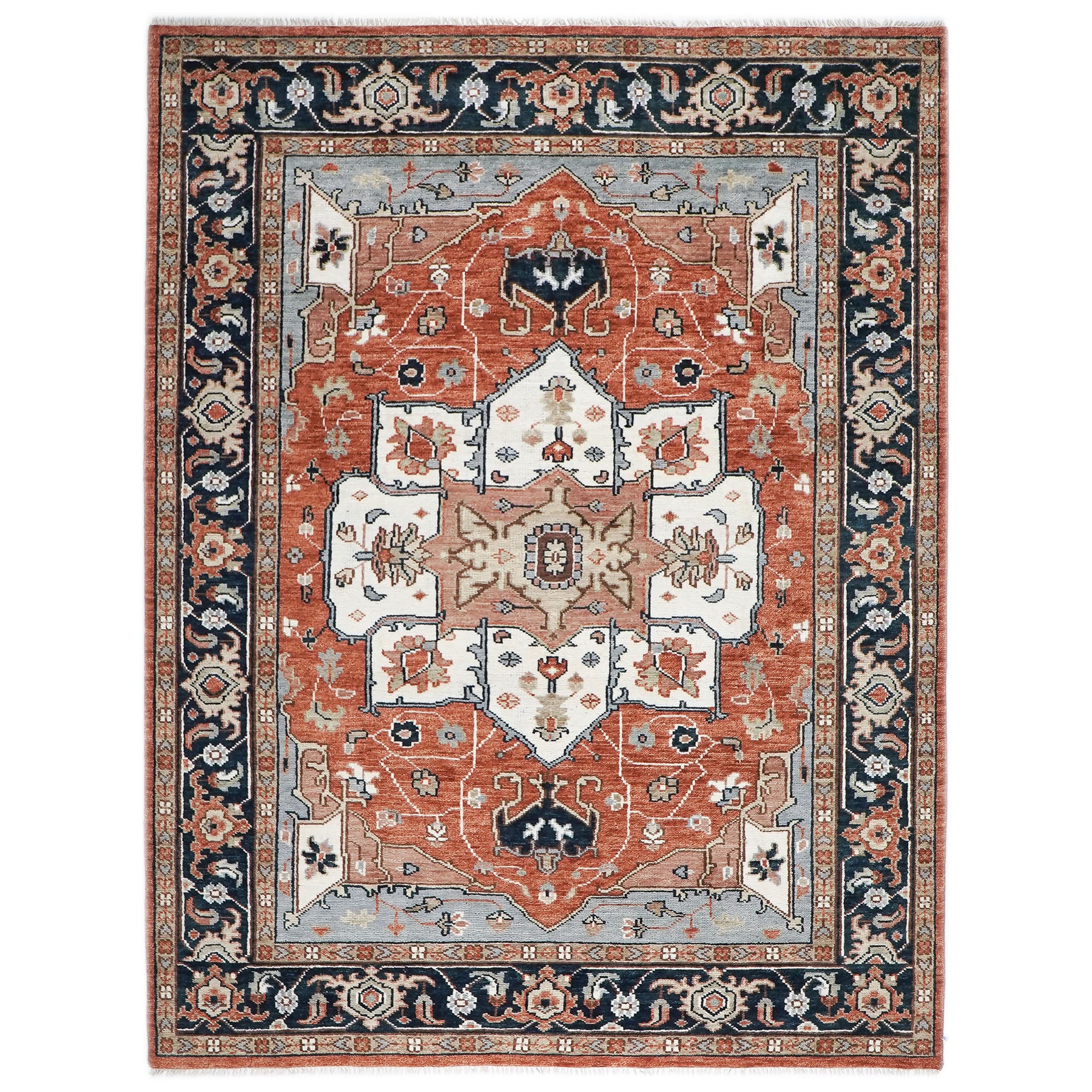 Inspired by the architectural grandeur of Heriz design, this hand-knotted Oushak rug makes an unforgettable impression with its vibrant burnt orange field and dramatically scaled medallion composition. The warm terracotta background serves as a luminous stage for an elaborate ivory star medallion featuring a peachy-tan center, creating a layered focal point that anchors the rectangular surface with commanding presence and classical symmetry. Soft blue spandrels grace each corner with refined elegance, while the field is adorned with delicate botanical flourishes and geometric motifs that add texture and visual movement without overwhelming the medallion's bold statement. The deep navy border features graceful vine scrolls and traditional floral patterns that create sophisticated contrast, perfectly balancing the warm interior with cool tonal depth and providing distinguished framing. Hand-knotted by master artisans using premium wool on a cotton foundation, this piece showcases the precise detailing and superior quality that distinguish authentic handcrafted textiles from machine-made alternatives. The spirited palette of burnt orange and rose accented by navy and soft blue creates warmth and vitality, offering visual impact that transforms ordinary rooms into extraordinary spaces while maintaining timeless versatility. Its luxurious wool pile ensures enduring comfort and resilience, designed to serve beautifully through decades of daily living while developing the rich character that only genuine handwoven rugs achieve over time.