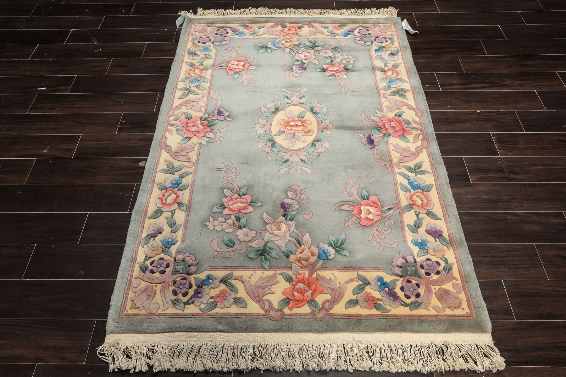 Soft color transitions and graceful floral movement define this 4x6 hand knotted Chinese Art Deco rug, designed to bring quiet elegance into traditional interiors. Crafted from fine wool with a smooth cut pile, the rug features a celadon ground layered with flowing floral motifs and a delicately framed border. Shades of ivory, lavender, rose, taupe, orange, pink, aqua, and multi-tonal accents create a painterly palette with a gentle, airy feel. The silky sheen of the pile highlights the detailing while adding a velvety softness underfoot, and the cotton foundation ensures lasting structure and durability. Ideal for bedrooms, sitting rooms, or refined living spaces, this rug pairs beautifully with classic décor and light, sophisticated furnishings.