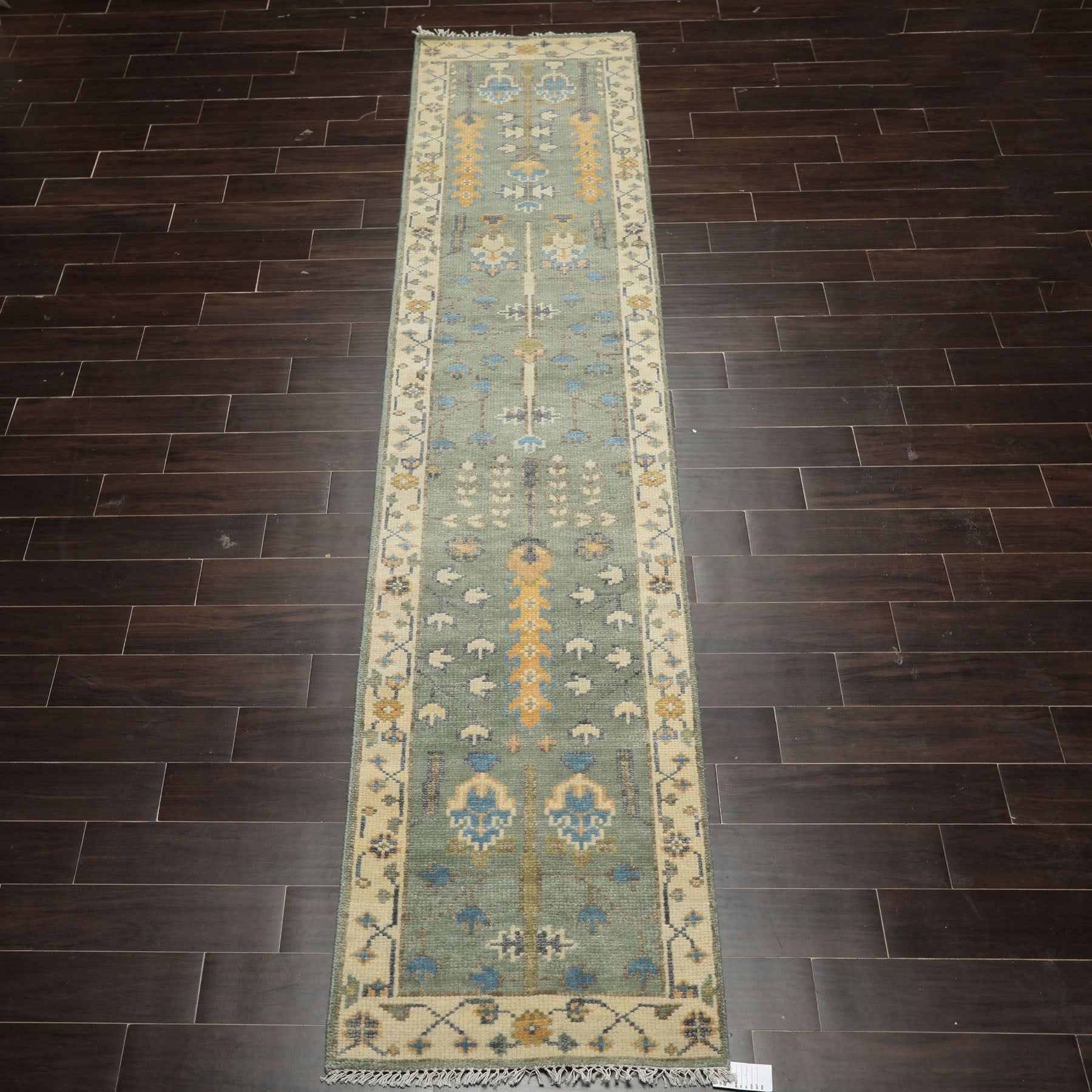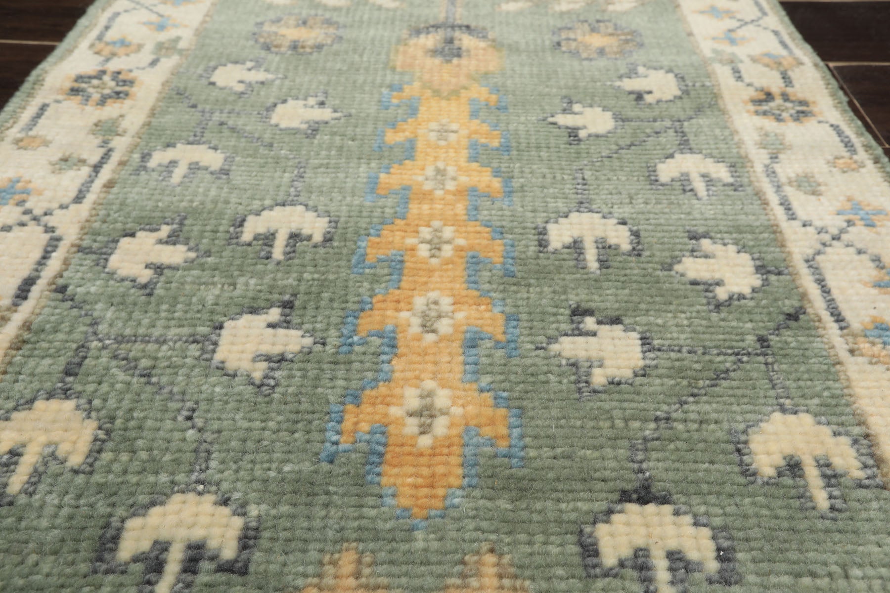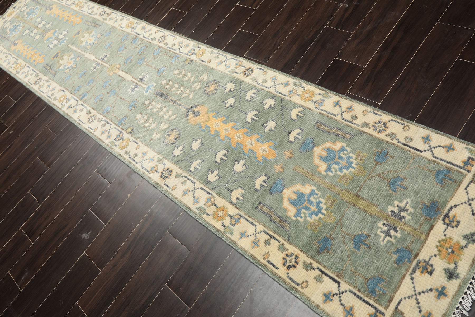 A stunning testament to time-honored Turkish craftsmanship, this hand-knotted wool Oushak runner delights with its muted celadon field presenting a vertical arrangement of starburst medallions and stylized palmettes that unfold gracefully across its twelve-foot expanse. The pattern reveals earthy caramel and gray geometric motifs interspersed with blue floral accents that dance across the sage-toned wool, while ivory botanical elements provide bright punctuation against the soothing, naturally dyed background. Traditional hand-knotting on a dependable cotton foundation provides the superior construction and inviting softness that make authentic Oushak runners treasured heirlooms passed through generations. The understated beige border, featuring abstract floral and angular designs in complementary blue, gray, and caramel hues, establishes a balanced perimeter that respects the runner's narrow dimensions while celebrating its multi-colored complexity. The gentle blend of celadon, sage, caramel, and blue achieves an effortless harmony that complements both modern farmhouse and classic European aesthetics, making it ideal for hallways, mudrooms, or dining spaces craving understated sophistication with artisan appeal. Embrace this handwoven treasure for an investment in quality that rewards with beauty and durability for years to come.