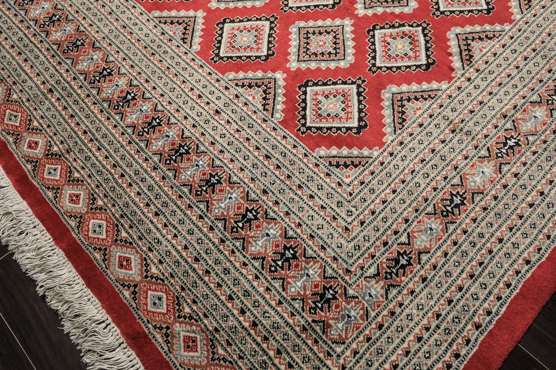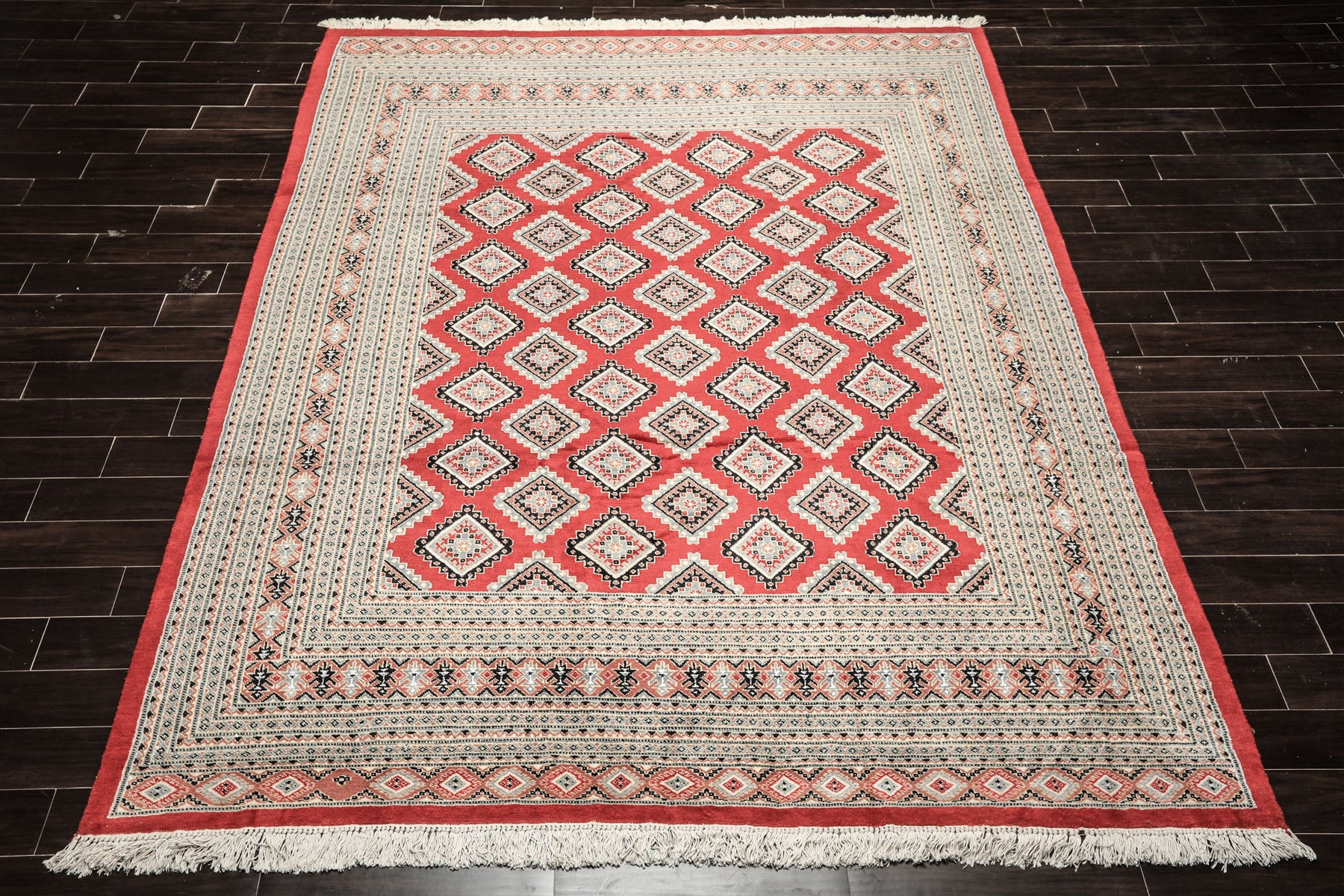 Bokhara design is defined by repetition, geometry, and quiet discipline rather than narrative florals or dramatic medallions. The field of this rug is organized around a rhythmic lattice of geometric motifs, often referred to as ‘guls’, arranged in evenly spaced rows that create a sense of visual order and continuity. These motifs are not meant to be read individually, but collectively, forming a cohesive pattern that feels stable and grounded. The coral and warm orange tones of the field establish a rich yet approachable base, softened by beige, ivory, and dusty rose highlights that prevent the palette from feeling heavy Accents of charcoal, slate, and muted brown provide contrast and definition, outlining the geometric forms and giving them architectural clarity. The borders, like the central field, is layered with smaller repeating motifs that reinforce symmetry and frame the composition. This balance between repetition and restraint is a hallmark of Bokhara design, resulting in a rug that feels composed and timeless rather than decorative for its own sake. This rug is particularly well suited for long living rooms, dining areas, hallways, or offices where its elongated proportions and orderly design can anchor the space. Its warm yet muted palette pairs naturally with wood, leather, and neutral upholstery, while the geometric structure makes it an excellent complement to both traditional and contemporary interiors.