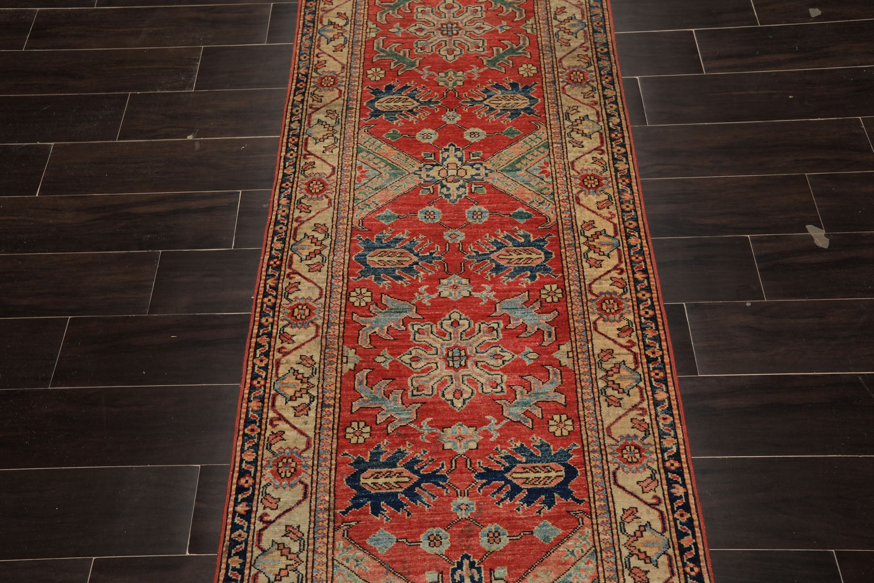 Rooted in bold Caucasian weaving traditions, this 2'8" x 9'9" hand knotted wool Kazak runner features a low pile of approximately 0.25, a sturdy cotton foundation, and a classic traditional medallion layout enriched with strong geometric motifs. Crafted for durability and visual impact, this runner exemplifies the Kazak style’s emphasis on structure, clarity, and expressive color, making it both practical and decorative for narrow spaces.The design is organized around a sequence of elongated geometric medallions running along the length of the runner, a signature Kazak composition that creates rhythm and directional flow. The central field is dominated by a warm coral and orange red ground, which provides a vibrant backdrop for the motifs and immediately anchors the design. The medallions themselves are articulated in aqua and soft green, outlined with navy blue for contrast and definition, giving each form a crisp, architectural presence. Smaller angular accents and symbolic motifs often interpreted as protective or celebratory emblems appear in moss green and deep navy, adding visual texture and cultural depth.Framing the field, the contrasting border is set on a lighter neutral base, populated with repeating geometric rosettes and angular forms in coral, green, navy, and aqua, reinforcing balance while keeping the energy contained. Ideal for hallways, entryways, kitchens, or alongside beds, this Kazak runner brings warmth, tradition, and graphic strength to transitional spaces, pairing especially well with wood floors and both rustic and eclectic interiors.
