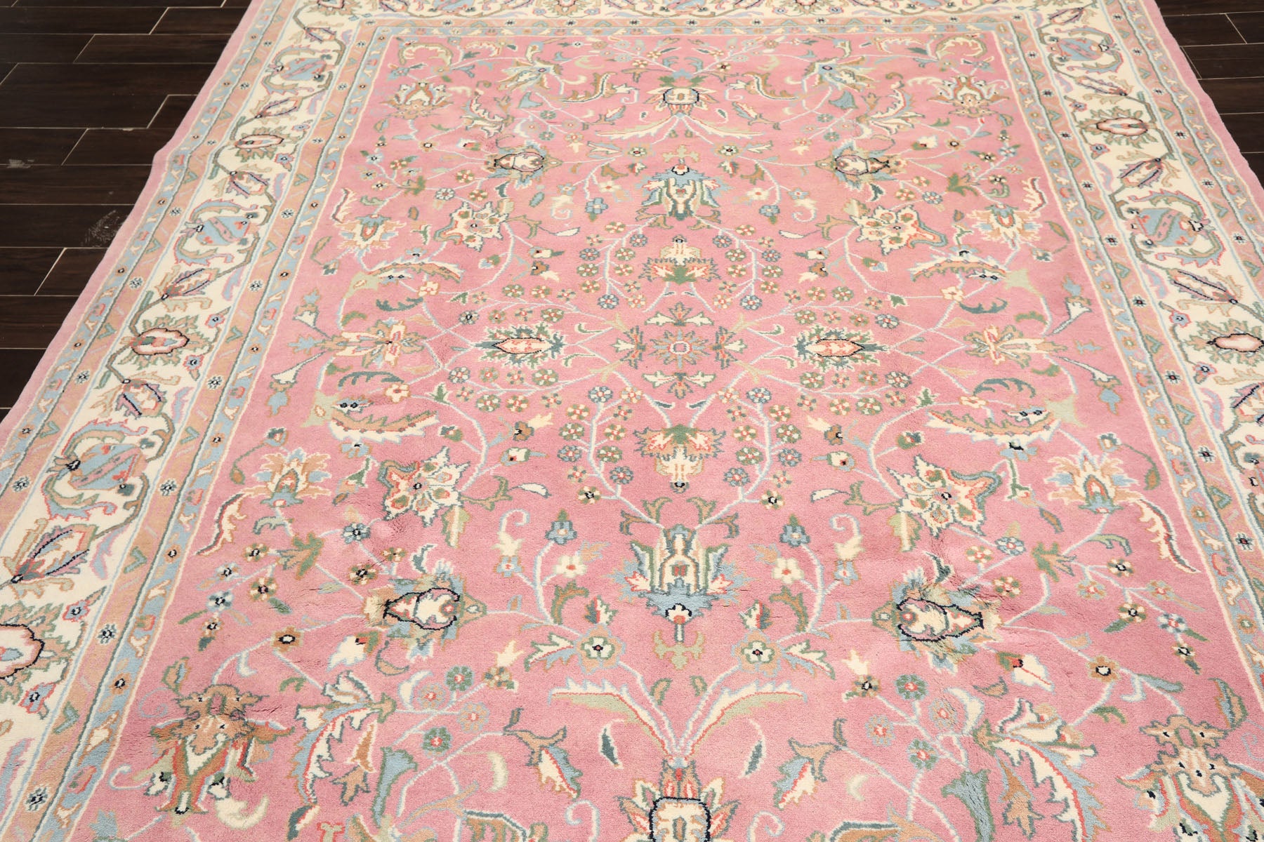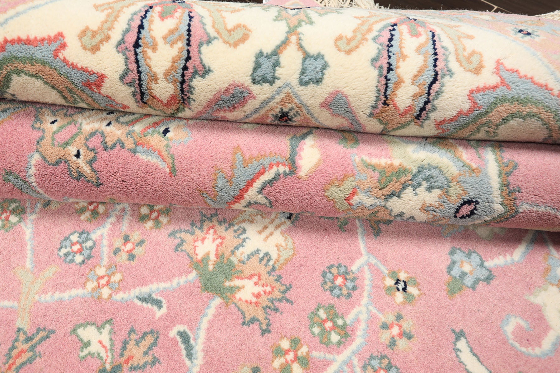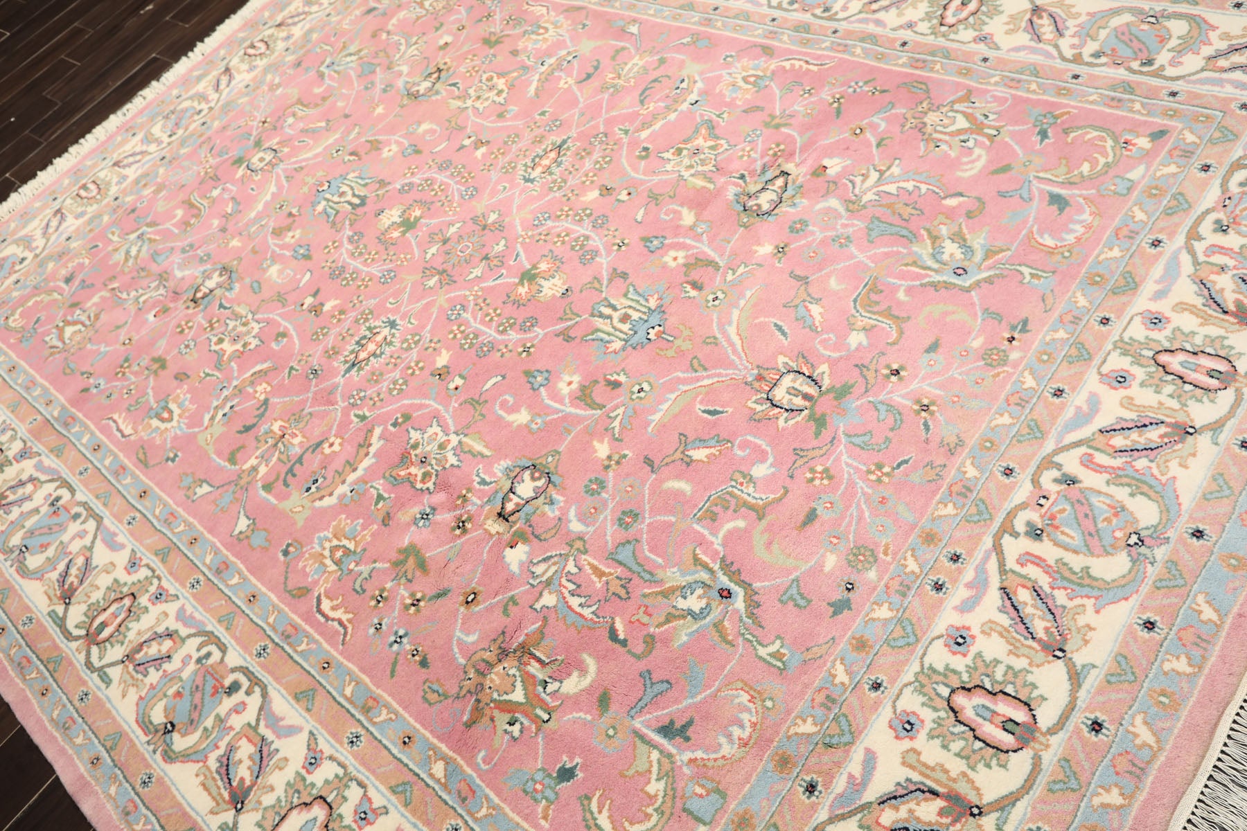 Gracefully woven in the Indo Kashan tradition, this 8' x 10'3" hand knotted wool rug features a high, plush pile of approximatly 0.75 on a cotton foundation, offering a luxuriously velvety soft underfoot feel. Rooted in classical Persian design language, the rug is defined by an elegant botanical composition that emphasizes balance, refinement, and timeless beauty.The design of this Indo Kashan botanical rug is rooted in the classical Persian garden aesthetic, where the rug is conceived as a harmonious, cultivated landscape viewed from above. The field unfolds as a continuous network of interlacing floral vines, carefully balanced to create symmetry without rigidity. The field is rendered in a dusty rose–pink ground, setting a warm and romantic tone. Flowing across this backdrop are delicate floral vines and palmettes, drawn in ivory and beige, which form the structural framework of the design. These scrolling stems are punctuated with blossoms and leaves in aqua and sage green, adding freshness and visual lift, and Fine black detailing is used sparingly to outline select motifs, lending clarity and definition. Framing the interior is a classic Kashan border, predominantly in ivory and beige, adorned with repeating floral sprays and curling vines in pink, aqua, sage, and coral. This border acts as a gentle visual enclosure, enhancing the symmetry and cohesion of the overall design. With its plush pile, refined color layering, and serene floral movement, this rug is especially well suited for bedrooms, formal living rooms, sitting areas, or elegant lounges, where it can add warmth, softness, and a sense of opulence.
