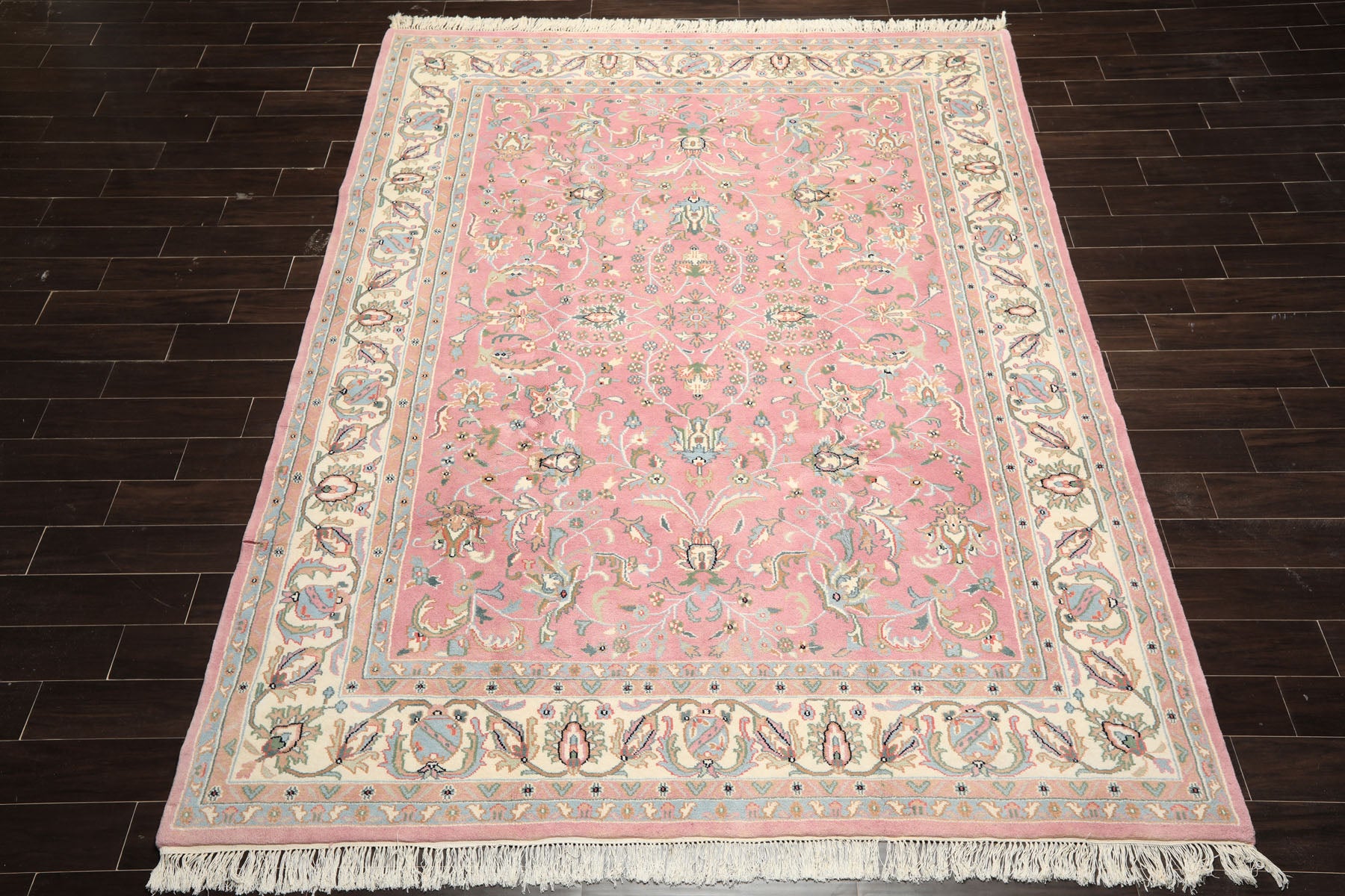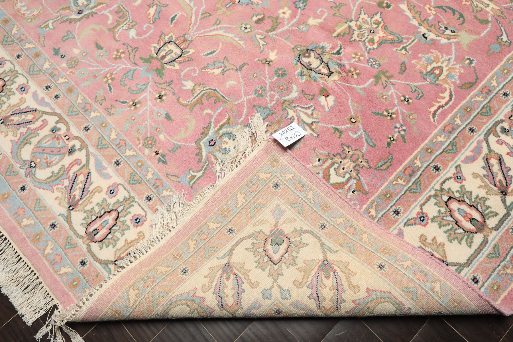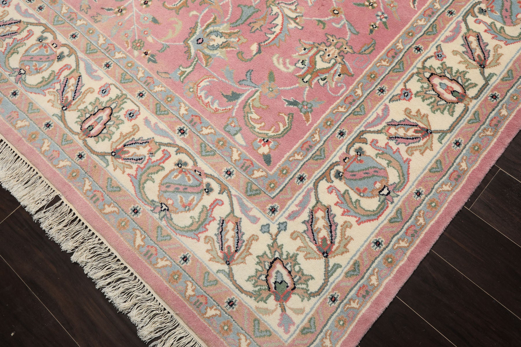 Gracefully woven in the Indo Kashan tradition, this 8' x 10'3" hand knotted wool rug features a high, plush pile of approximatly 0.75 on a cotton foundation, offering a luxuriously velvety soft underfoot feel. Rooted in classical Persian design language, the rug is defined by an elegant botanical composition that emphasizes balance, refinement, and timeless beauty.The design of this Indo Kashan botanical rug is rooted in the classical Persian garden aesthetic, where the rug is conceived as a harmonious, cultivated landscape viewed from above. The field unfolds as a continuous network of interlacing floral vines, carefully balanced to create symmetry without rigidity. The field is rendered in a dusty rose–pink ground, setting a warm and romantic tone. Flowing across this backdrop are delicate floral vines and palmettes, drawn in ivory and beige, which form the structural framework of the design. These scrolling stems are punctuated with blossoms and leaves in aqua and sage green, adding freshness and visual lift, and Fine black detailing is used sparingly to outline select motifs, lending clarity and definition. Framing the interior is a classic Kashan border, predominantly in ivory and beige, adorned with repeating floral sprays and curling vines in pink, aqua, sage, and coral. This border acts as a gentle visual enclosure, enhancing the symmetry and cohesion of the overall design. With its plush pile, refined color layering, and serene floral movement, this rug is especially well suited for bedrooms, formal living rooms, sitting areas, or elegant lounges, where it can add warmth, softness, and a sense of opulence.