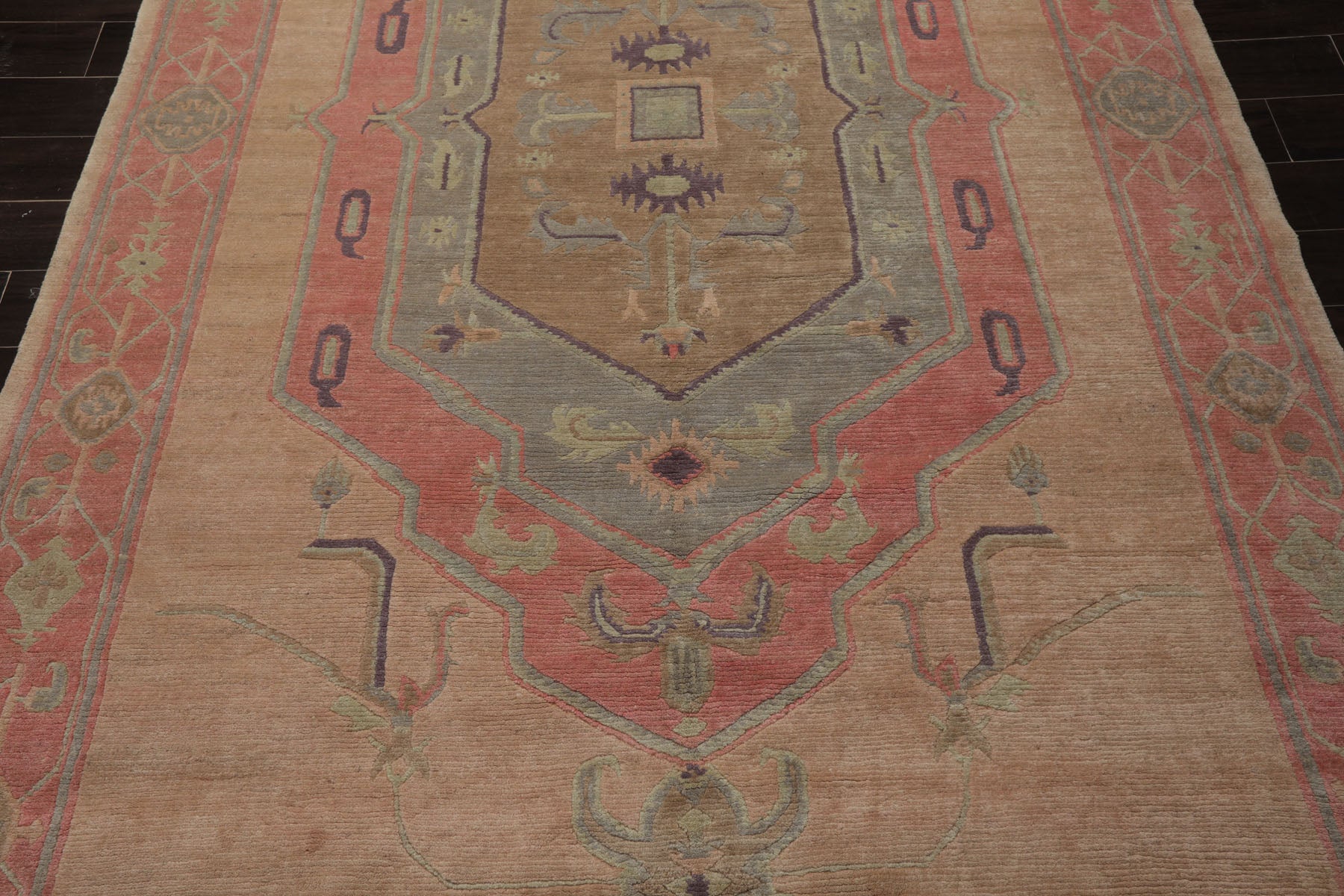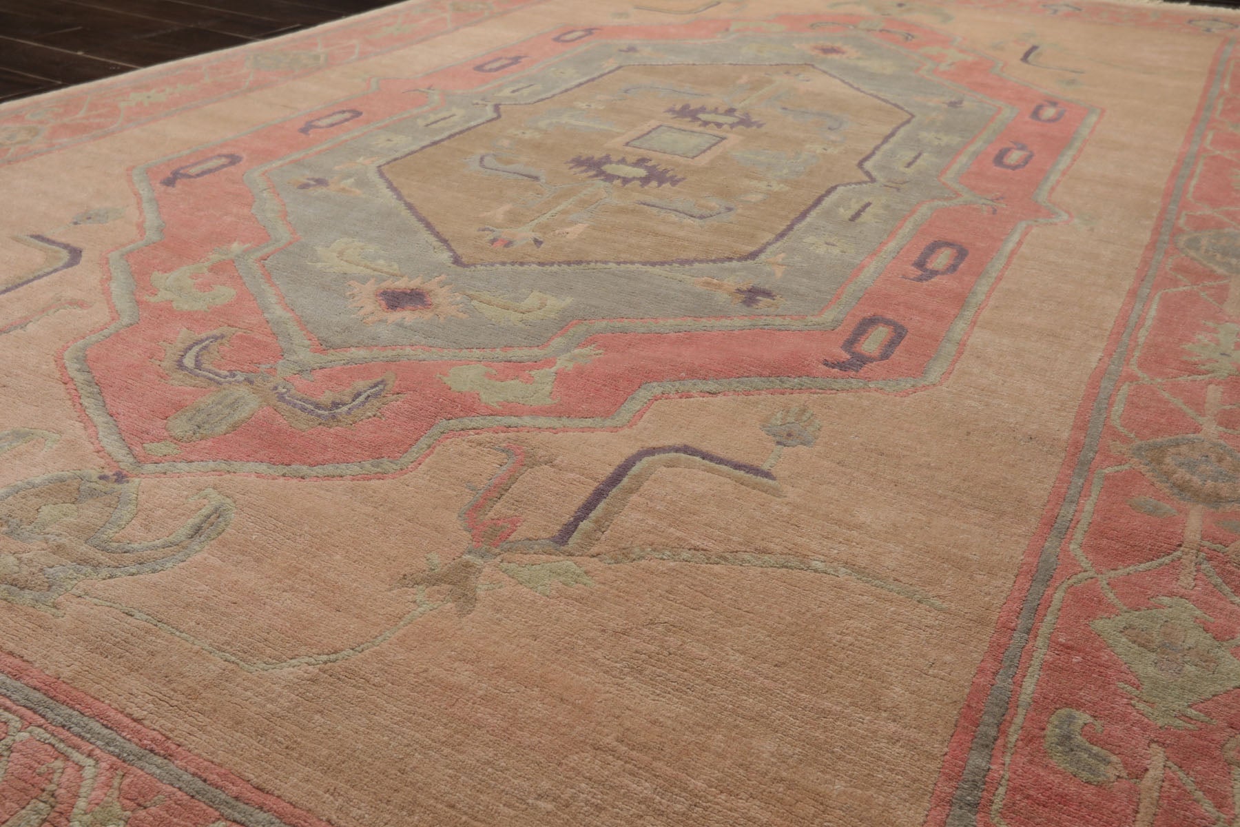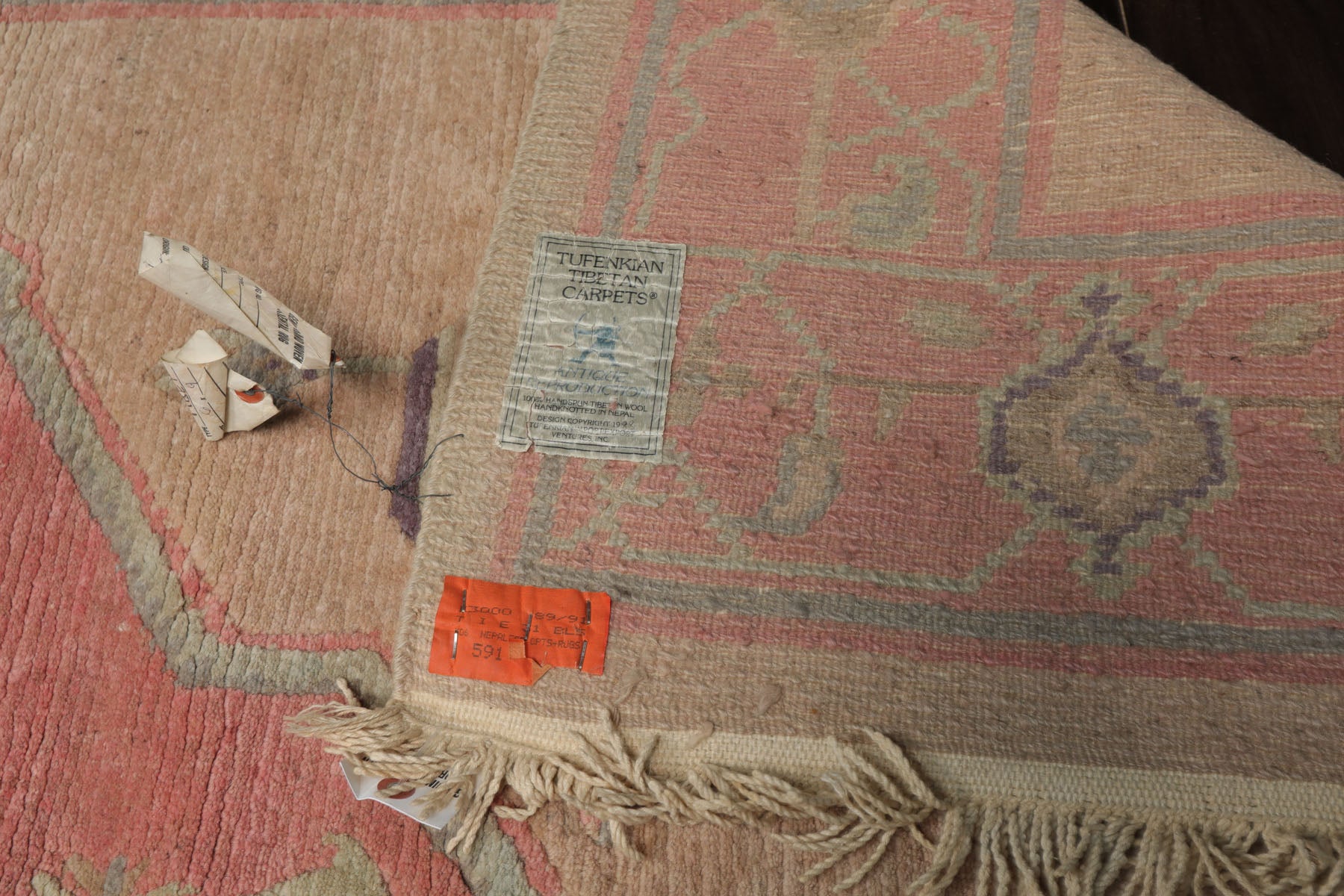 Faded peach, blush, aqua, gray, and mint tones come together in an elegant medallion and geometric Serapi-inspired design, hand knotted in Nepal from fine wool with a cotton foundation. The Swiss Wash finish by Tufenkian lends the piece a softened, time-worn patina that enhances its transitional charm. With its 0.6-inch pile, the rug feels plush underfoot while retaining the durability of Tibetan craftsmanship. Perfect for interiors seeking a blend of classic medallion motifs and a subtle, washed color palette, it introduces both sophistication and warmth to the space.