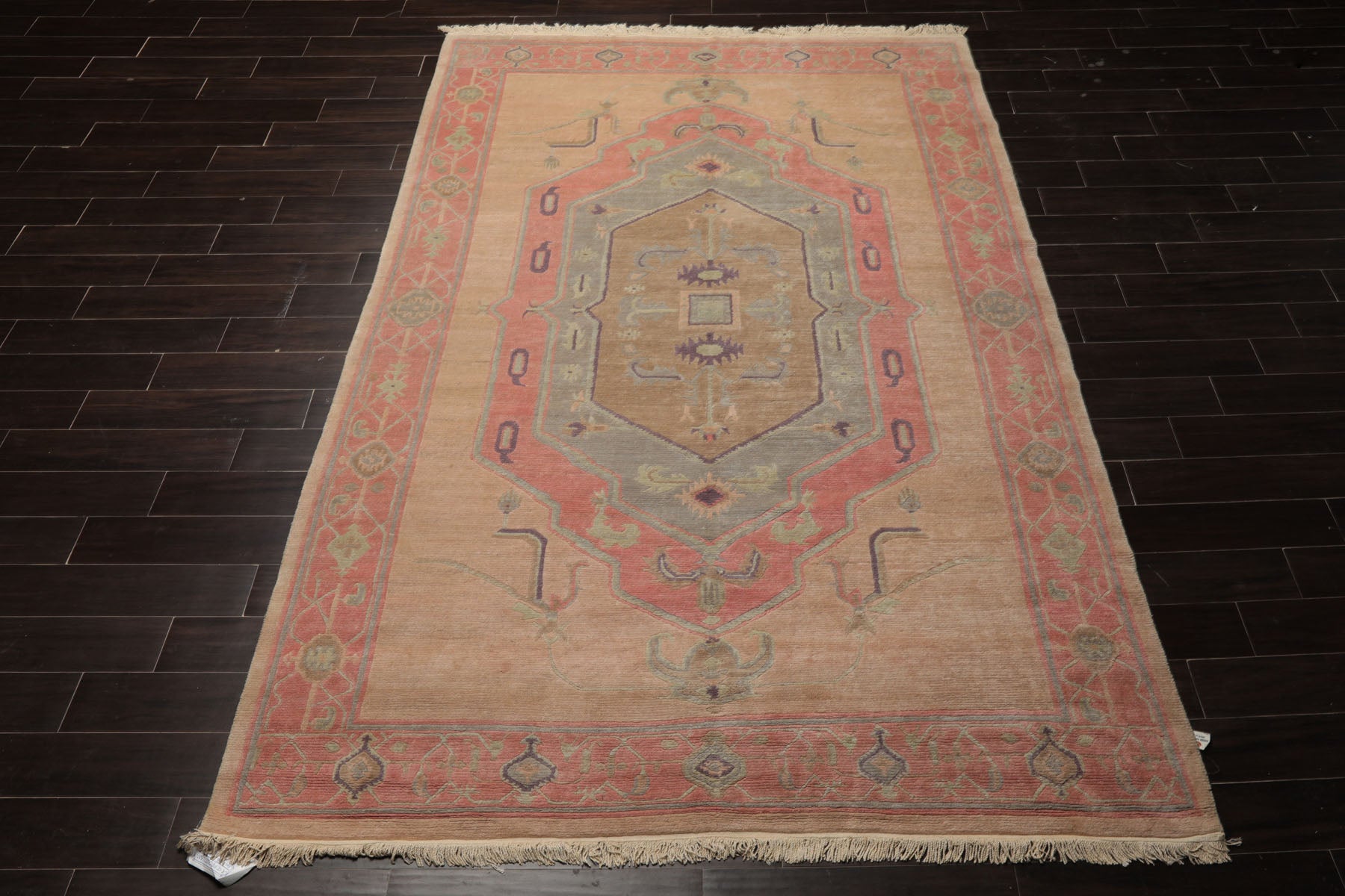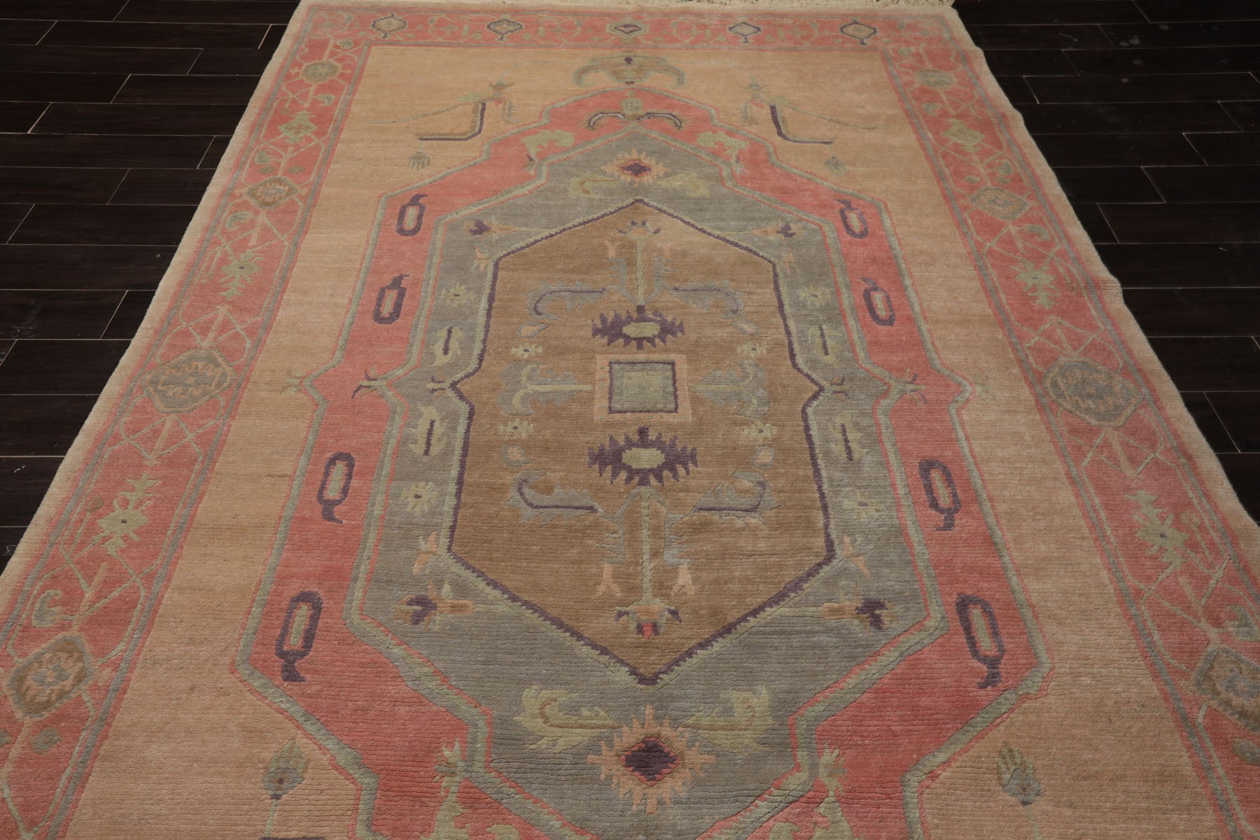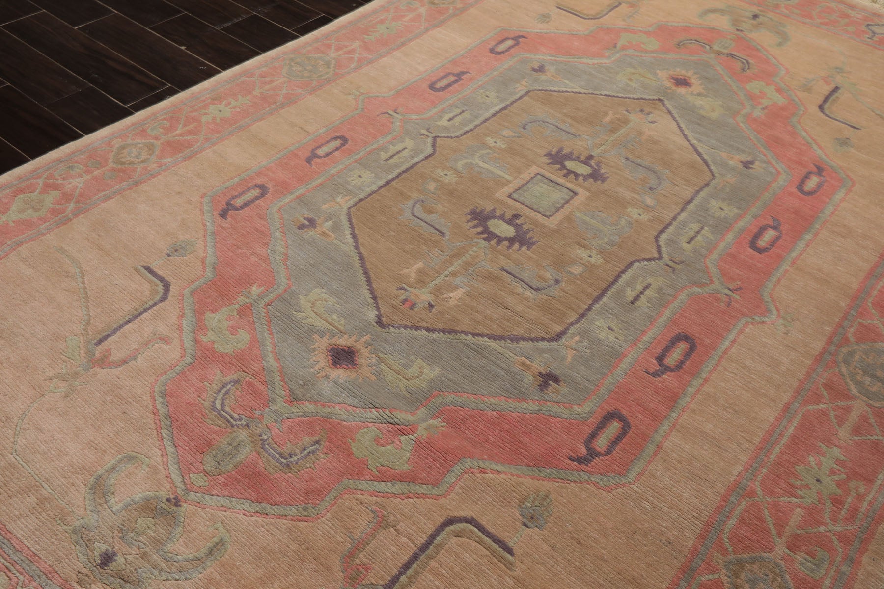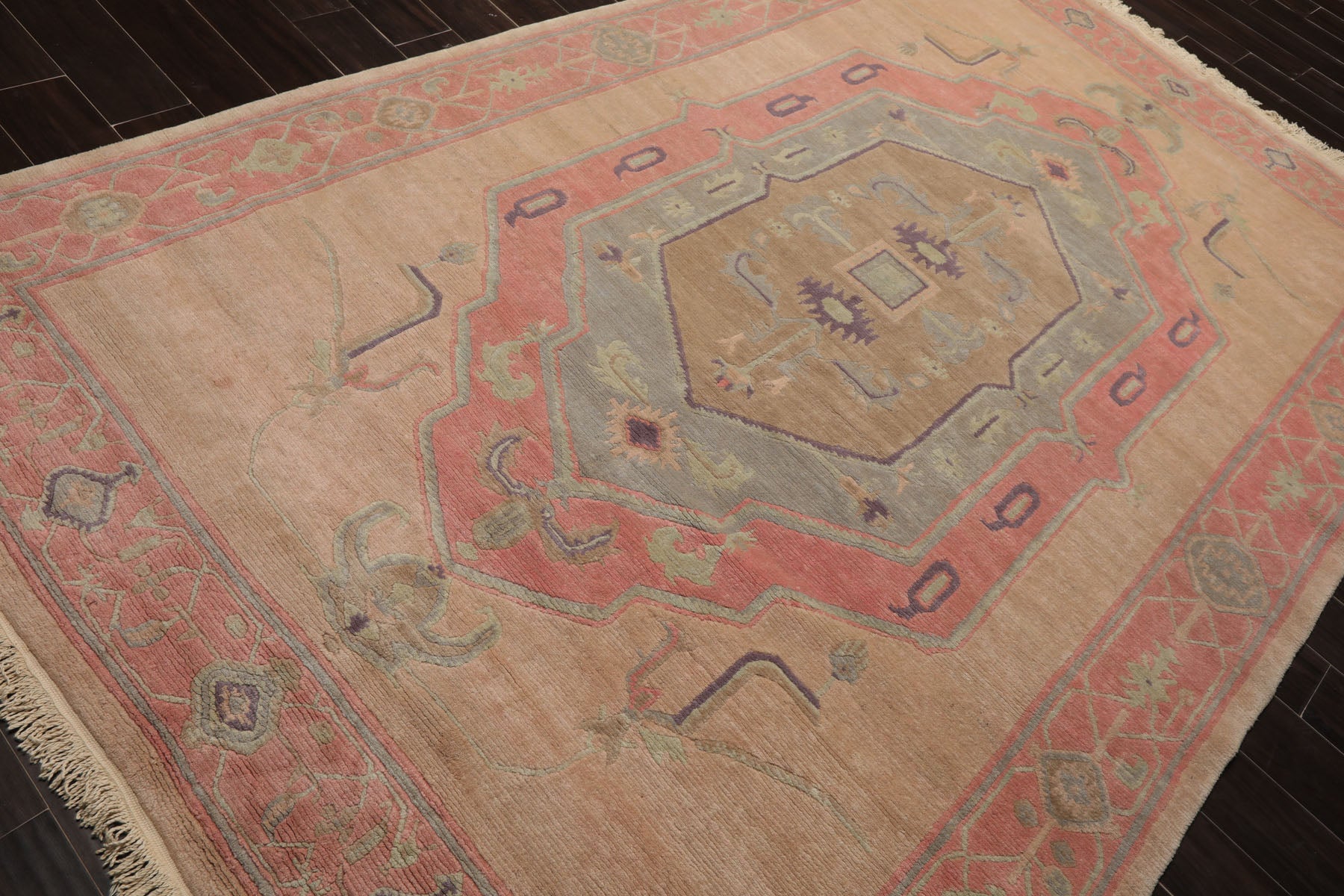 Faded peach, blush, aqua, gray, and mint tones come together in an elegant medallion and geometric Serapi-inspired design, hand knotted in Nepal from fine wool with a cotton foundation. The Swiss Wash finish by Tufenkian lends the piece a softened, time-worn patina that enhances its transitional charm. With its 0.6-inch pile, the rug feels plush underfoot while retaining the durability of Tibetan craftsmanship. Perfect for interiors seeking a blend of classic medallion motifs and a subtle, washed color palette, it introduces both sophistication and warmth to the space.