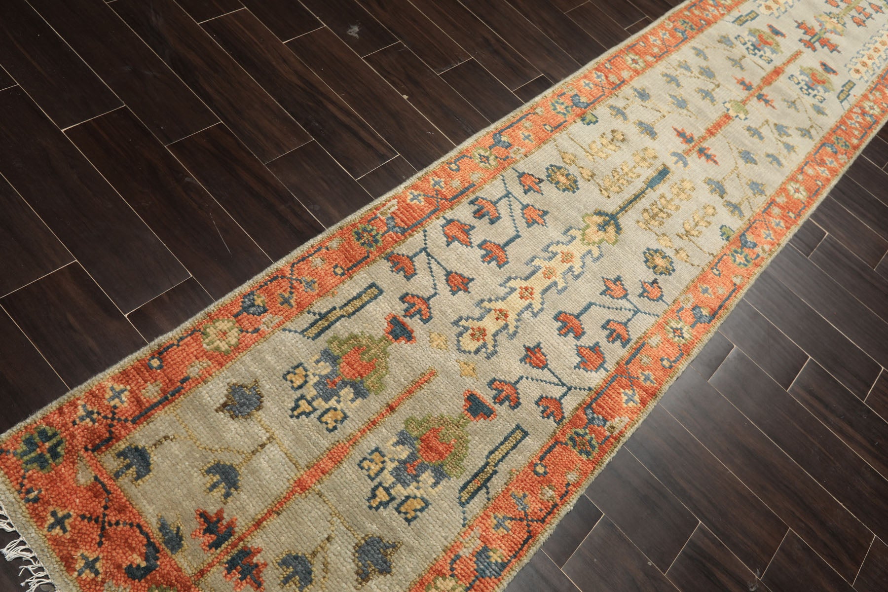 A vibrant expression of Anatolian folk artistry, this hand-knotted wool Oushak runner captivates with its luminous gray field adorned with a sequential display of geometric medallions and tribal symbols that march boldly along its substantial twelve-foot passage. The composition bursts with energy through burnt orange and lime green motifs accented by mint and blue floral elements that enliven the neutral gray wool surface, while touches of beige provide gentle transitions between the spirited chromatic contrasts. Authentic hand-knotting techniques on a resilient cotton foundation ensure the impressive longevity and sumptuous pile depth that distinguish handcrafted Oushak runners from machine-made alternatives. The striking burnt orange border, richly decorated with stylized botanical and geometric patterns in complementary green, blue, and beige tones, creates a dynamic frame that amplifies the runner's dramatic proportions while emphasizing its multi-colored vivacity. The bold pairing of gray, burnt orange, lime, and mint delivers an unexpected fusion of restraint and exuberance, making it a statement piece for interiors that embrace color-forward design without abandoning traditional roots in laundry rooms, long hallways, or open-concept transitions. Welcome this spirited handwoven runner into your home for an instant infusion of personality and artisan excellence.