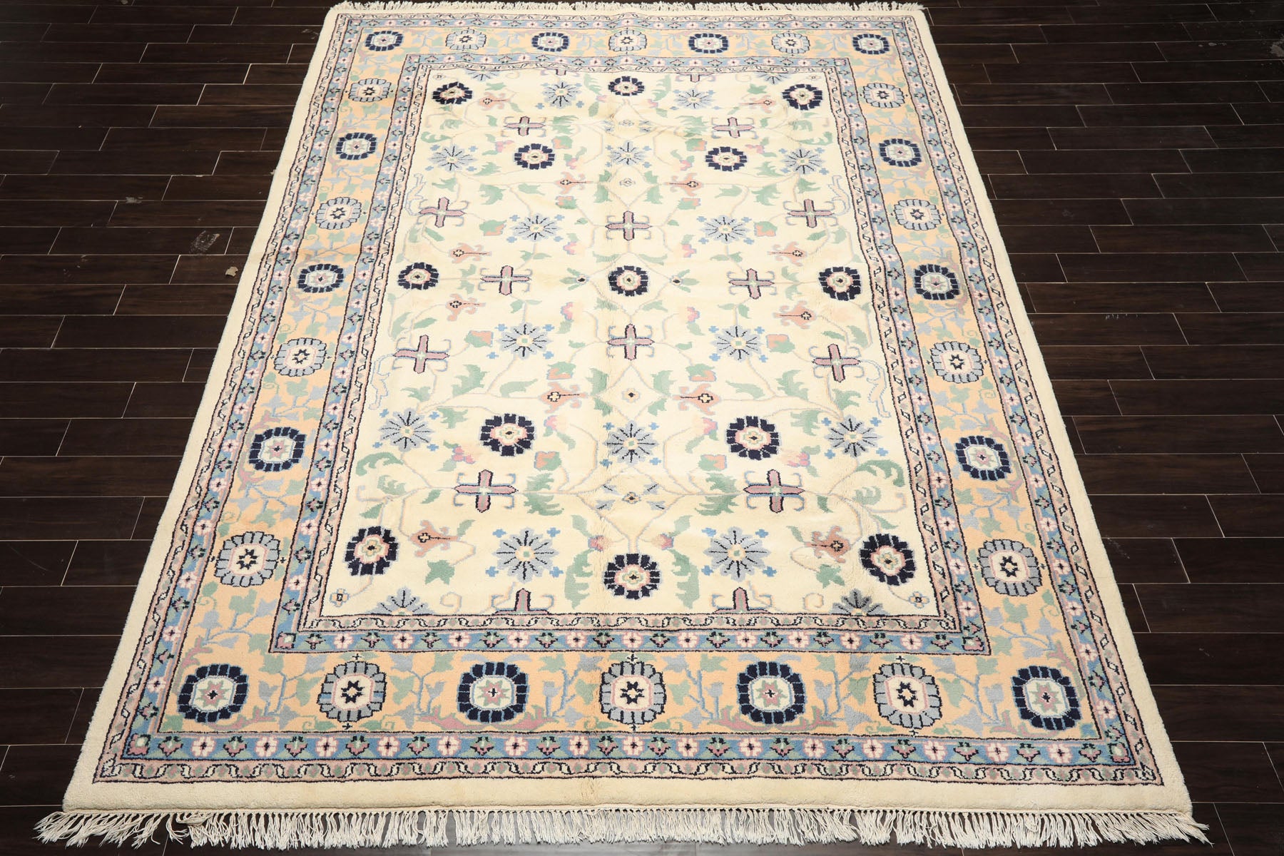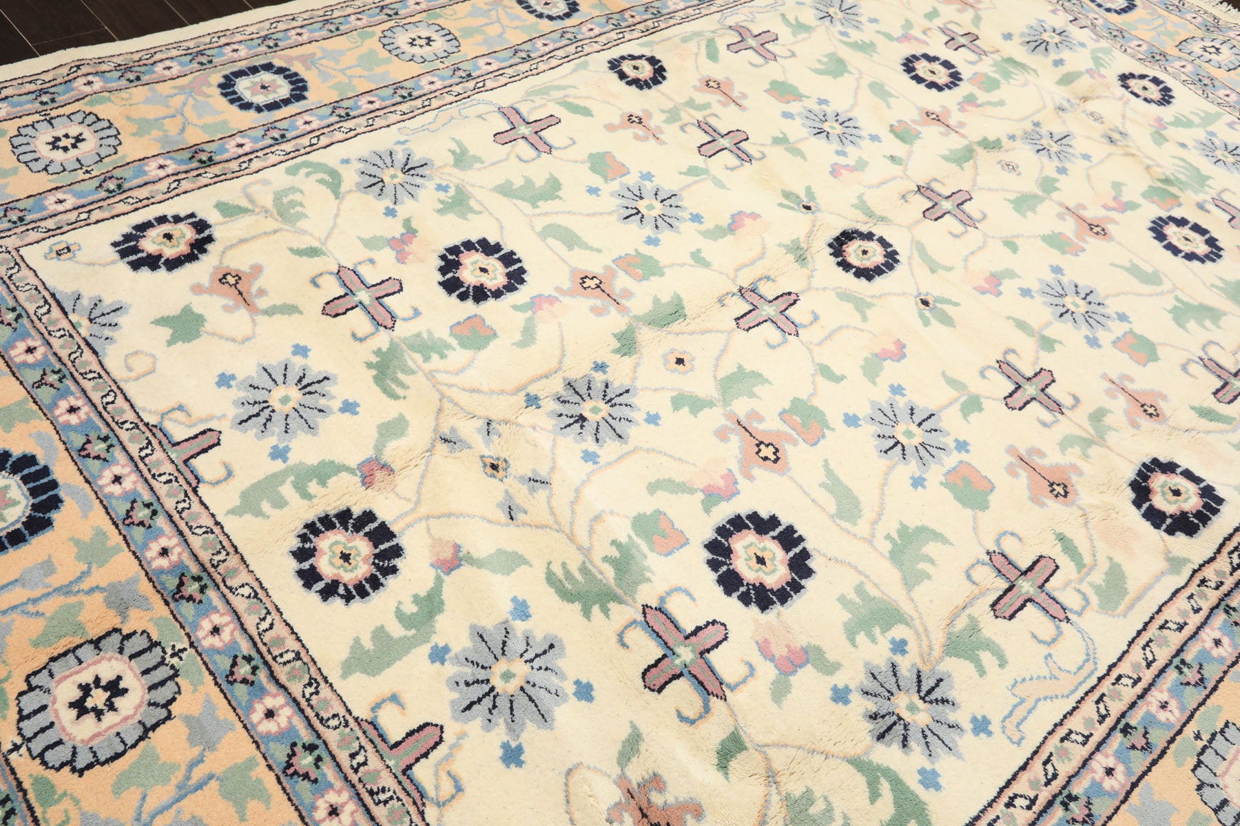 Rooted in classical Persian inspired craftsmanship, this 8'5" x 11'7" hand knotted wool Indo Kashan rug features a high, plush pile of approximately 1.00, a cotton foundation with a sought after velvety soft hand feel. Woven in the traditional Indo Kashan style, the rug combines durability with refined elegance, making it both a collectible textile and a functional statement piece for larger interiors. Kashan rugs are historically conceived as stylized garden compositions, where the layout reflects order in nature and the balance between structure and growth. The ivory and beige field acts as a luminous ground, symbolizing purity and openness, and serves as a canvas for gently scrolling vines and floral rosettes. These motifs, rendered in blush, soft pink, and peach, represent renewal and flowering, introducing warmth without overwhelming the design. Accents of aqua and light blue appear within select blossoms and leaves, evoking water and air elements traditionally associated with tranquility and balance in Persian design philosophy. Midnight blue is used sparingly for outlining and focal points, providing visual anchor and definition, while enhancing depth and contrast across the lighter palette. The surrounding border repeats the interior floral language in softened tones, functioning as both a visual frame and a symbolic enclosure, reinforcing harmony and continuity. Ideal for formal living rooms, bedrooms, or elegant dining spaces, this rug pairs beautifully with neutral upholstery, light woods, and both traditional and transitional interiors, offering a calm yet luxurious foundation to the room.