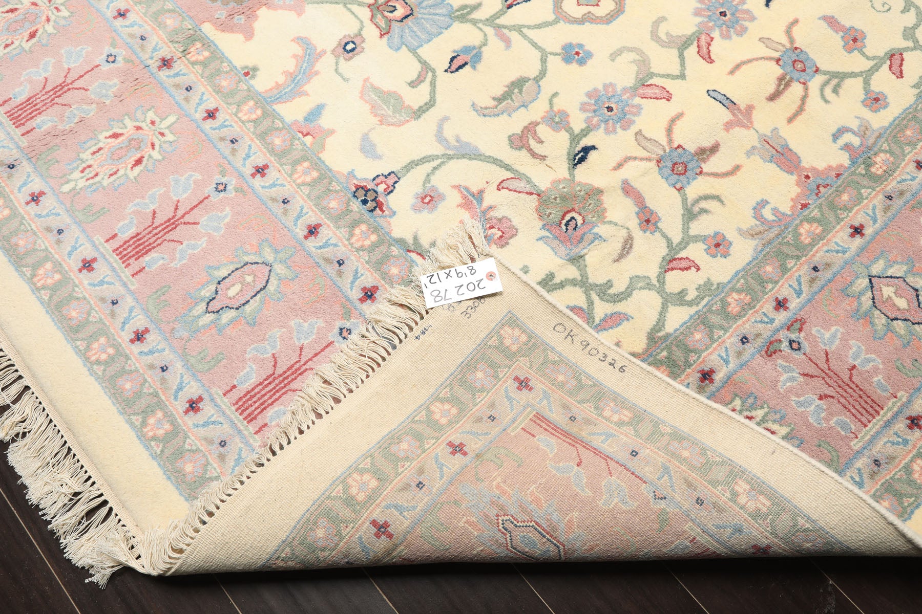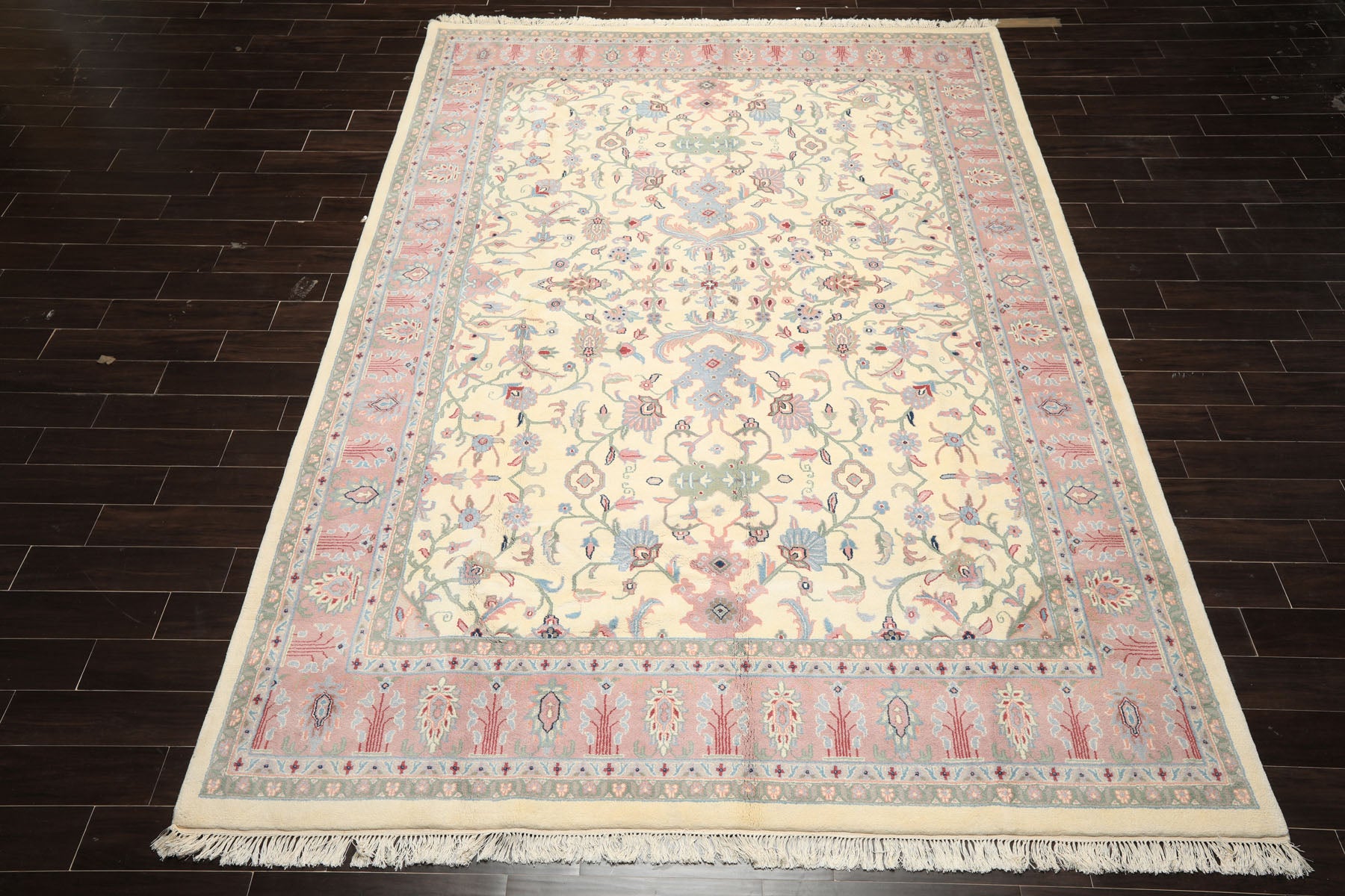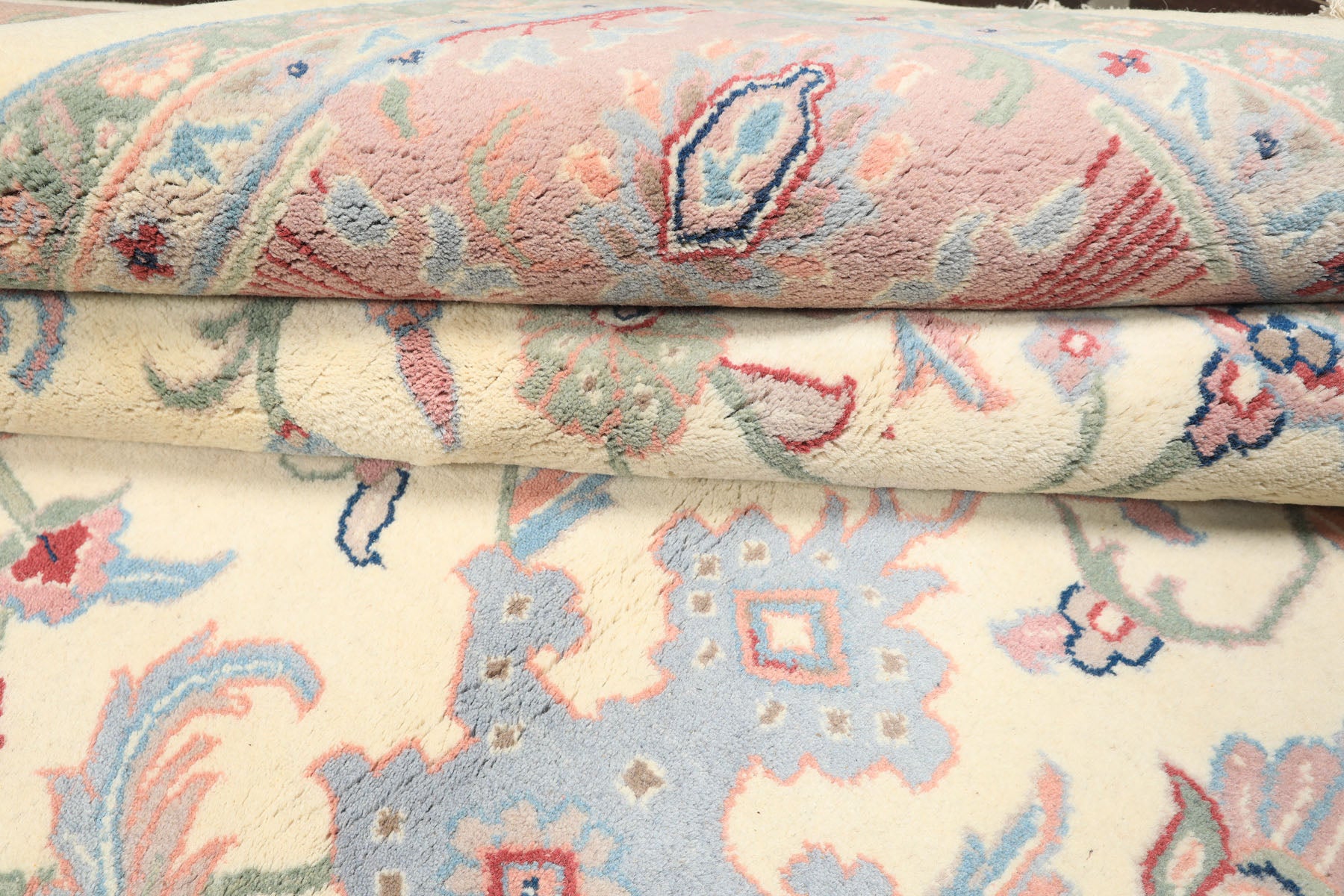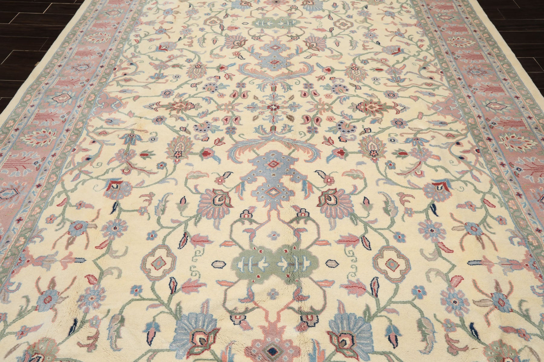 Rooted in refined Persian inspired craftsmanship, this 8'9" x 12' hand knotted wool Indo Kashan rug is distinguished by its high, plush pile of approximately 0.75, a durable cotton foundation, and a luxurious plush pile with a velvety soft hand feel. Woven in the traditional Indo Kashan style, the rug balances decorative richness with everyday livability, making it a sophisticated foundation for larger interiors.The design unfolds across a luminous ivory and beige field, which serves as a calm visual ground and allows the detailing to remain crisp and legible. From this base, scrolling floral vines extend symmetrically outward, forming the structural framework of the rug. These vines are rendered primarily in sage green and soft blue, colors traditionally associated with growth, renewal, and balance, and they guide the eye gently across the surface without visual congestion. The primary floral palmettes and rosettes are articulated in blush and muted pink, introducing warmth and softness while maintaining elegance. These blossoms are strategically placed to create rhythm and continuity rather than a single dominant focal point, a hallmark of Kashan design. Taupe tones are used within secondary petals and outlining, lending subtle depth and preventing the lighter palette from appearing flat. Carefully placed rust accents appear within select floral centers and detailing, adding contrast and grounding the composition with an earthy richness. Framing the field, the wide decorative border repeats the ivory beige base, using blush, blue, sage, and taupe in a more concentrated rhythm.