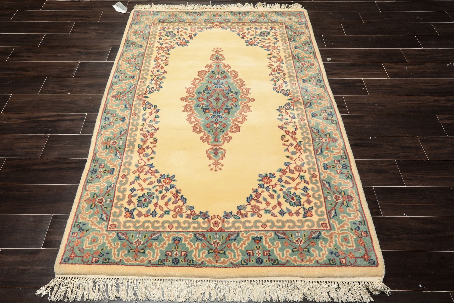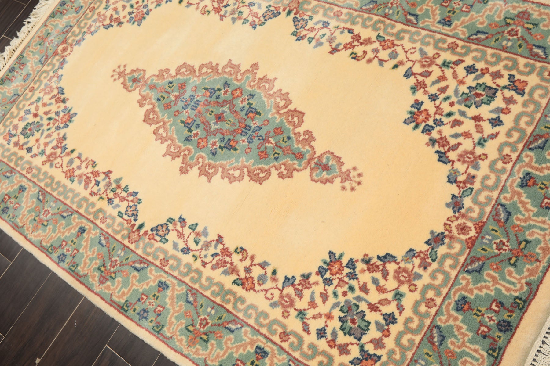 4x6 Hand Knotted New Zealand Wool Ivory Indo Kerman Traditional Medallion Pande Cameron Silky Sheen Plush Pile Velvety Soft Rug