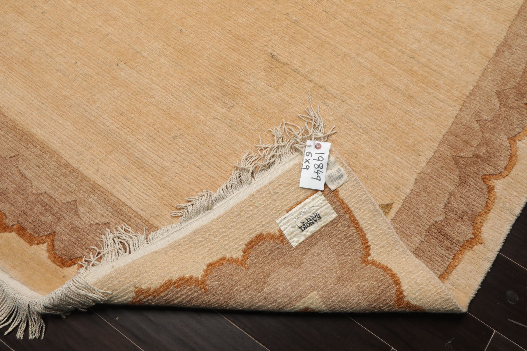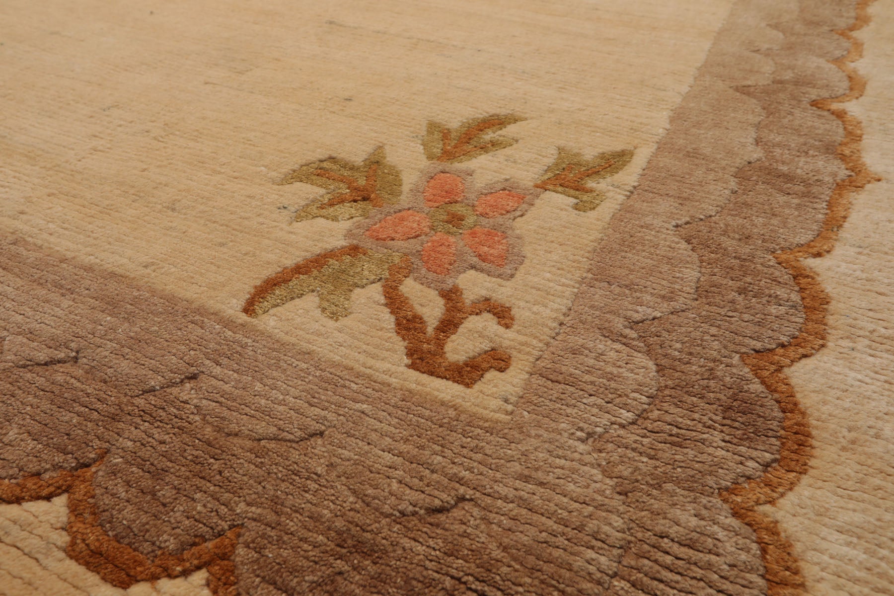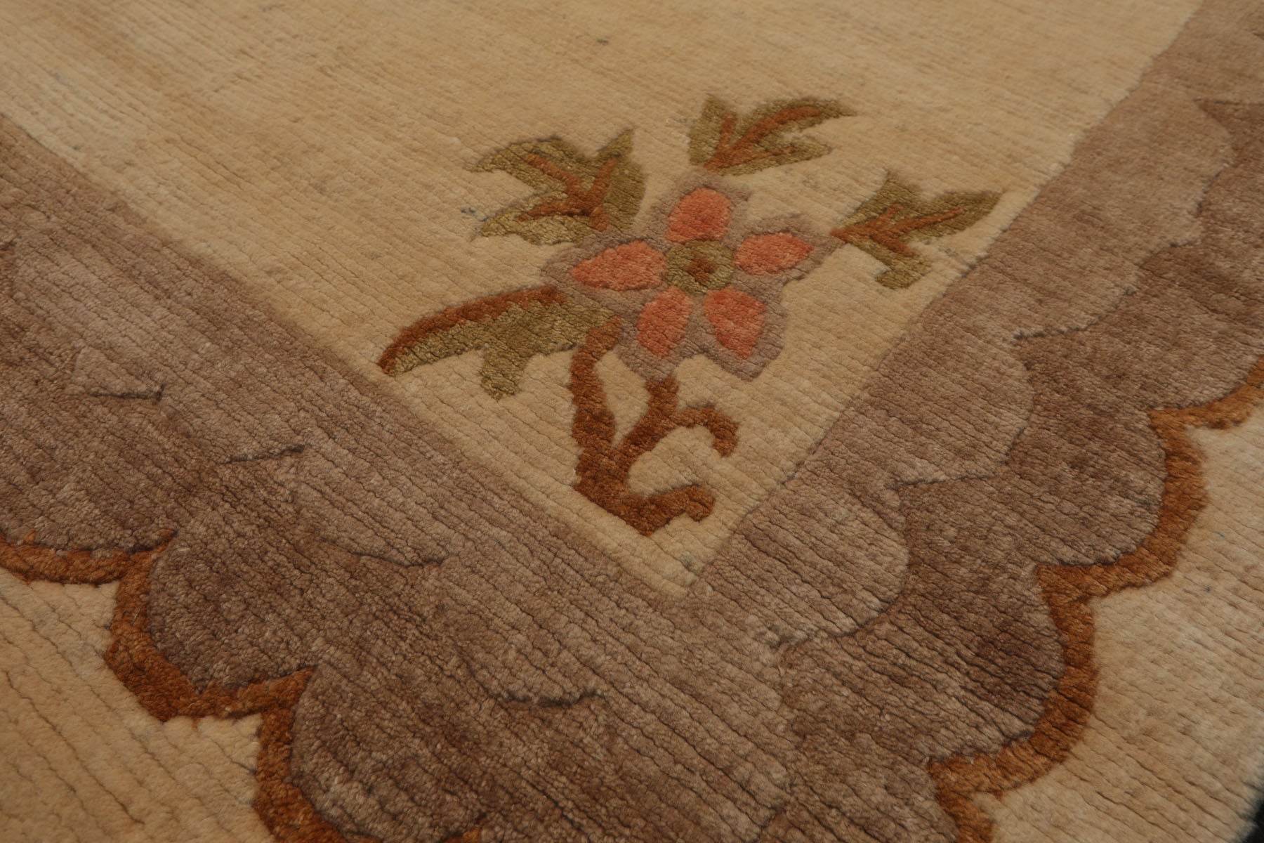 Crafted in Nepal, the Michaelian & Kohlberg hand-knotted Tibetan rug before you embodies European classic elegance with a refined minimal floral design. Made from high-quality wool, it features the renowned Swiss Wash finish, lending the surface a silky sheen and luxurious texture. The warm ivory-tan field is framed with soft taupe and brown scalloped borders, accented by delicate rose and green floral corner motifs. With a medium 0.6" pile, it balances comfort and durability, making it an excellent choice for both traditional and transitional interiors.