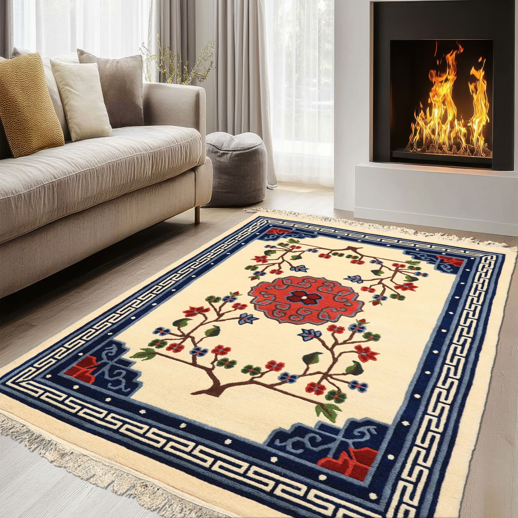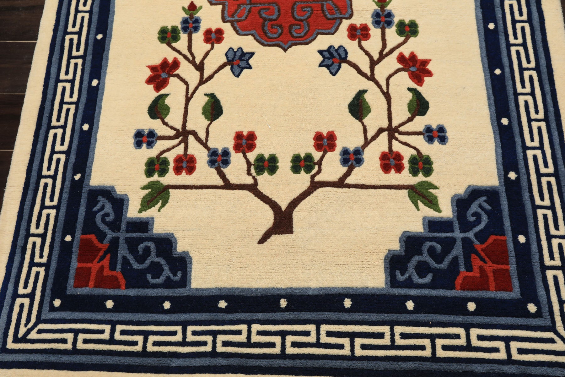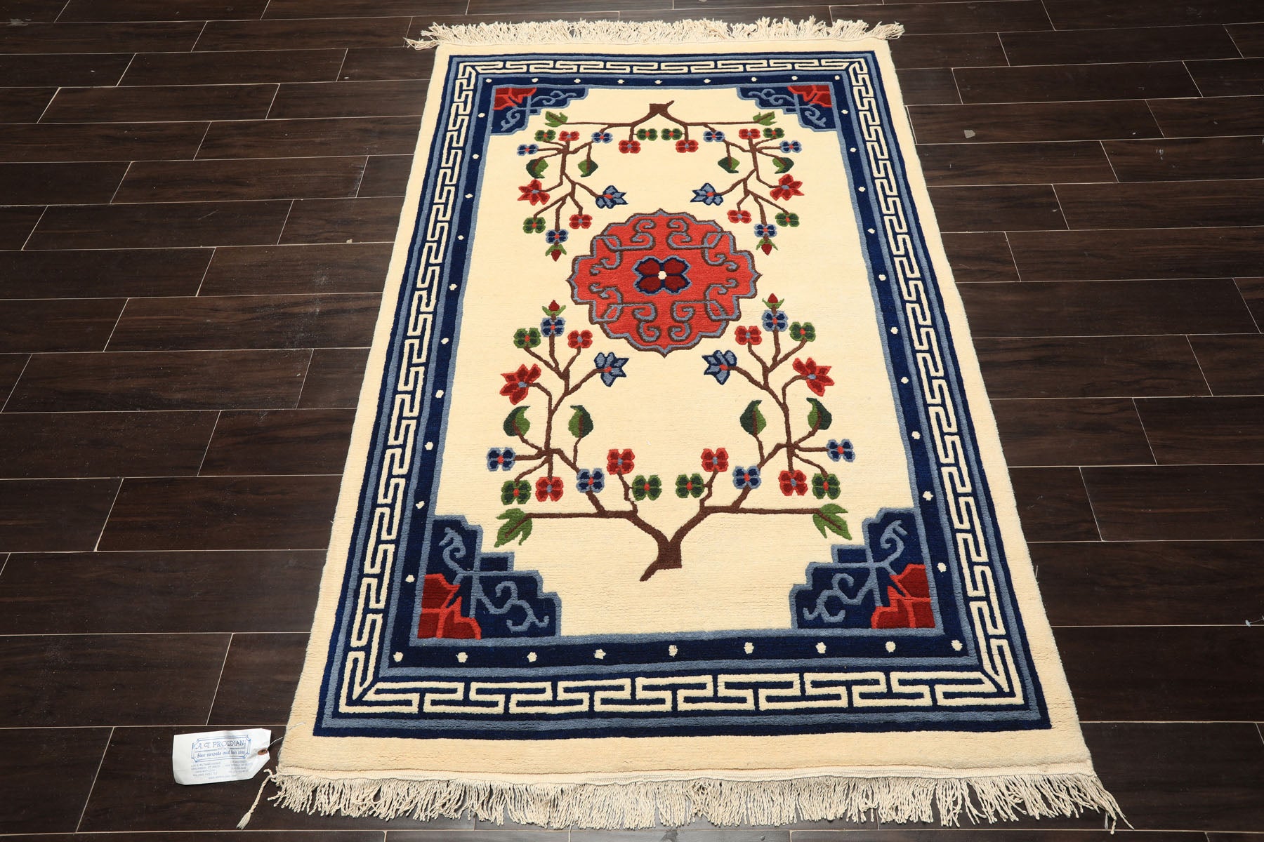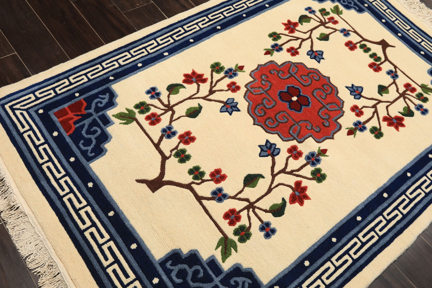 4x6 Hand Knotted Wool Ivory Tibetan Art Deco Traditional Medallion Greek key border Rug