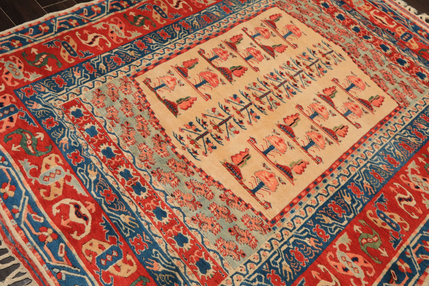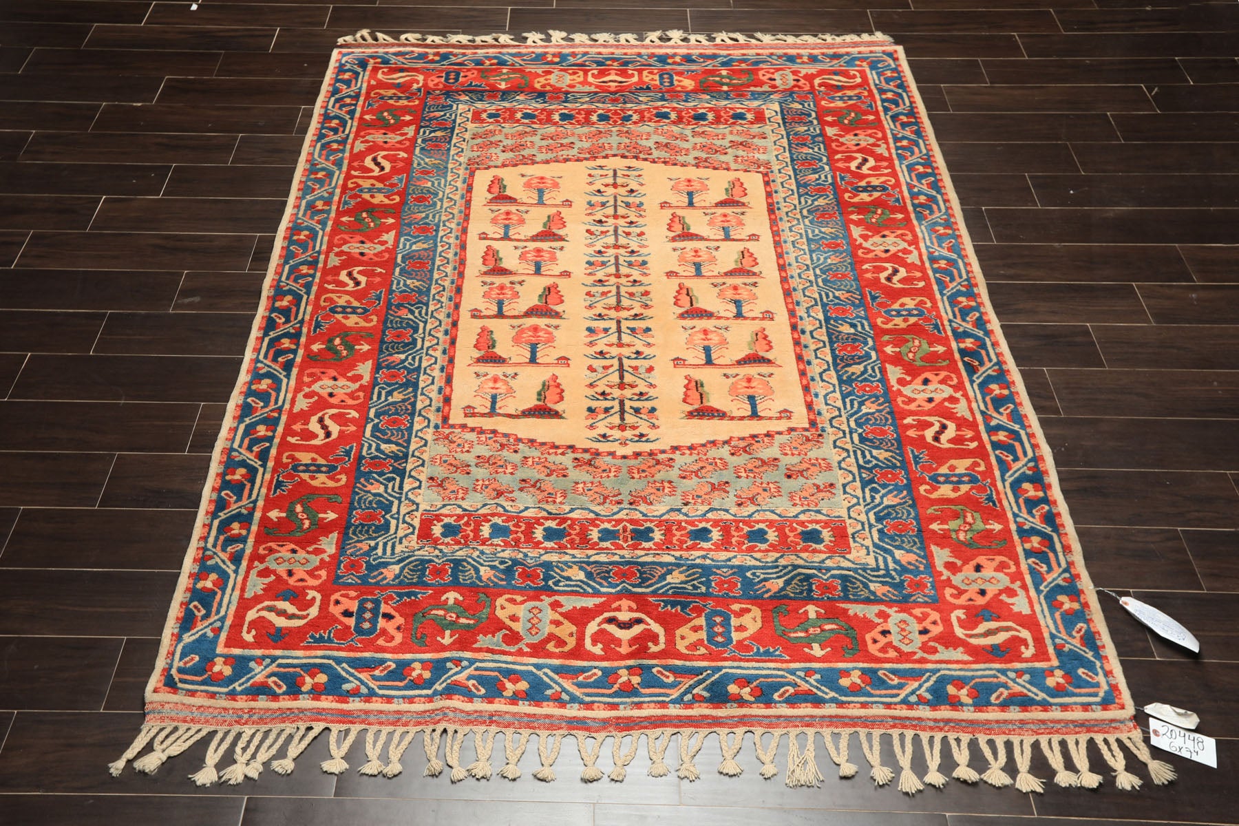 Narrative in spirit and tribal in execution, this hand-knotted Turkish Kula rug presents one of the most storied layouts in the Anatolian weaving tradition, the garden paradise design, rendered here with a directness and folk vitality that makes it immediately compelling. The rug features a warm ivory central field organized as a formal garden, where three vertical columns of stylized cypress trees, flowering shrubs, and rounded mound forms in coral, rose, blue, and green rise from the ground in orderly rows, the trees rendered with a flat, almost childlike simplicity that is entirely characteristic of the tribal interpretation of this ancient garden motif. A sage green inner band surrounds the ivory field, its floral scroll in soft coral and ivory transitioning the composition outward toward the bold terracotta red main border, which carries large interlocking S-scroll and botanical forms in ivory, blue, and forest green, their generous scale and fluid movement giving the border a strong, confident presence on all four sides. A vivid cobalt blue guard frames both the inner and outer edges of the red border, its deep tone providing the strongest color note in the entire composition and anchoring the warm ivory and terracotta palette with a sharpness that keeps the overall design from reading as too soft. The oversized tassel fringe along the lower end is a traditional Kula finishing detail that adds an authenticity to the piece. Hand-knotted in wool on a cotton foundation, this is a garden rug of genuine tribal character and lasting appeal.