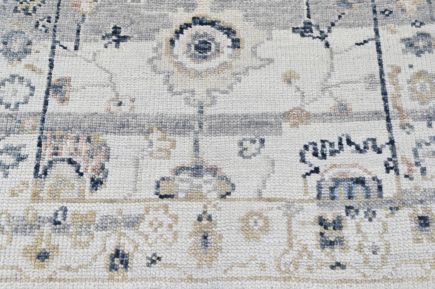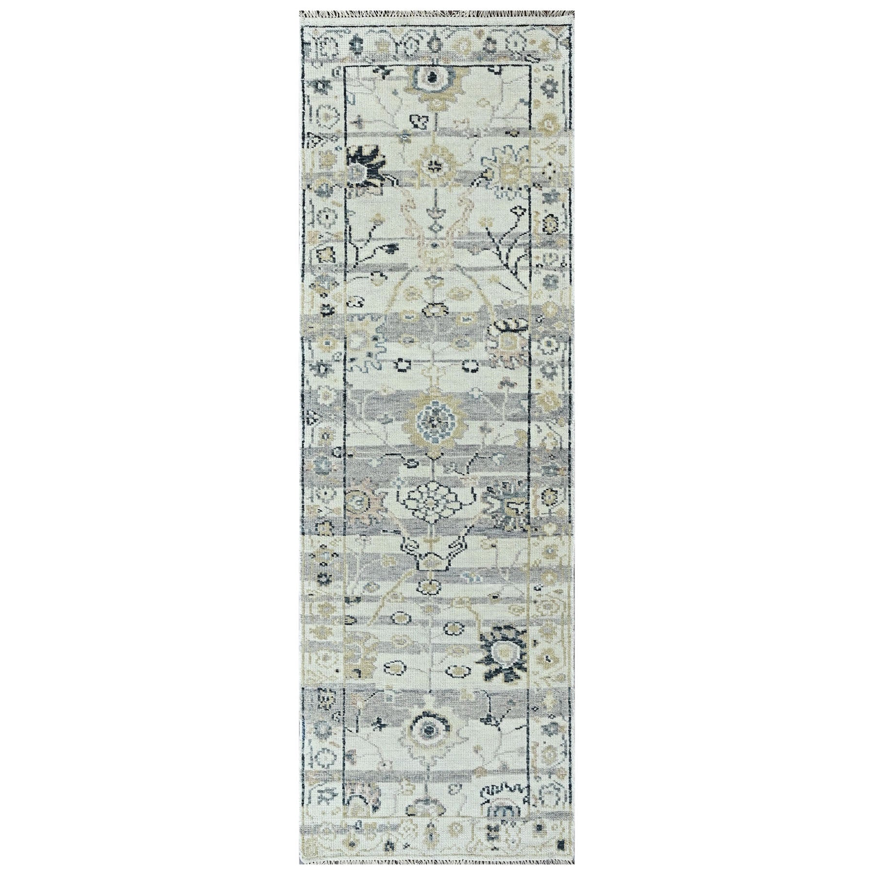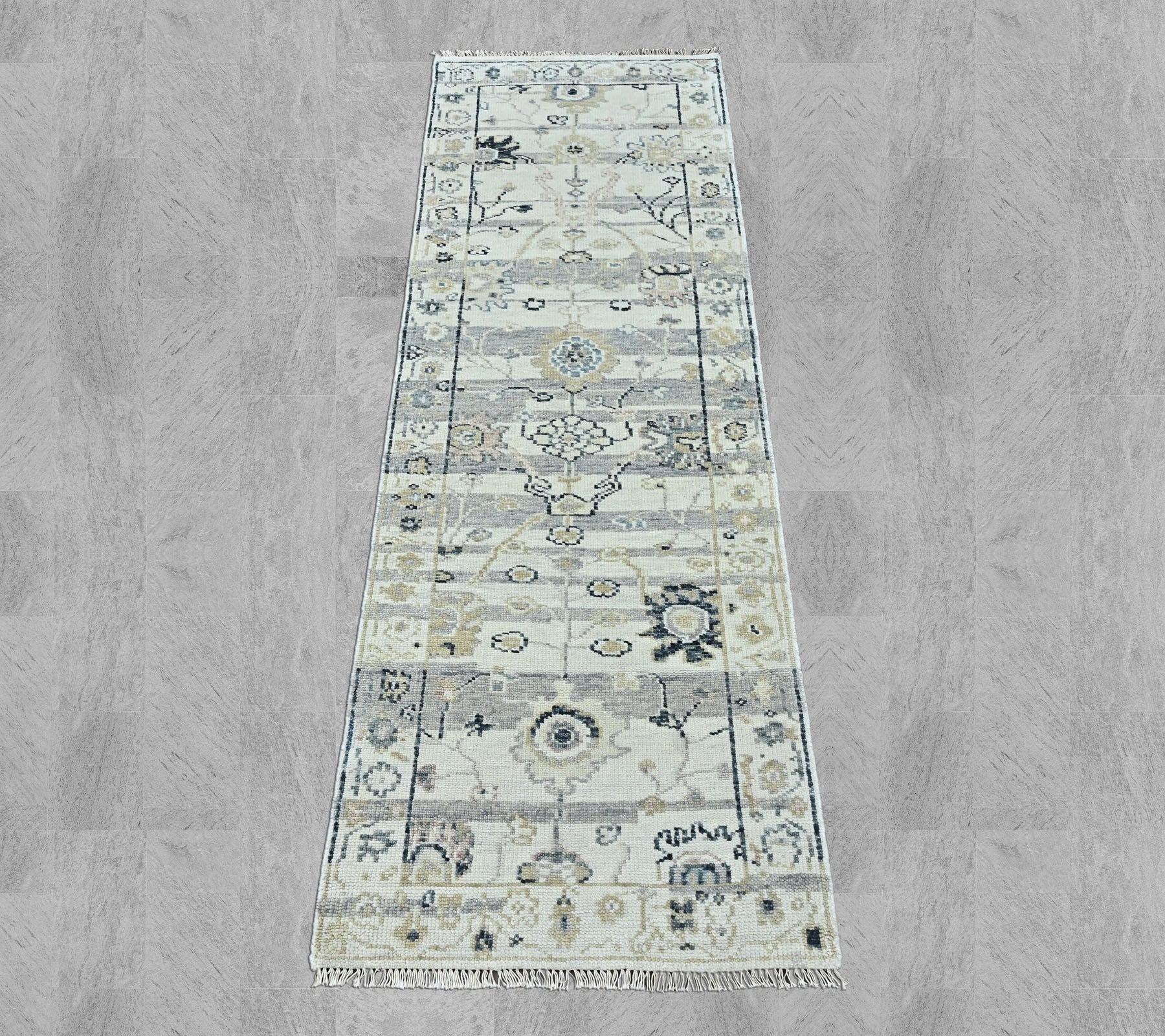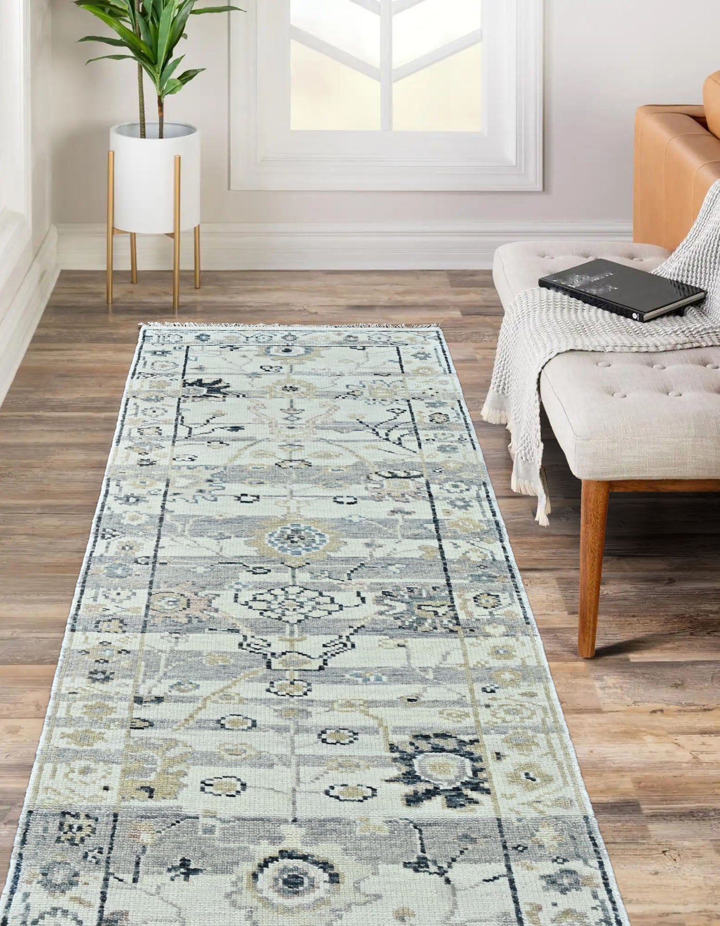Shaped by a refined transitional sensibility, this 2'7"x8'5" hand-knotted wool transitional runner presents a vertically oriented composition designed to guide the eye through rhythm, symmetry, and softened ornamentation. The rug field is organized along a central axis of stylized floral medallions and rosette forms rendered in muted mint and pale green, their shapes gently articulated against a light gray ground that keeps the design open and airy. Surrounding these focal elements, delicate vine scrolls and small geometric accents appear in layered tones of charcoal and moss, adding contrast while maintaining a restrained, balanced visual flow. Subtle horizontal banding and lightly distressed detailing introduce texture and depth, giving the runner a gently aged character without diminishing clarity. The border frames the design with repeating floral and geometric motifs in gray, mint, and charcoal, providing structure while echoing the interior palette. Hand knotted in wool on a cotton foundation, the runner offers durability with a refined feel and is especially well suited for hallways, entryways, kitchens, or narrow transitional spaces where a calm, elongated design can add visual interest without overwhelming the area.