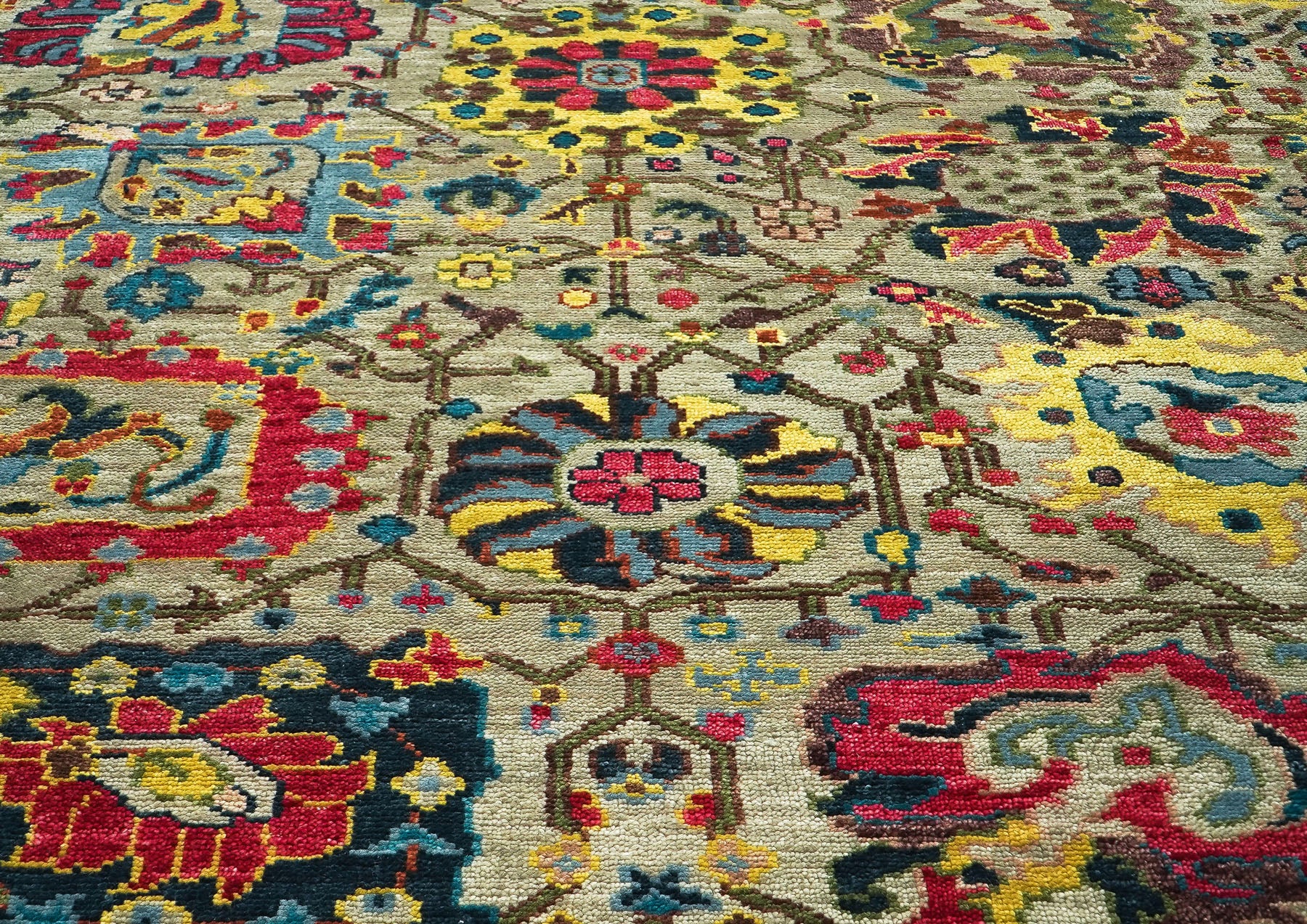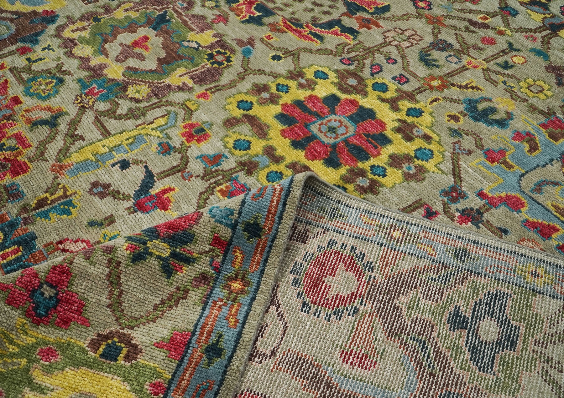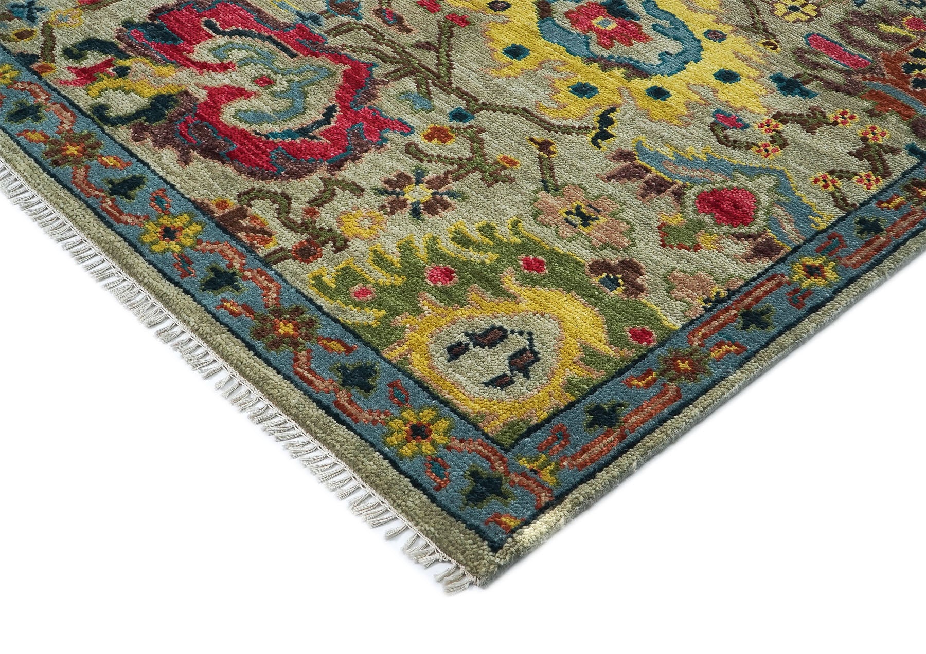 Bold, artistic expression meets centuries-old craftsmanship in a hand-knotted Oushak that transforms any interior into a sight to behold. The exuberant all-over design features an enchanting tapestry of stylized florals and whimsical motifs dancing across a sophisticated moss green field, punctuated by vibrant pops of coral, gold, lime, and blue that energize your decor without overwhelming it. Each oversized palmette and curving vine has been meticulously knotted by skilled artisans, resulting in a texture and depth that flat-weave and machine-made rugs simply cannot achieve. The Arts and Crafts aesthetic celebrates the beauty of handmade objects and organic forms, making this piece a perfect choice for those who value authenticity and artistic integrity in their home furnishings. Premium wool construction delivers exceptional durability and natural resilience, ensuring this investment piece withstands the demands of daily life while maintaining its stunning appearance. The rich, layered color palette effortlessly bridges traditional and contemporary styles, offering incredible versatility whether your aesthetic leans classic, eclectic, or modern.