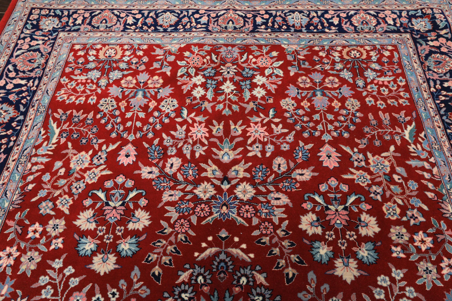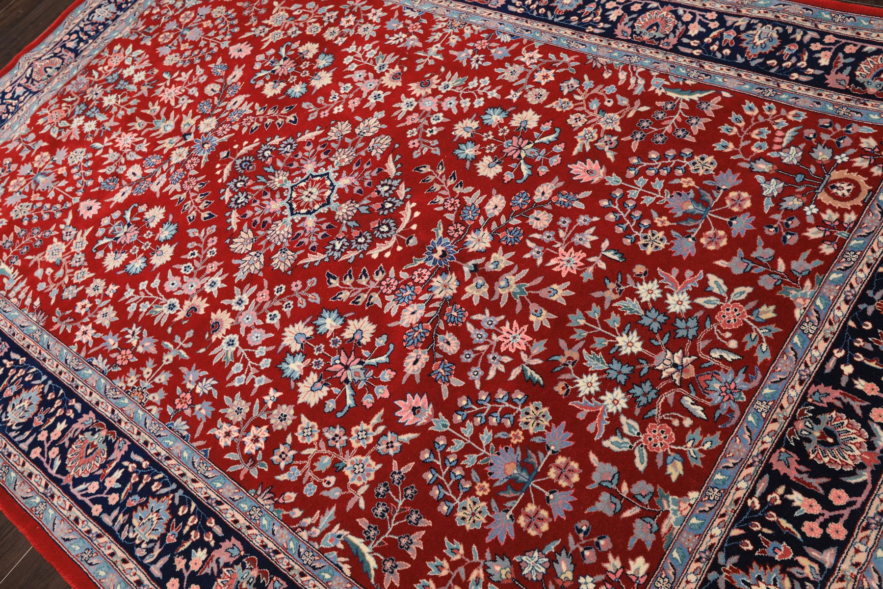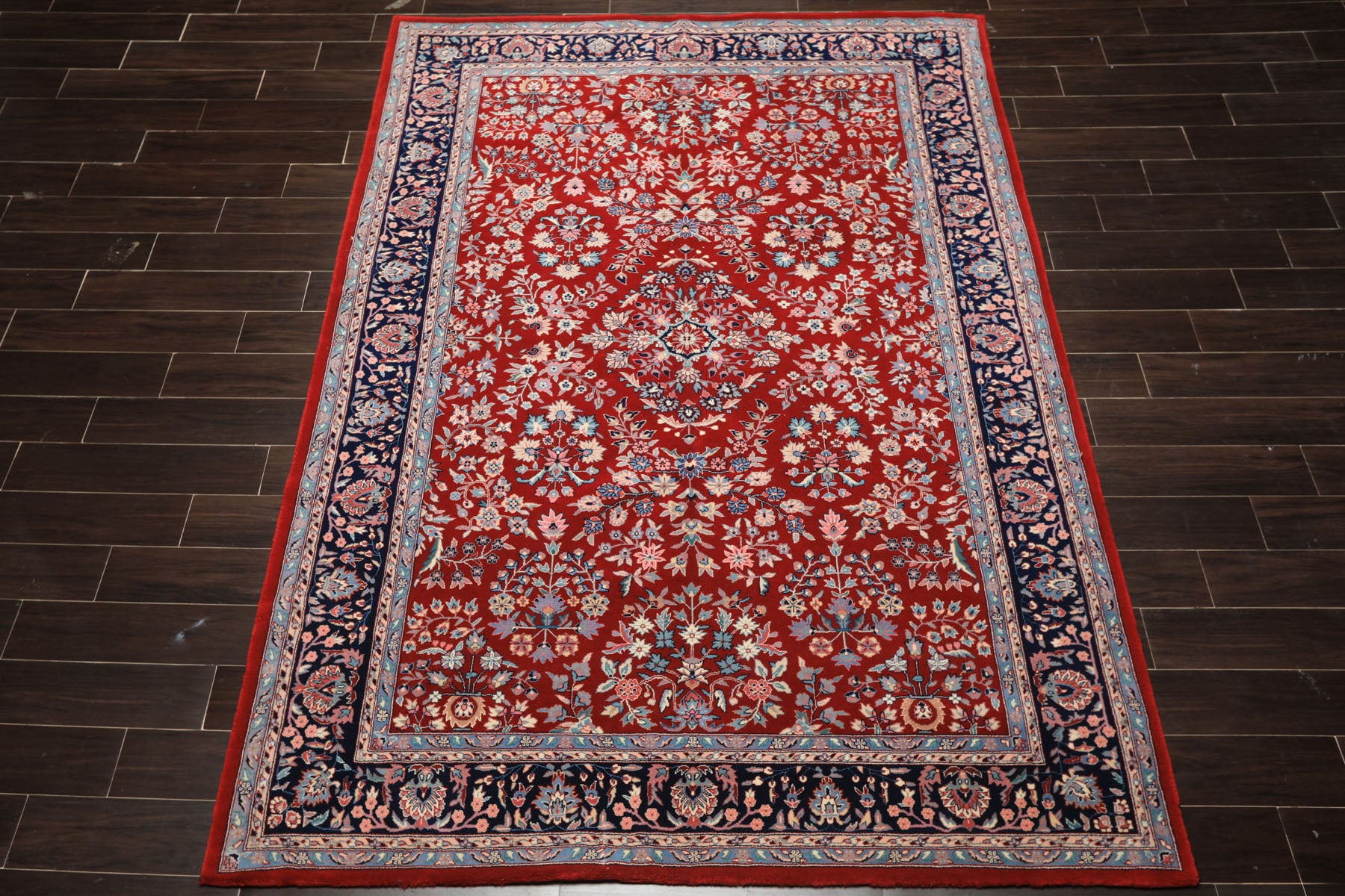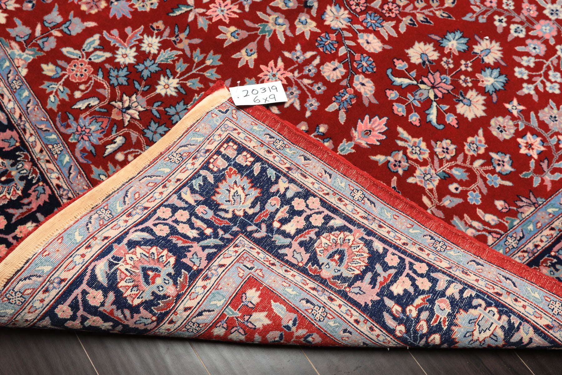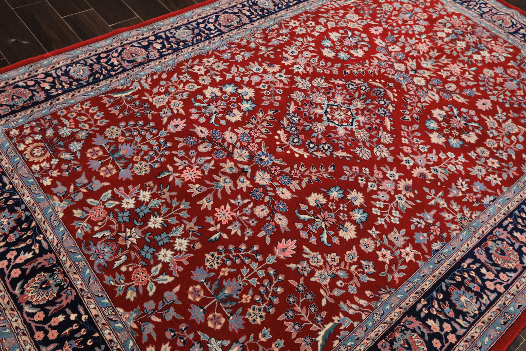 Rooted in the classical elegance of Indo-Kashan weaving, this 6' × 9' hand-knotted rug is crafted from fine New Zealand wool on a cotton foundation and finished with a refined 0.5 pile that highlights intricate detailing while maintaining a graceful, lightweight presence. The composition reflects the traditional Kashan floral vocabulary, known for its balance, density, and enduring visual richness. The rug’s design is composed of a deep red field that establishes a bold yet sophisticated foundation, enlivened by an elaborate arrangement of floral vines, palmettes, and blossoms that radiate outward in symmetry. Ivory and soft pink motifs provide contrast and clarity against the saturated ground, while aqua and blue accents introduce movement and tonal variation throughout the design. Subtle navy elements are used to outline and anchor the floral forms, lending structure and depth without overpowering the rug’s overall color . Framing the field, a navy border densely filled with repeating floral patterns echoes the interior motifs, creating a strong visual enclosure and reinforcing the rug’s classical character. With its vibrant color story, balanced pile height, and traditional floral density, this Indo-Kashan rug is especially well suited for living rooms, dining spaces, or formal sitting areas, where it can add warmth, craftsmanship, and enduring decorative appeal to both traditional and transitional interiors.